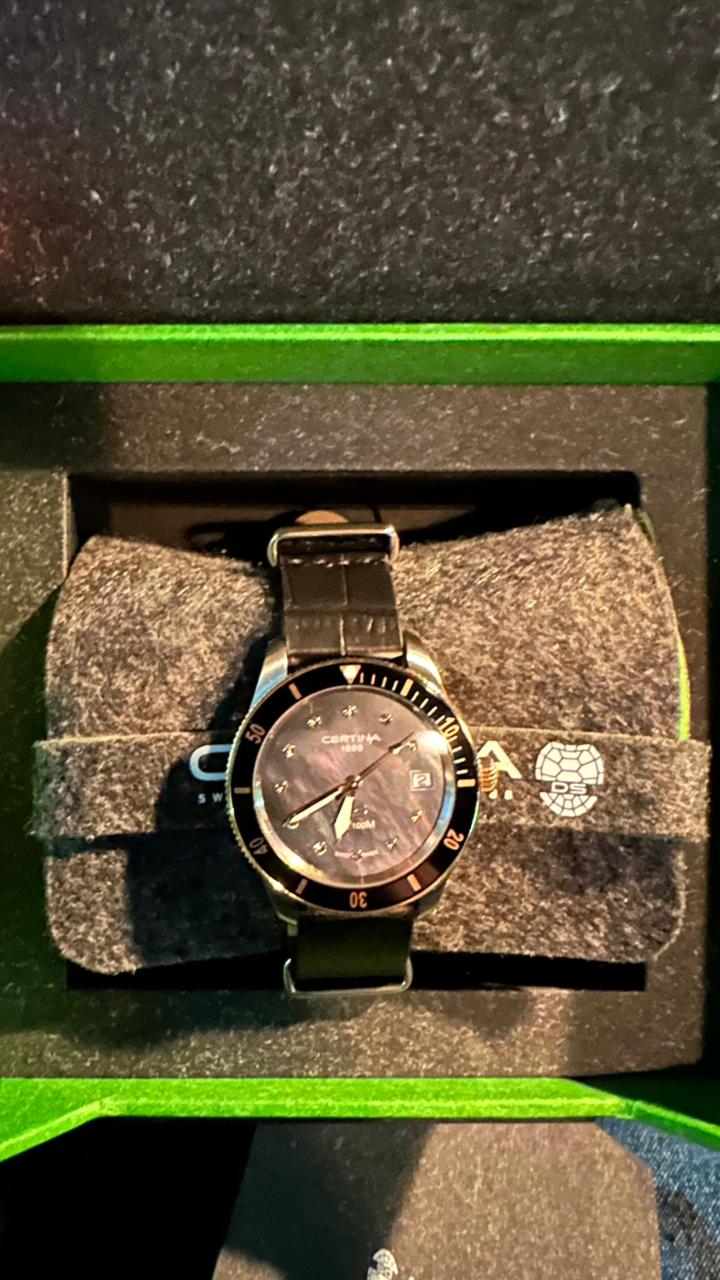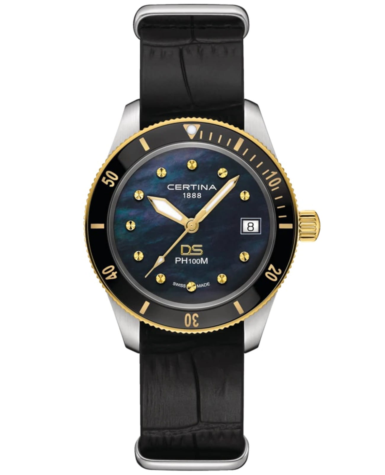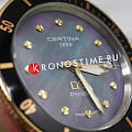 Certina DS PH100M Lady C044.210.26.051.00 – часы для поклонников ярких аксессуаров. Корпус изготовлен из высококачественной нержавеющей стали 316L с . Под твердым сапфировым стекломСапфировое стеклоПрочный и надёжный материал из кристалла сапфира синтетического происхождения, характеризующийся особой твёрдостью и устойчивостью к царапинам и повреждениям. с антибликовым покрытиемАнтибликовое покрытиеСлой оксида металла в 0,13-0,3 микрон, благодаря которому стекло часов не бликует и не отражает свет. Антибликовое покрытие уменьшает отражение света в 10 раз, обеспечивая отличную читаемость показателей циферблата. находится бирюзовый циферблат на котором вы найдете окошко даты в положении 3 часа, а также маркировку, покрытую люминесцентным покрытиемЛюминесцентное покрытиеПозволяет считывать показания времени в темноте. Производители наносят на стрелки, часовые индексы, безель или поверхность циферблата светонакопительный состав, дающий холодное свечение. Super-LumiNova. Класс водозащиты: 100 метров, позволит плавать, нырять и заниматься другими водными видами спорта. Кожаный ремешок. БезельБезельВнешний ободок, закрепляющий стекло. В спортивных часах так называется поворотное кольцо с делениями на циферблате, выполняет роль таймера – замеряет отрезки времени на шкале. Неподвижный безель – элемент декора. Однонаправленно вращающийся безель на дайверских часах позволяет фиксировать моменты погружения и выныривания на поверхность. из нержавеющей стали с PVD-покрытиемPVDУльтратонкое покрытие наносится в технике вакуумного напыления, сочетает в себе нитрид титана особой прочности со слоем золота или оксида хрома. Несёт в себе декоративную или защитную функцию.