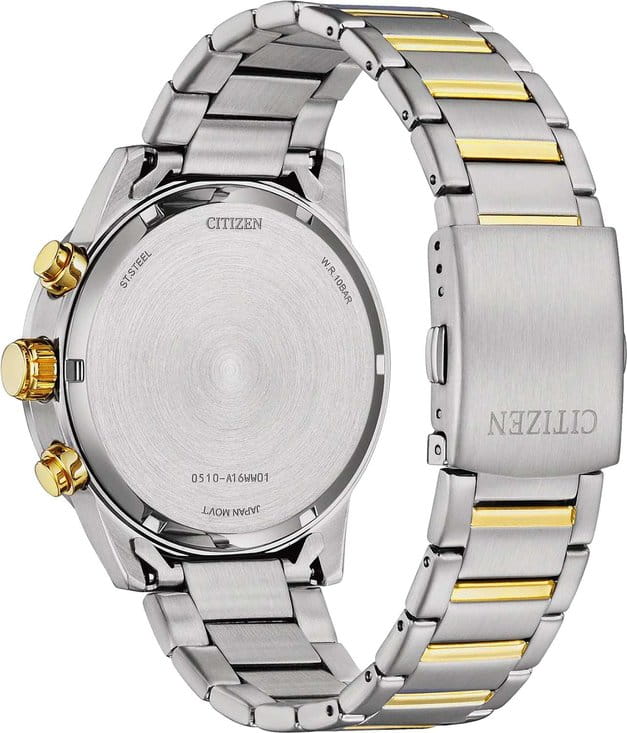 Citizen Chronograph AN3684-59L часы-хронографХронографФункция позволяет измерять отрезки времени с особой точностью: часы, минуты, секунды. Верным признаком хронографа является наличие на циферблате 3 дополнительных окошек-счётчиков. с секундомеромСекундомерСекундоме́р — прибор, способный измерять интервалы времени с точностью до долей секунды. спортивного дизайна с высоким уровнем водозащиты. Корпус из нержавеющей стали диаметром 44 мм идеально сбалансирован. Минеральное стеклоМинеральное стеклоМинеральное стекло представляет собой искусственно выращенный минерал кварца. Такое стекло отличается особой устойчивостью к повреждениям и царапинам. Уступает по некоторым качествам сапфировому стеклу. обеспечивает отличную защиту циферблата от царапин. Часы работают на основе кварцевого механизма. Стальной браслет на раскладной застёжкеРаскладная застёжкаТакой тип застёжки используется только на браслетах из металла. Она никогда не раскрывается полностью, происходит разделение на 2 и более частей. Раскладывающая застёжка снизит вероятность потери часов к минимуму. с частичным IP-покрытиемIP-покрытиеМетод ионного напыления. Демонстрирует повышенную устойчивость к истиранию, окислению и химическим веществам. Под воздействием высокого давления и температуры около 1500°C молекулы металла надёжно соединяются с частицами корпуса часов. идеально дополняют дизайн часов, обеспечивая комфортное ношение. Стрелки и метки на циферблате имеют люминесцентное покрытиеЛюминесцентное покрытиеПозволяет считывать показания времени в темноте. Производители наносят на стрелки, часовые индексы, безель или поверхность циферблата светонакопительный состав, дающий холодное свечение. позволяющее легко определять время даже в темноте. БезельБезельВнешний ободок, закрепляющий стекло. В спортивных часах так называется поворотное кольцо с делениями на циферблате, выполняет роль таймера – замеряет отрезки времени на шкале. Неподвижный безель – элемент декора. Однонаправленно вращающийся безель на дайверских часах позволяет фиксировать моменты погружения и выныривания на поверхность. с IP-покрытиемIP-покрытиеМетод ионного напыления. Демонстрирует повышенную устойчивость к истиранию, окислению и химическим веществам. Под воздействием высокого давления и температуры около 1500°C молекулы металла надёжно соединяются с частицами корпуса часов. и шкалой тахиметраТахиметрРазмеченная шкала, располагается на ободке или безеле часов. Тахиметр позволяет рассчитать скорость на определённом участке пути, расстояние измеряется в километрах или милях.. Секундомер с точностью 1с и временем измерения 12ч отображается центральной стрелкой. Окошко даты находится в положении 3 часа. Циферблат с метками в виде штрихов выполнен по технологии Sunray (солнечные лучи). Часы обладают впечатляющей водонепроницаемостью до 100WR, что делает их идеальными для повседневной носки.