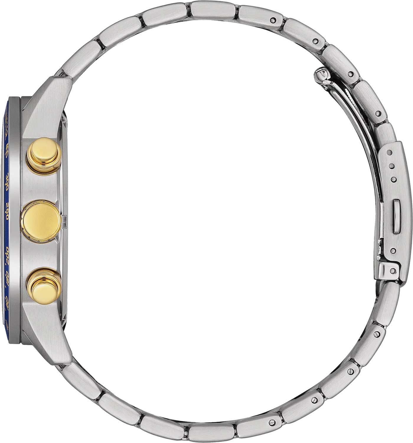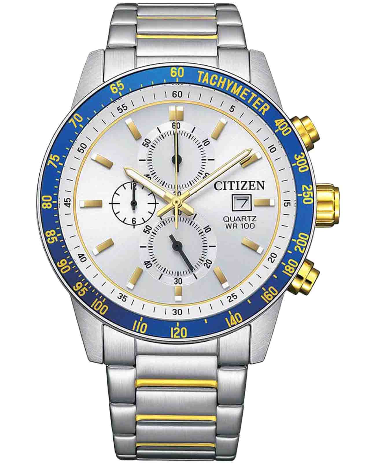 Citizen Chronograph AN3686-53A часы-хронографХронографФункция позволяет измерять отрезки времени с особой точностью: часы, минуты, секунды. Верным признаком хронографа является наличие на циферблате 3 дополнительных окошек-счётчиков. с секундомеромСекундомерСекундоме́р — прибор, способный измерять интервалы времени с точностью до долей секунды. спортивного дизайна с высоким уровнем водозащиты. Корпус из нержавеющей стали диаметром 44 мм идеально сбалансирован. Минеральное стеклоМинеральное стеклоМинеральное стекло представляет собой искусственно выращенный минерал кварца. Такое стекло отличается особой устойчивостью к повреждениям и царапинам. Уступает по некоторым качествам сапфировому стеклу. обеспечивает отличную защиту циферблата от царапин. Часы работают на основе кварцевого механизма. Стальной браслет на раскладной застёжкеРаскладная застёжкаТакой тип застёжки используется только на браслетах из металла. Она никогда не раскрывается полностью, происходит разделение на 2 и более частей. Раскладывающая застёжка снизит вероятность потери часов к минимуму. с частичным IP-покрытиемIP-покрытиеМетод ионного напыления. Демонстрирует повышенную устойчивость к истиранию, окислению и химическим веществам. Под воздействием высокого давления и температуры около 1500°C молекулы металла надёжно соединяются с частицами корпуса часов. идеально дополняют дизайн часов, обеспечивая комфортное ношение. Стрелки и метки на циферблате имеют люминесцентное покрытиеЛюминесцентное покрытиеПозволяет считывать показания времени в темноте. Производители наносят на стрелки, часовые индексы, безель или поверхность циферблата светонакопительный состав, дающий холодное свечение. позволяющее легко определять время даже в темноте. БезельБезельВнешний ободок, закрепляющий стекло. В спортивных часах так называется поворотное кольцо с делениями на циферблате, выполняет роль таймера – замеряет отрезки времени на шкале. Неподвижный безель – элемент декора. Однонаправленно вращающийся безель на дайверских часах позволяет фиксировать моменты погружения и выныривания на поверхность. с IP-покрытиемIP-покрытиеМетод ионного напыления. Демонстрирует повышенную устойчивость к истиранию, окислению и химическим веществам. Под воздействием высокого давления и температуры около 1500°C молекулы металла надёжно соединяются с частицами корпуса часов. и шкалой тахиметраТахиметрРазмеченная шкала, располагается на ободке или безеле часов. Тахиметр позволяет рассчитать скорость на определённом участке пути, расстояние измеряется в километрах или милях.. Секундомер с точностью 1с и временем измерения 12ч отображается центральной стрелкой. Окошко даты находится в положении 3 часа. Циферблат с метками в виде штрихов выполнен по технологии Sunray (солнечные лучи). Часы обладают впечатляющей водонепроницаемостью до 100WR, что делает их идеальными для повседневной носки.