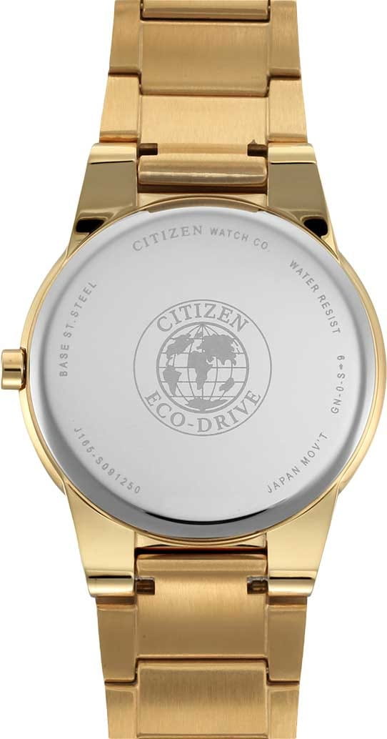 Часы Citizen AU1062-56E представлены в строгом и элегантном дизайне, идеально подходящем для делового стиля. Корпус и браслет выполнены из высококачественной нержавеющей стали с износостойким золотистым IP-покрытиемIP-покрытиеМетод ионного напыления. Демонстрирует повышенную устойчивость к истиранию, окислению и химическим веществам. Под воздействием высокого давления и температуры около 1500°C молекулы металла надёжно соединяются с частицами корпуса часов., что обеспечивает долговечность и презентабельный внешний вид. Черный циферблат с минималистичным оформлением подчеркивает сдержанность модели, а окошко даты удобно расположено в положении 3 часа. Надежный кварцевый механизм Citizen J165 работает на инновационной системе Eco-Drive, которая питается от солнечной энергии и не требует замены батарейки, обеспечивая запас хода до 270 дней. Часы оснащены функцией индикации заряда EOLEOLПредставляет собой систему, уведомляющую владельца часов о необходимости замены элемента питания. За 2 недели до полного разряда батарейки секундная стрелка перестаёт ходить чётко и начинает перепрыгивать на 3-4 деления. и защитой от перезаряда. Минеральное стеклоМинеральное стеклоМинеральное стекло представляет собой искусственно выращенный минерал кварца. Такое стекло отличается особой устойчивостью к повреждениям и царапинам. Уступает по некоторым качествам сапфировому стеклу. надежно защищает циферблат от случайных повреждений, а водозащита уровня WR30 позволяет не снимать часы при случайном контакте с водой. Диаметр корпуса составляет 40 мм, что делает модель универсальным аксессуаром для любого случая. Раскладная застёжкаРаскладная застёжкаТакой тип застёжки используется только на браслетах из металла. Она никогда не раскрывается полностью, происходит разделение на 2 и более частей. Раскладывающая застёжка снизит вероятность потери часов к минимуму. на браслете обеспечивает дополнительный комфорт при носке.