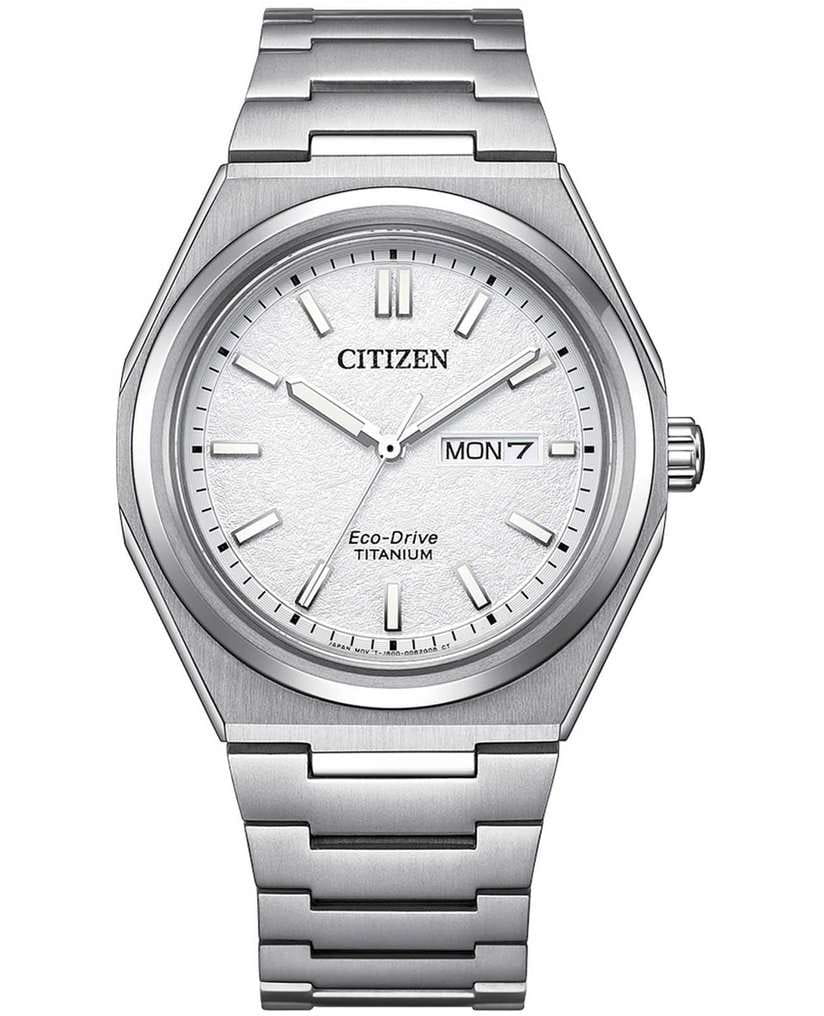 Часы Citizen AW0130-85A сочетают в себе японское качество, современный стиль и передовые технологии. Корпус и браслет модели выполнены из суперлегкого титана, что обеспечивает легкость и комфорт в носке, а также высокую прочность и устойчивость к коррозии. Диаметр корпуса составляет 39,5 мм, толщина — 9,8 мм, вес часов — всего около 91 грамма. Белый текстурный циферблат украшен центральными часовой, минутной и секундной стрелками, а также апертурой даты и дня недели в положении 3 часа. Надежный кварцевый механизм Citizen J800 работает на инновационной системе Eco-Drive, питается от солнечной энергии и не требует замены батарейки, обеспечивая запас хода до 240 дней. Часы оснащены функцией индикации уровня заряда EOLEOLПредставляет собой систему, уведомляющую владельца часов о необходимости замены элемента питания. За 2 недели до полного разряда батарейки секундная стрелка перестаёт ходить чётко и начинает перепрыгивать на 3-4 деления., что позволяет всегда быть уверенным в их работе. Сапфировое стеклоСапфировое стеклоПрочный и надёжный материал из кристалла сапфира синтетического происхождения, характеризующийся особой твёрдостью и устойчивостью к царапинам и повреждениям. надежно защищает циферблат от царапин, а водозащита 100 метров позволяет использовать часы во время плавания без погружения. Стрелки и часовые метки с люминесцентным покрытиемЛюминесцентное покрытиеПозволяет считывать показания времени в темноте. Производители наносят на стрелки, часовые индексы, безель или поверхность циферблата светонакопительный состав, дающий холодное свечение. обеспечивают отличную читаемость даже в темноте. Раскладная застёжкаРаскладная застёжкаТакой тип застёжки используется только на браслетах из металла. Она никогда не раскрывается полностью, происходит разделение на 2 и более частей. Раскладывающая застёжка снизит вероятность потери часов к минимуму. на титановом браслете обеспечивает дополнительное удобство.