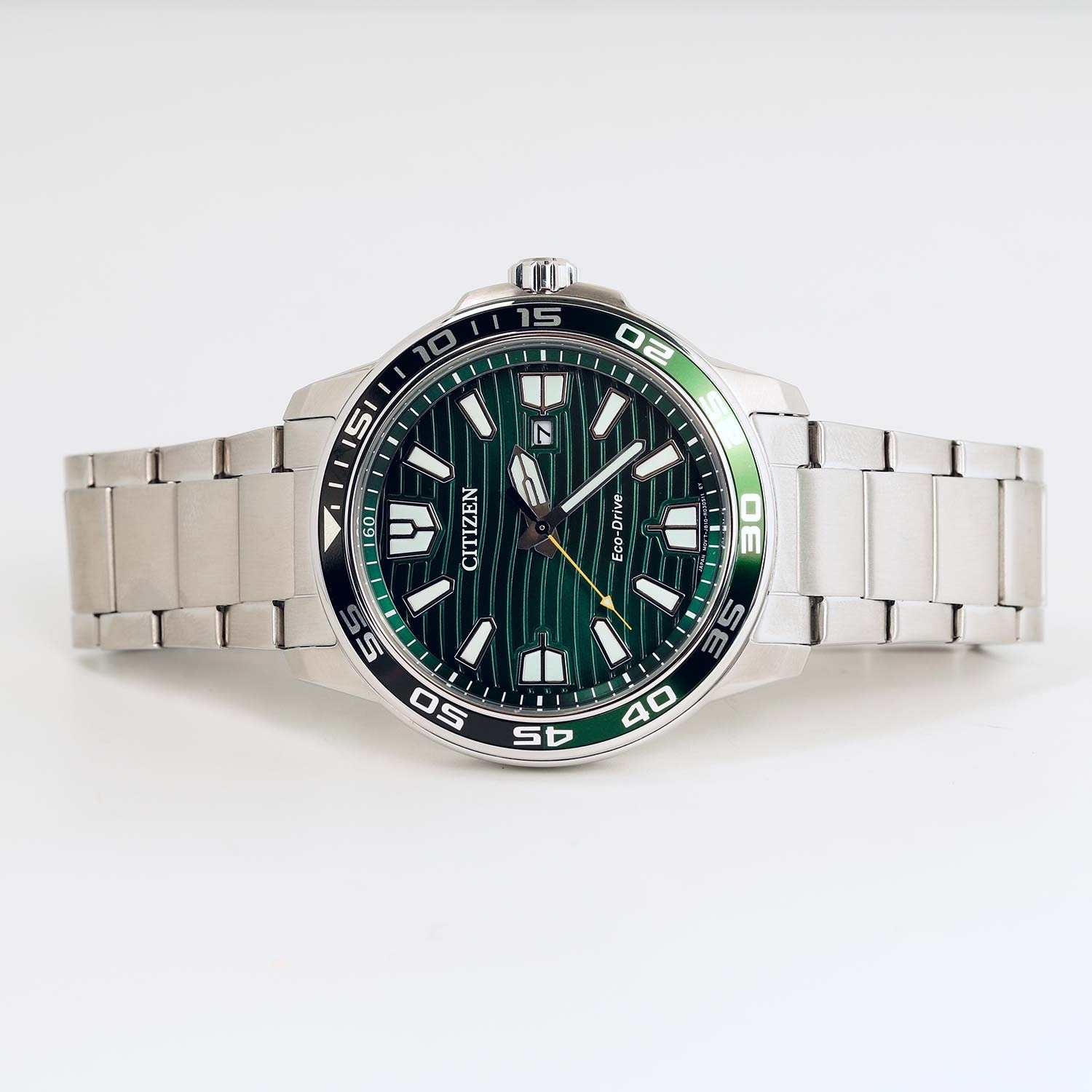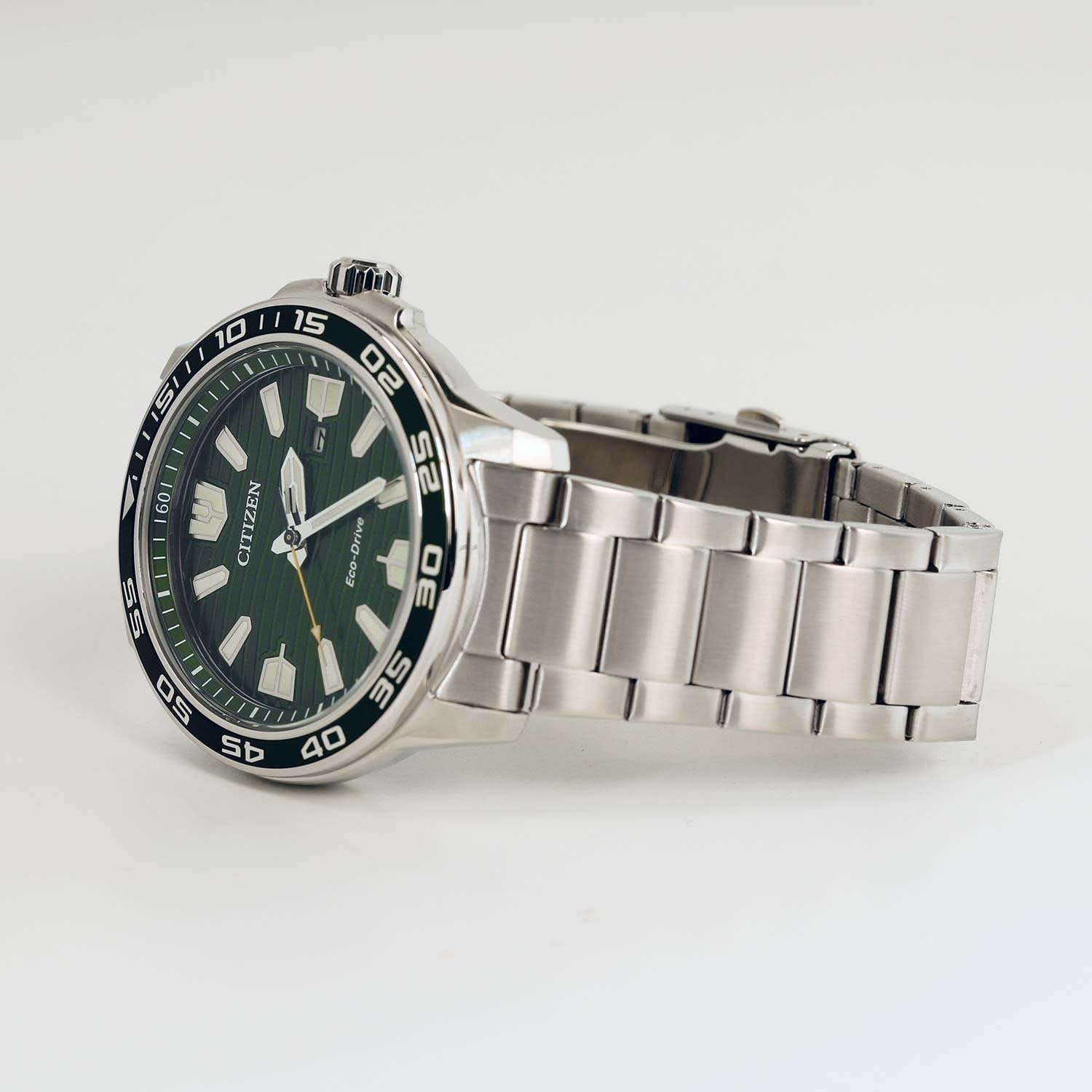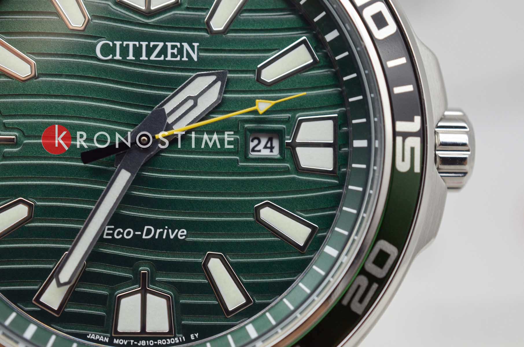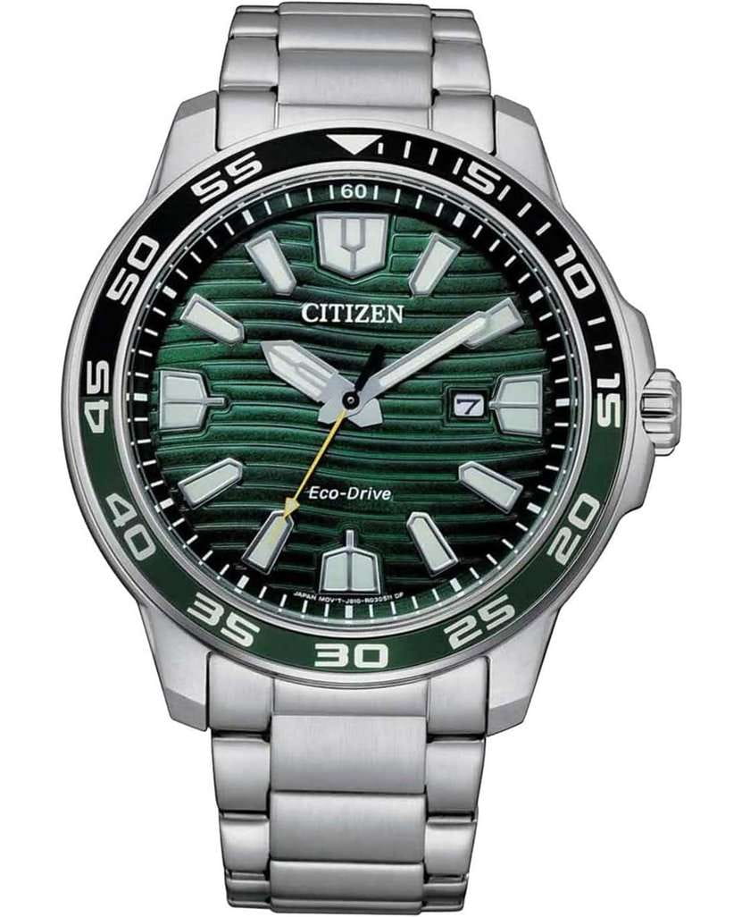 Часы Citizen AW1526-89X – это стильная и надежная модель японского производства, идеально подходящая для активного образа жизни. Корпус выполнен из высококачественной нержавеющей стали, в то время как на безельБезельВнешний ободок, закрепляющий стекло. В спортивных часах так называется поворотное кольцо с делениями на циферблате, выполняет роль таймера – замеряет отрезки времени на шкале. Неподвижный безель – элемент декора. Однонаправленно вращающийся безель на дайверских часах позволяет фиксировать моменты погружения и выныривания на поверхность. нанесено черное и зеленое PVD-покрытиеPVDУльтратонкое покрытие наносится в технике вакуумного напыления, сочетает в себе нитрид титана особой прочности со слоем золота или оксида хрома. Несёт в себе декоративную или защитную функцию., браслет также стальной. Зеленый циферблат украшен метками в виде штрихов и оснащен календарем с окошком даты. Защиту от повреждений обеспечивает прочное минеральное стеклоМинеральное стеклоМинеральное стекло представляет собой искусственно выращенный минерал кварца. Такое стекло отличается особой устойчивостью к повреждениям и царапинам. Уступает по некоторым качествам сапфировому стеклу., а водонепроницаемость до 100 метров позволяет не снимать часы во время плавания и занятий спортом. Внутри установлен надежный кварцевый механизм Citizen J810 с инновационной системой Eco-Drive, которая питается от солнечной энергии и не требует замены батарейки, обеспечивая запас хода до 240 дней. Стрелки и часовые метки с люминесцентным покрытиемЛюминесцентное покрытиеПозволяет считывать показания времени в темноте. Производители наносят на стрелки, часовые индексы, безель или поверхность циферблата светонакопительный состав, дающий холодное свечение. обеспечивают отличную читаемость даже в темноте. Функция индикации заряда EOLEOLПредставляет собой систему, уведомляющую владельца часов о необходимости замены элемента питания. За 2 недели до полного разряда батарейки секундная стрелка перестаёт ходить чётко и начинает перепрыгивать на 3-4 деления. подскажет, когда потребуется подзарядка. Корпус диаметром 44.8 мм, толщина 10,8 мм, ширина браслета 22 мм, вес модели составляет 162 грамма. Завинчивающаяся задняя крышка украшена фирменной гравировкой Eco-Drive, а заводная головка оснащена защитой. Надежная раскладная застёжкаРаскладная застёжкаТакой тип застёжки используется только на браслетах из металла. Она никогда не раскрывается полностью, происходит разделение на 2 и более частей. Раскладывающая застёжка снизит вероятность потери часов к минимуму. браслета с системой блокировки гарантирует комфортное и безопасное ношение.
