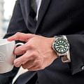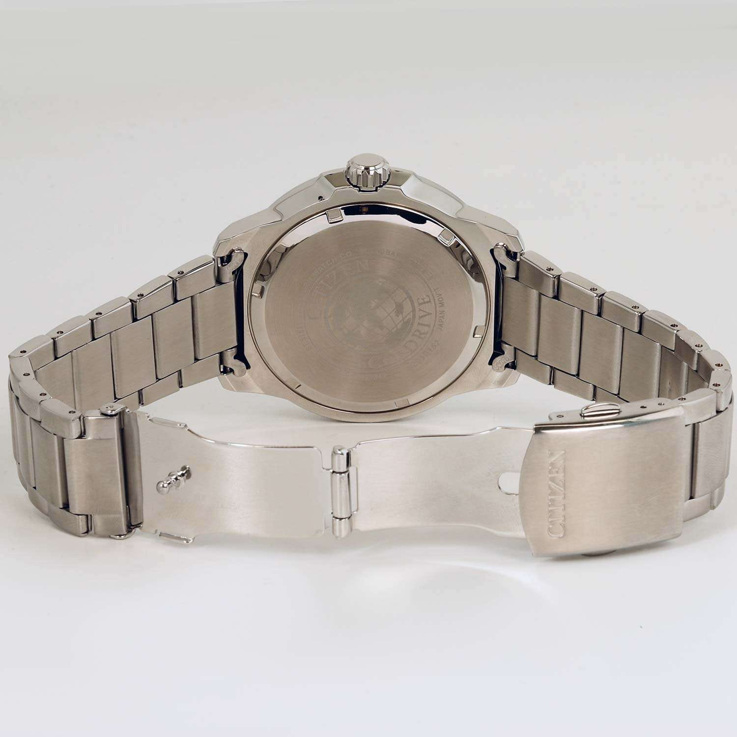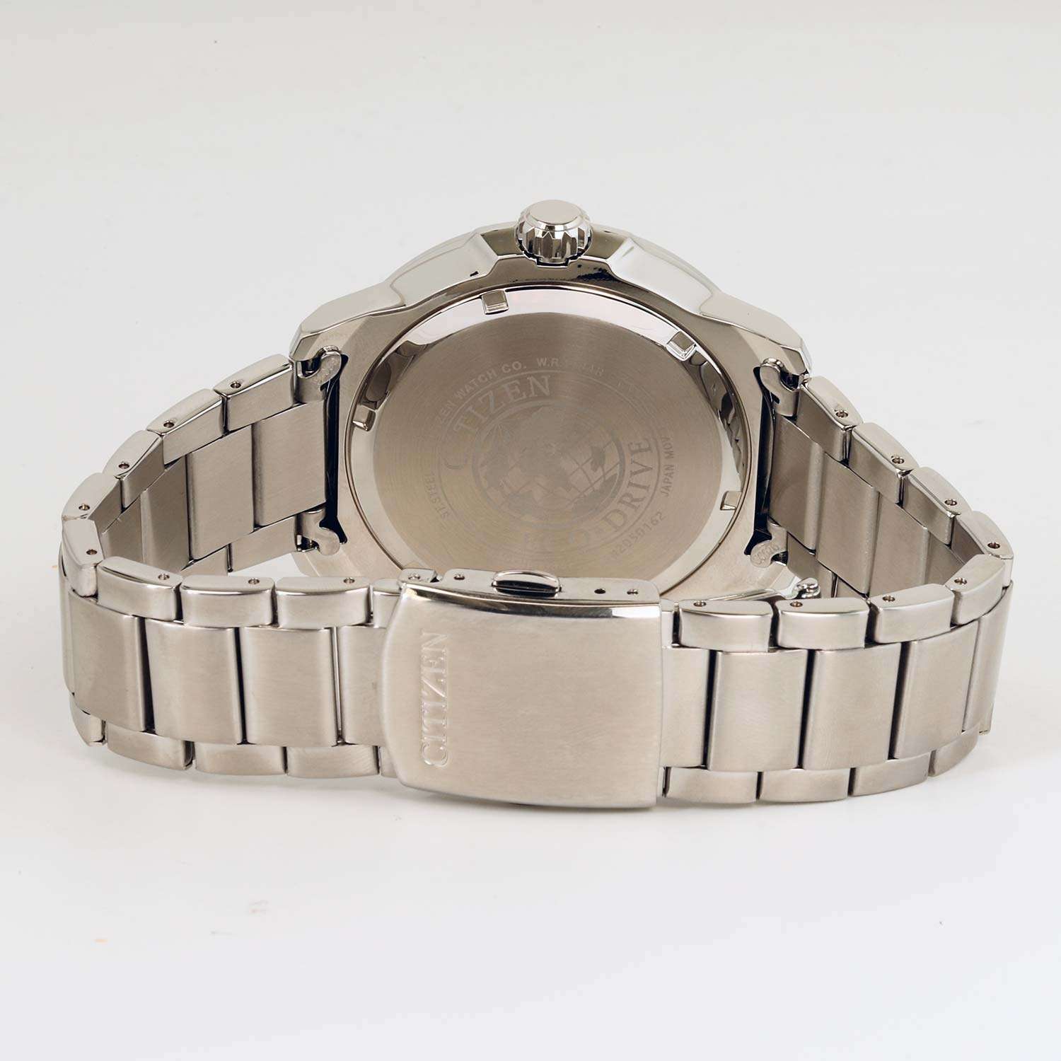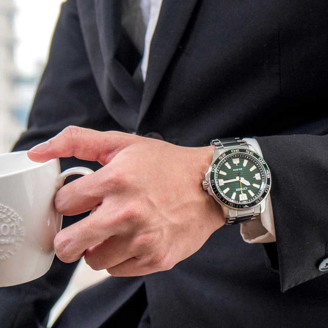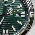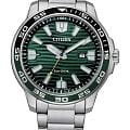 Часы Citizen AW1526-89X – это стильная и надежная модель японского производства, идеально подходящая для активного образа жизни. Корпус выполнен из высококачественной нержавеющей стали, в то время как на безельБезельВнешний ободок, закрепляющий стекло. В спортивных часах так называется поворотное кольцо с делениями на циферблате, выполняет роль таймера – замеряет отрезки времени на шкале. Неподвижный безель – элемент декора. Однонаправленно вращающийся безель на дайверских часах позволяет фиксировать моменты погружения и выныривания на поверхность. нанесено черное и зеленое PVD-покрытиеPVDУльтратонкое покрытие наносится в технике вакуумного напыления, сочетает в себе нитрид титана особой прочности со слоем золота или оксида хрома. Несёт в себе декоративную или защитную функцию., браслет также стальной. Зеленый циферблат украшен метками в виде штрихов и оснащен календарем с окошком даты. Защиту от повреждений обеспечивает прочное минеральное стеклоМинеральное стеклоМинеральное стекло представляет собой искусственно выращенный минерал кварца. Такое стекло отличается особой устойчивостью к повреждениям и царапинам. Уступает по некоторым качествам сапфировому стеклу., а водонепроницаемость до 100 метров позволяет не снимать часы во время плавания и занятий спортом. Внутри установлен надежный кварцевый механизм Citizen J810 с инновационной системой Eco-Drive, которая питается от солнечной энергии и не требует замены батарейки, обеспечивая запас хода до 240 дней. Стрелки и часовые метки с люминесцентным покрытиемЛюминесцентное покрытиеПозволяет считывать показания времени в темноте. Производители наносят на стрелки, часовые индексы, безель или поверхность циферблата светонакопительный состав, дающий холодное свечение. обеспечивают отличную читаемость даже в темноте. Функция индикации заряда EOLEOLПредставляет собой систему, уведомляющую владельца часов о необходимости замены элемента питания. За 2 недели до полного разряда батарейки секундная стрелка перестаёт ходить чётко и начинает перепрыгивать на 3-4 деления. подскажет, когда потребуется подзарядка. Корпус диаметром 44.8 мм, толщина 10,8 мм, ширина браслета 22 мм, вес модели составляет 162 грамма. Завинчивающаяся задняя крышка украшена фирменной гравировкой Eco-Drive, а заводная головка оснащена защитой. Надежная раскладная застёжкаРаскладная застёжкаТакой тип застёжки используется только на браслетах из металла. Она никогда не раскрывается полностью, происходит разделение на 2 и более частей. Раскладывающая застёжка снизит вероятность потери часов к минимуму. браслета с системой блокировки гарантирует комфортное и безопасное ношение.