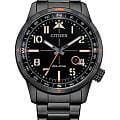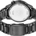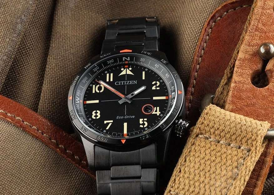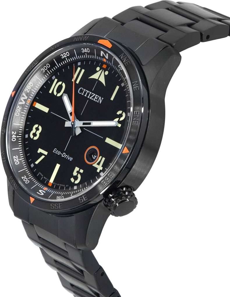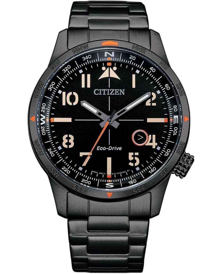 Citizen BM7555-83E — современные японские часы, сочетающие стильный дизайн и передовые технологии для динамичной жизни. Корпус и браслет выполнены из прочной нержавеющей стали с износостойким черным IP-покрытиеIP-покрытиеМетод ионного напыления. Демонстрирует повышенную устойчивость к истиранию, окислению и химическим веществам. Под воздействием высокого давления и температуры около 1500°C молекулы металла надёжно соединяются с частицами корпуса часов., что обеспечивает долговечность и презентабельный внешний вид. На безельБезельВнешний ободок, закрепляющий стекло. В спортивных часах так называется поворотное кольцо с делениями на циферблате, выполняет роль таймера – замеряет отрезки времени на шкале. Неподвижный безель – элемент декора. Однонаправленно вращающийся безель на дайверских часах позволяет фиксировать моменты погружения и выныривания на поверхность. нанесены оранжевые стрелки компаса. Кварцевый механизм Citizen E111 работает по инновационной системе Eco-Drive: часы питаются от солнечной энергии и не требуют замены батарейки, а запас хода составляет до 180 дней. Черный циферблат украшен метками в виде штрихов и арабских цифр, а также оснащён шкалой компаса для дополнительного удобства. Стрелки с люминесцентным покрытиемЛюминесцентное покрытиеПозволяет считывать показания времени в темноте. Производители наносят на стрелки, часовые индексы, безель или поверхность циферблата светонакопительный состав, дающий холодное свечение. позволяют легко определять время даже в темноте. Окно даты и рифленая заводная головка расположены в районе 4 часов для максимального комфорта в использовании. Минеральное стеклоМинеральное стеклоМинеральное стекло представляет собой искусственно выращенный минерал кварца. Такое стекло отличается особой устойчивостью к повреждениям и царапинам. Уступает по некоторым качествам сапфировому стеклу. защищает циферблат от царапин и повреждений. Водозащита до 100 метров делает модель отличным выбором для активного образа жизни. Удобная раскладная застёжкаРаскладная застёжкаТакой тип застёжки используется только на браслетах из металла. Она никогда не раскрывается полностью, происходит разделение на 2 и более частей. Раскладывающая застёжка снизит вероятность потери часов к минимуму. обеспечивает надежную фиксацию на запястье. Размер корпуса составляет 43 мм, толщина — 11,5 мм, вес — 145 грамм, что придаёт часам солидный и современный вид.