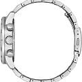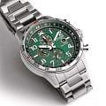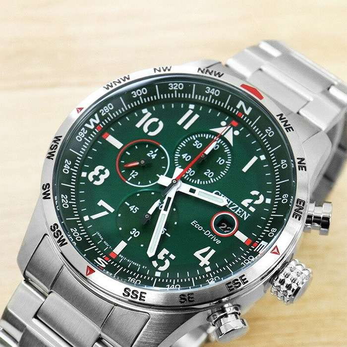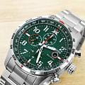 Citizen CA0791-81X — это стильные многофункциональные спортивные часы, сочетающие японское качество, современные технологии и надежность. Корпус и браслет выполнены из прочной нержавеющей стали, что обеспечивает долговечность и элегантный внешний вид, а зеленый циферблат с метками в виде штрихов и арабских цифр подчеркивает динамичный и современный характер модели. На безельБезельВнешний ободок, закрепляющий стекло. В спортивных часах так называется поворотное кольцо с делениями на циферблате, выполняет роль таймера – замеряет отрезки времени на шкале. Неподвижный безель – элемент декора. Однонаправленно вращающийся безель на дайверских часах позволяет фиксировать моменты погружения и выныривания на поверхность. нанесены красные стрелки компаса. Часы оснащены кварцевым механизмом Citizen B612 с инновационной системой Eco-Drive, работающей на солнечной энергии, что позволяет забыть о регулярной замене батарейки и обеспечивает запас хода до 210 дней. Присутствует функция индикации заряда EOLEOLПредставляет собой систему, уведомляющую владельца часов о необходимости замены элемента питания. За 2 недели до полного разряда батарейки секундная стрелка перестаёт ходить чётко и начинает перепрыгивать на 3-4 деления. и система предотвращения перезарядки. Модель оснащена хронографомХронографФункция позволяет измерять отрезки времени с особой точностью: часы, минуты, секунды. Верным признаком хронографа является наличие на циферблате 3 дополнительных окошек-счётчиков. с секундомеромСекундомерСекундоме́р — прибор, способный измерять интервалы времени с точностью до долей секунды., измеряющим время с точностью до 1/5 секунды и максимальной продолжительностью замера до 1 часа, а также поддерживает отображение времени в 12- и 24-часовом формате. Стрелки с люминесцентным покрытиемЛюминесцентное покрытиеПозволяет считывать показания времени в темноте. Производители наносят на стрелки, часовые индексы, безель или поверхность циферблата светонакопительный состав, дающий холодное свечение. обеспечивают отличную читаемость времени даже в темное время суток. Прочное минеральное стеклоМинеральное стеклоМинеральное стекло представляет собой искусственно выращенный минерал кварца. Такое стекло отличается особой устойчивостью к повреждениям и царапинам. Уступает по некоторым качествам сапфировому стеклу. надежно защищает циферблат от царапин и повреждений, а водозащита 100WR позволяет не снимать часы во время плавания и активного отдыха. Удобное окошко даты расположено в положении 3 часа, а браслет снабжен раскладной застёжкойРаскладная застёжкаТакой тип застёжки используется только на браслетах из металла. Она никогда не раскрывается полностью, происходит разделение на 2 и более частей. Раскладывающая застёжка снизит вероятность потери часов к минимуму. для комфортного ношения. Диаметр корпуса составляет 43 мм, толщина 12,8 мм, а вес — 153 г, что делает эту модель отличным выбором для ценителей функциональности и современного стиля.