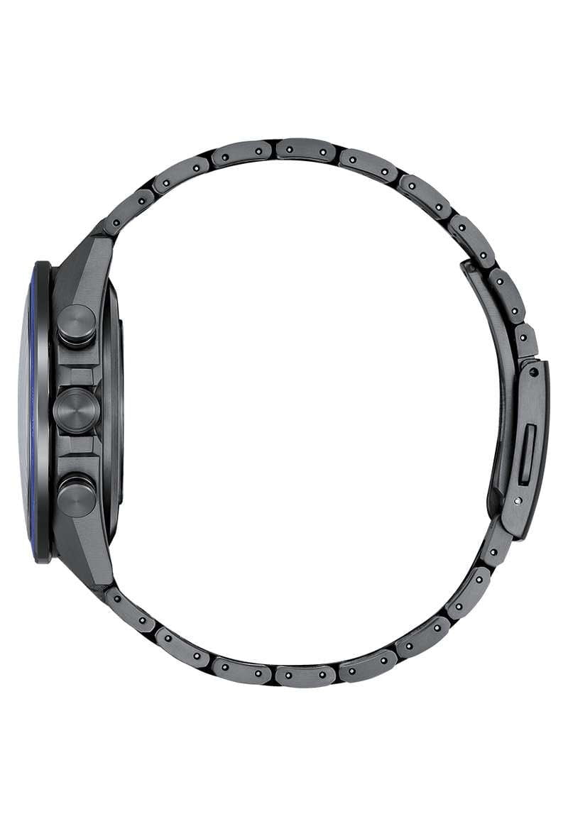 с самой высокой в мире скоростью приема сигнала — всего за 3 секунды, что обеспечивает точную настройку времени в любой точке мира. Среди дополнительных функций — мировое времяМировое время Полезное часовое усложнение, отображающее время в основных городах и известных областях по всему миру, оно связано с часовыми поясами, удобно для путешественников и бизнесменов. в 27 городах (40 часовых зон), индикатор летнего времени, второй часовой поясВторой часовой поясФункция, позволяющая отображать время двух часовых поясов одновременно. (GMTGMTОтображение времени второго часового пояса.Такая функция особенно актуальна для путешественников и бизнесменов,которые общаются с людьми из разных стран,теперь вы всегда будете знать,какой час у вашего партнёра или близкого человека.), будильник, вечный календарьВечный календарьКлассическое часовое усложнение, представляющее собой календарь, рассчитанный на несколько лет вперёд (стандартно – до 2099 года). Определяет текущую дату, день недели, месяц., апертура даты между 4 и 5 часами, отображение дня недели на малом циферблате, 12/24-часовой формат времени, а также секундомерСекундомерСекундоме́р — прибор, способный измерять интервалы времени с точностью до долей секунды. с точностью 1/2 секунды и пределом измерения до 24 часов. Сапфировое стеклоСапфировое стеклоПрочный и надёжный материал из кристалла сапфира синтетического происхождения, характеризующийся особой твёрдостью и устойчивостью к царапинам и повреждениям. с антибликовым покрытиемАнтибликовое покрытиеСлой оксида металла в 0,13-0,3 микрон, благодаря которому стекло часов не бликует и не отражает свет. Антибликовое покрытие уменьшает отражение света в 10 раз, обеспечивая отличную читаемость показателей циферблата. надежно защищает циферблат от царапин. Заводная головка снабжена защитой, а титановый браслет с DLC-покрытиемDLC-покрытиеDiamond like carbon - одно из лучших видов покрытия, представляющее собой углерод с алмазными свойствами. На поверхность материала наносятся распавшиеся молекулы углерода, превращающиеся в плёнку из алмазоподобных связей, которая перенимает твёрдость алмаза. и раскладывающейся застежкой обеспечивает комфорт и безопасность при носке. Водостойкость уровня WR 100 позволяет использовать часы при плавании и снорклинге. Вес модели составляет всего 110 г.