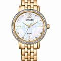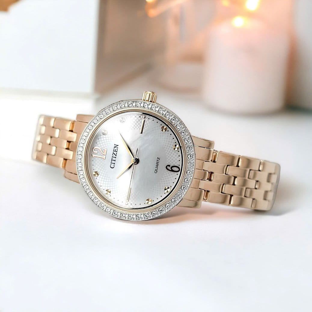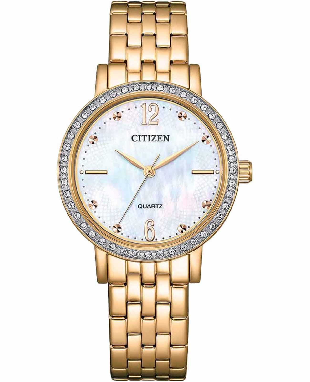 Часы Citizen EL3103-57D представляют собой элегантную модель, выполненную в Японии, сочетающую в себе современные технологии и утончённый дизайн. Корпус и браслет изготовлены из прочной нержавеющей стали с золотистым IP-покрытиемIP-покрытиеМетод ионного напыления. Демонстрирует повышенную устойчивость к истиранию, окислению и химическим веществам. Под воздействием высокого давления и температуры около 1500°C молекулы металла надёжно соединяются с частицами корпуса часов., что обеспечивает долговечность и привлекательный внешний вид. Диаметр корпуса составляет 31 мм, а толщина — всего 7 мм, что делает часы изящными и аккуратными на запястье. Особое внимание привлекает безельБезельВнешний ободок, закрепляющий стекло. В спортивных часах так называется поворотное кольцо с делениями на циферблате, выполняет роль таймера – замеряет отрезки времени на шкале. Неподвижный безель – элемент декора. Однонаправленно вращающийся безель на дайверских часах позволяет фиксировать моменты погружения и выныривания на поверхность., украшенный мерцающими кристаллами, которые придают часам особый шарм и изысканность. Надёжный кварцевый механизм гарантирует точность хода, а водозащита уровня WR 50 позволяет не снимать часы при мытье рук или во время дождя. Перламутровый циферблат украшен часовыми индексами в виде точек и цифр, а также оснащён центральными стрелками часов, минут и секунд для удобного считывания времени и кристаллами. Минеральное стеклоМинеральное стеклоМинеральное стекло представляет собой искусственно выращенный минерал кварца. Такое стекло отличается особой устойчивостью к повреждениям и царапинам. Уступает по некоторым качествам сапфировому стеклу. устойчиво к появлению мелких царапин, сохраняя прозрачность и презентабельный вид. Стальной браслет с золотистым IP-покрытиемIP-покрытиеМетод ионного напыления. Демонстрирует повышенную устойчивость к истиранию, окислению и химическим веществам. Под воздействием высокого давления и температуры около 1500°C молекулы металла надёжно соединяются с частицами корпуса часов. и раскладной застёжкойРаскладная застёжкаТакой тип застёжки используется только на браслетах из металла. Она никогда не раскрывается полностью, происходит разделение на 2 и более частей. Раскладывающая застёжка снизит вероятность потери часов к минимуму. надежно фиксирует часы на запястье, обеспечивая комфорт при ежедневном ношении.
