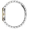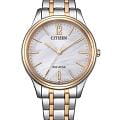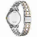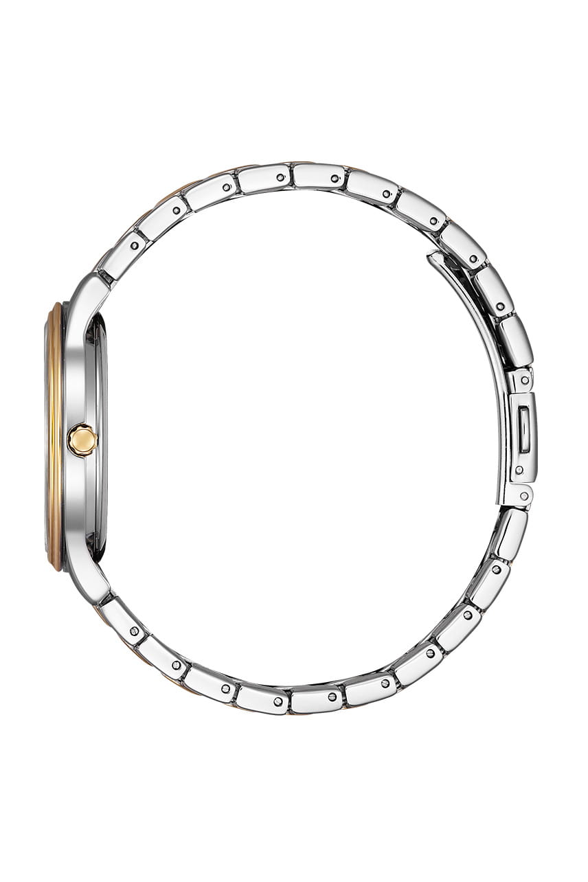 Часы Citizen EM0416-78A – это элегантная модель, сочетающая современный дизайн и передовые технологии. Корпус выполнен из высококачественной нержавеющей стали, а безельБезельВнешний ободок, закрепляющий стекло. В спортивных часах так называется поворотное кольцо с делениями на циферблате, выполняет роль таймера – замеряет отрезки времени на шкале. Неподвижный безель – элемент декора. Однонаправленно вращающийся безель на дайверских часах позволяет фиксировать моменты погружения и выныривания на поверхность. и браслет (частично) с золотистым IP-покрытиемIP-покрытиеМетод ионного напыления. Демонстрирует повышенную устойчивость к истиранию, окислению и химическим веществам. Под воздействием высокого давления и температуры около 1500°C молекулы металла надёжно соединяются с частицами корпуса часов., что придаёт аксессуару утончённость и стиль. Прочное минеральное стеклоМинеральное стеклоМинеральное стекло представляет собой искусственно выращенный минерал кварца. Такое стекло отличается особой устойчивостью к повреждениям и царапинам. Уступает по некоторым качествам сапфировому стеклу. защищает циферблат от царапин, Белый циферблат украшен арабскими цифрами и штрихами, а также защищён прочным кристаллическим стеклом. Диаметр корпуса составляет 34 мм, высота – 7 мм, что обеспечивает комфортную посадку на запястье. Часы оснащены кварцевым механизмом калибра Citizen E031 с технологией Eco-Drive, благодаря которой подзарядка происходит от любого источника света, а запас хода достигает 180 дней без дополнительной подзарядки. Функция индикатора разряда батареи напомнит о необходимости подзарядки, а точность хода составляет ±15 секунд в месяц. Водонепроницаемость до 5 бар позволяет не беспокоиться о случайных брызгах и дождях. Браслет оснащён удобной раскладной застёжкойРаскладная застёжкаТакой тип застёжки используется только на браслетах из металла. Она никогда не раскрывается полностью, происходит разделение на 2 и более частей. Раскладывающая застёжка снизит вероятность потери часов к минимуму.. Лёгкий вес – всего 70 грамм – делает часы практически незаметными на руке, а длина браслета 330 мм позволит подогнать его под нужный размер. аксессуаром на каждый день.