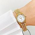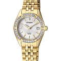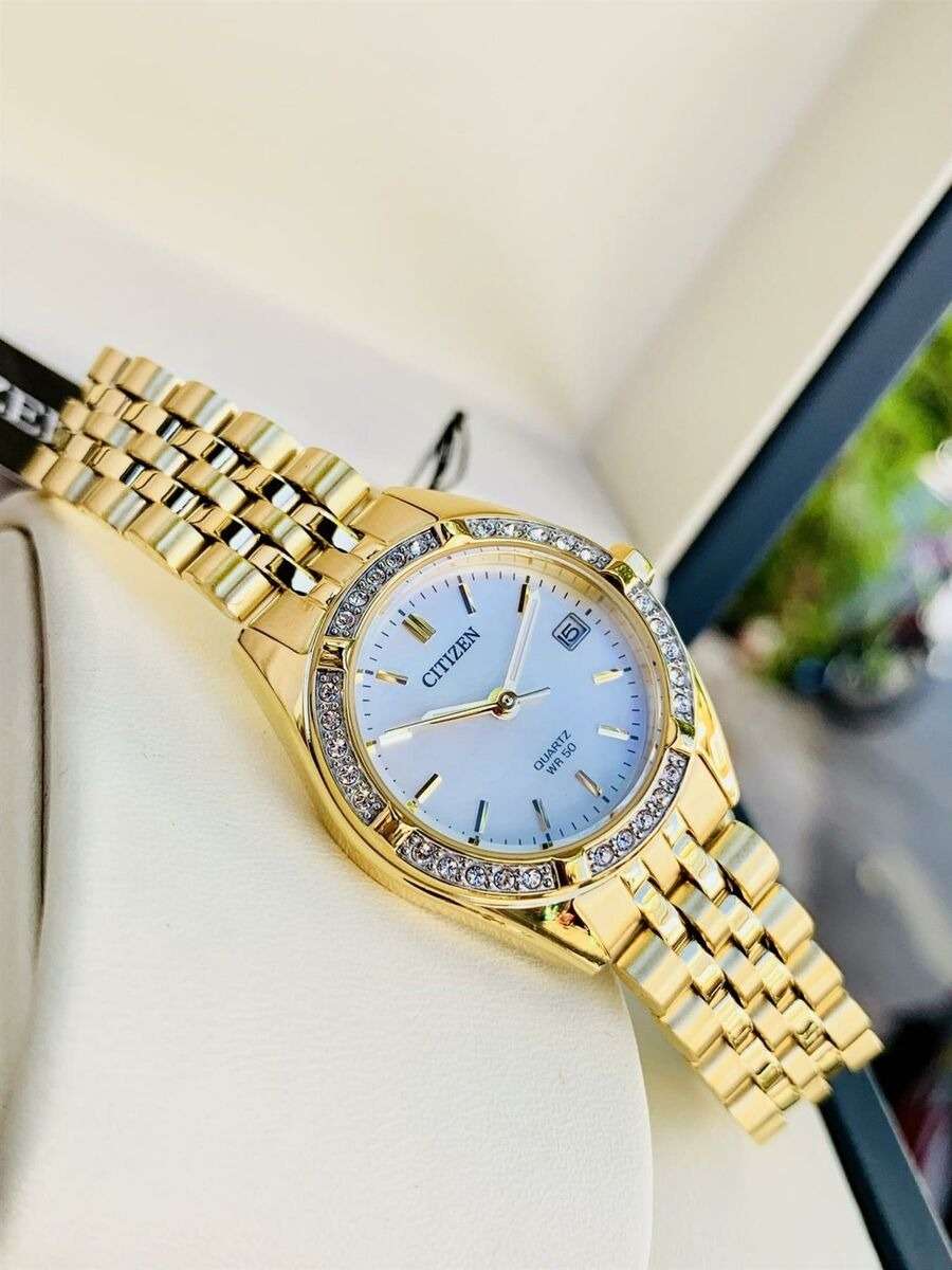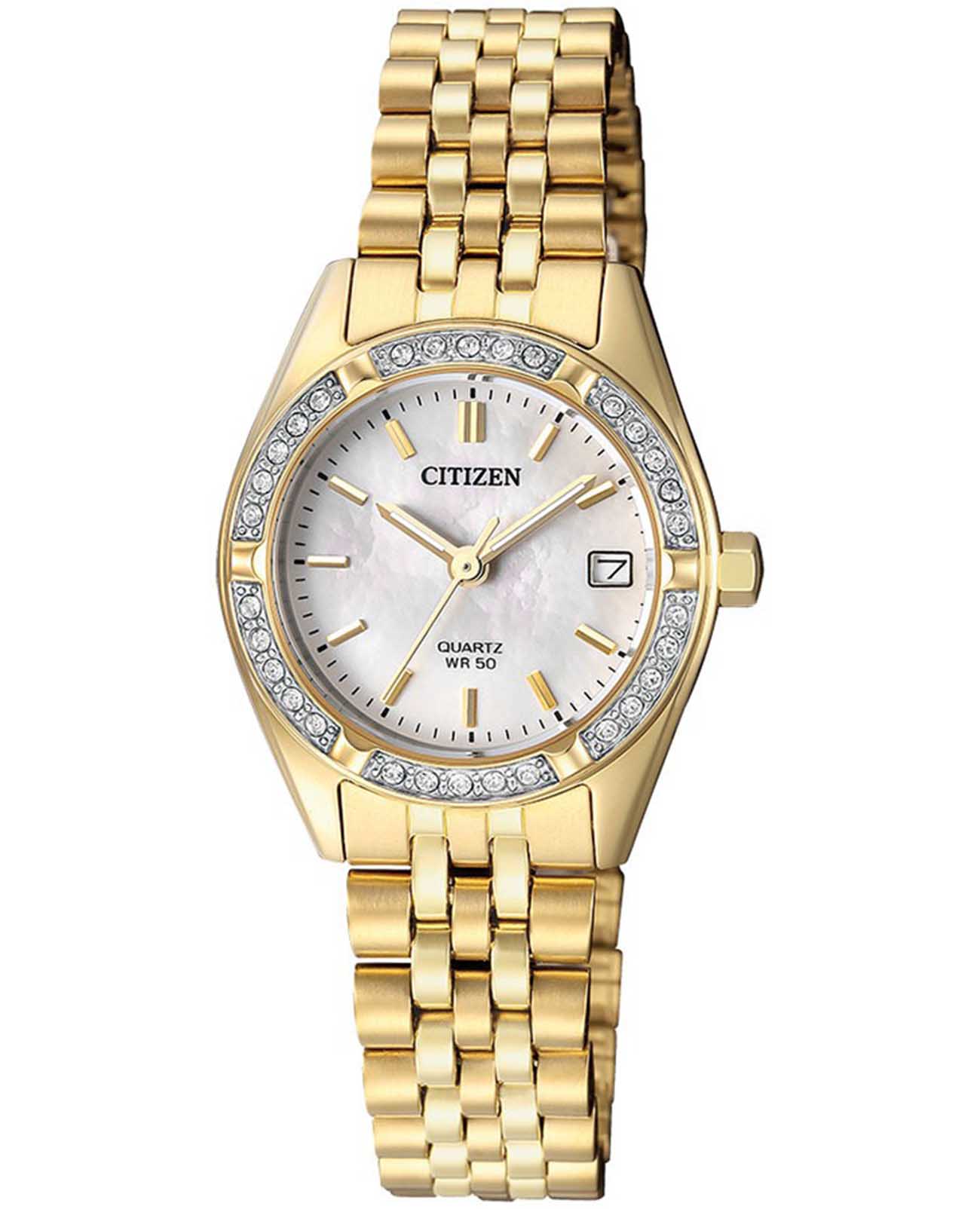 Элегантные часы Citizen EU6062-50D сочетают в себе изысканный дизайн и надежность японского качества. Круглый корпус диаметром 26 мм изготовлен из нержавеющей стали с PVD-покрытиемPVDУльтратонкое покрытие наносится в технике вакуумного напыления, сочетает в себе нитрид титана особой прочности со слоем золота или оксида хрома. Несёт в себе декоративную или защитную функцию. цвета желтого золота и украшен сверкающими кристаллами по безелюБезельВнешний ободок, закрепляющий стекло. В спортивных часах так называется поворотное кольцо с делениями на циферблате, выполняет роль таймера – замеряет отрезки времени на шкале. Неподвижный безель – элемент декора. Однонаправленно вращающийся безель на дайверских часах позволяет фиксировать моменты погружения и выныривания на поверхность., что придает модели утонченный вид. Перламутровый циферблат дополнен центральными стрелками и апертурой даты на позиции 3 часов. Минеральное стеклоМинеральное стеклоМинеральное стекло представляет собой искусственно выращенный минерал кварца. Такое стекло отличается особой устойчивостью к повреждениям и царапинам. Уступает по некоторым качествам сапфировому стеклу. защищает от мелких повреждений, а стальной браслет с раскладной застёжкойРаскладная застёжкаТакой тип застёжки используется только на браслетах из металла. Она никогда не раскрывается полностью, происходит разделение на 2 и более частей. Раскладывающая застёжка снизит вероятность потери часов к минимуму. обеспечивает комфортную посадку. Стрелки с люминесцентным покрытиемЛюминесцентное покрытиеПозволяет считывать показания времени в темноте. Производители наносят на стрелки, часовые индексы, безель или поверхность циферблата светонакопительный состав, дающий холодное свечение. для отличной читаемости в любое время суток. Благодаря водостойкости WR 50 часы подходят для повседневного ношения, включая мытье рук и дождь.