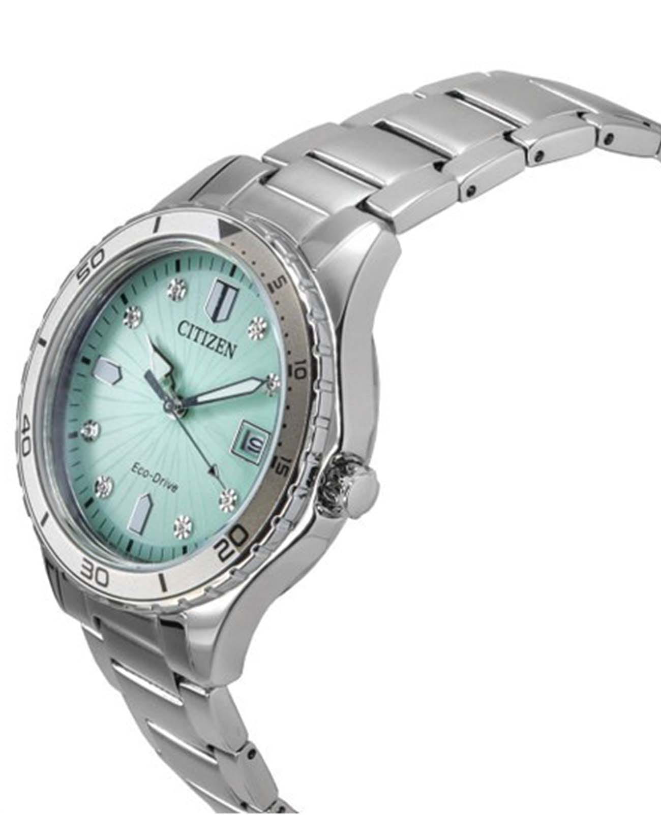 Элегантные женские часы Citizen FE6170-88L станут ярким акцентом любого образа благодаря современному дизайну и высокому качеству исполнения. Корпус диаметром 36,8 мм и толщиной 9,8 мм выполнен из прочной нержавеющей стали, что гарантирует долговечность и надежность. Особое внимание привлекает бирюзовый циферблат, украшенный сверкающими кристаллами в виде часовых меток, что придаёт модели утончённый и изысканный вид. Кварцевый механизм с калибром Citizen J810 работает на инновационной системе Eco-Drive — часы заряжаются от любого источника света, обеспечивая запас хода до 240 дней и не требуя замены батарейки. Функции индикации заряда EOLEOLПредставляет собой систему, уведомляющую владельца часов о необходимости замены элемента питания. За 2 недели до полного разряда батарейки секундная стрелка перестаёт ходить чётко и начинает перепрыгивать на 3-4 деления.  и предотвращения перезарядки обеспечивают дополнительное удобство в использовании. Окошко даты расположено на отметке 3 часа для быстрого просмотра текущего числа. Прочное минеральное стеклоМинеральное стеклоМинеральное стекло представляет собой искусственно выращенный минерал кварца. Такое стекло отличается особой устойчивостью к повреждениям и царапинам. Уступает по некоторым качествам сапфировому стеклу. защищает циферблат от случайных царапин, а водозащита уровня 100WR позволяет использовать часы даже во время плавания. А безельБезельВнешний ободок, закрепляющий стекло. В спортивных часах так называется поворотное кольцо с делениями на циферблате, выполняет роль таймера – замеряет отрезки времени на шкале. Неподвижный безель – элемент декора. Однонаправленно вращающийся безель на дайверских часах позволяет фиксировать моменты погружения и выныривания на поверхность. часов с частичным IP-покрытиемIP-покрытиеМетод ионного напыления. Демонстрирует повышенную устойчивость к истиранию, окислению и химическим веществам. Под воздействием высокого давления и температуры около 1500°C молекулы металла надёжно соединяются с частицами корпуса часов. вращается в одном направлении. Стрелки с люминесцентным покрытиемЛюминесцентное покрытиеПозволяет считывать показания времени в темноте. Производители наносят на стрелки, часовые индексы, безель или поверхность циферблата светонакопительный состав, дающий холодное свечение. обеспечивают отличную читаемость времени даже в темное время суток. Стальной браслет с раскладной застёжкойРаскладная застёжкаТакой тип застёжки используется только на браслетах из металла. Она никогда не раскрывается полностью, происходит разделение на 2 и более частей. Раскладывающая застёжка снизит вероятность потери часов к минимуму. обеспечивает комфортное и надежное крепление на запястье. Модель произведена в Японии и отличается высоким стандартом качества.