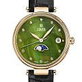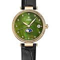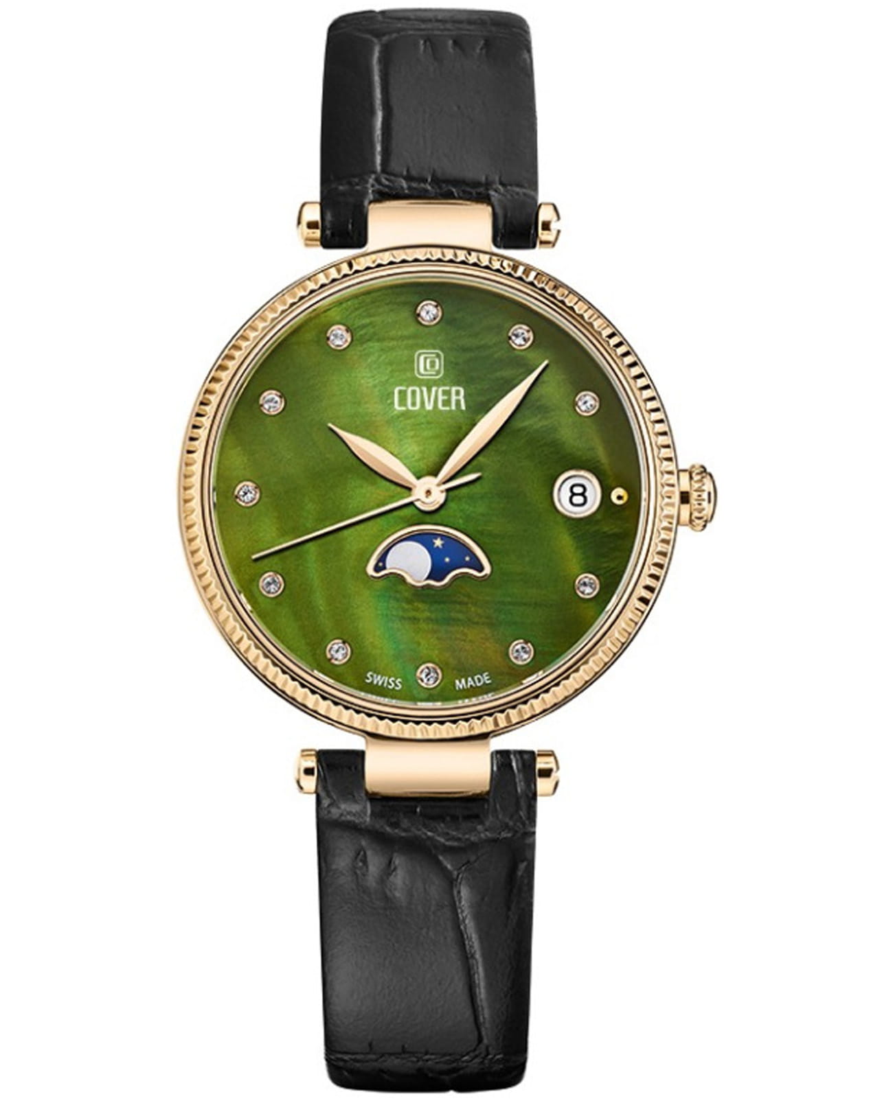 Женские часы Cover Moon CO196.06 - это аксессуар для истинных леди из коллекции Fly Me To The Moon. Часы работают на кварцевом калибре ETA. Циферблат выполнен в зеленом перламутровом исполнении, создавая игру света при каждом движении запястья, и украшен 11 кристаллами Swarovski, которые служат часовым индикатором, добавляя блики света и роскоши. Кроме того, модель имеет окно фаз Луны на «6 часах» и апертуру даты на «3 часах», что делает ее функциональной для ценителей астрономических усложнений. Часы имеют 32-миллиметровый корпус из нержавеющей стали с PVD-покрытиемPVDУльтратонкое покрытие наносится в технике вакуумного напыления, сочетает в себе нитрид титана особой прочности со слоем золота или оксида хрома. Несёт в себе декоративную или защитную функцию. цвета желтого золота.  Водонепроницаемость часов достигает 5 атмосфер (WR 50), что позволяет использовать их в повседневной жизни, однако не рекомендуется для контакта с водой во время плавания или дайвинга. Маркировка «Swiss Made». Кожаный ремешок на классической застежке.