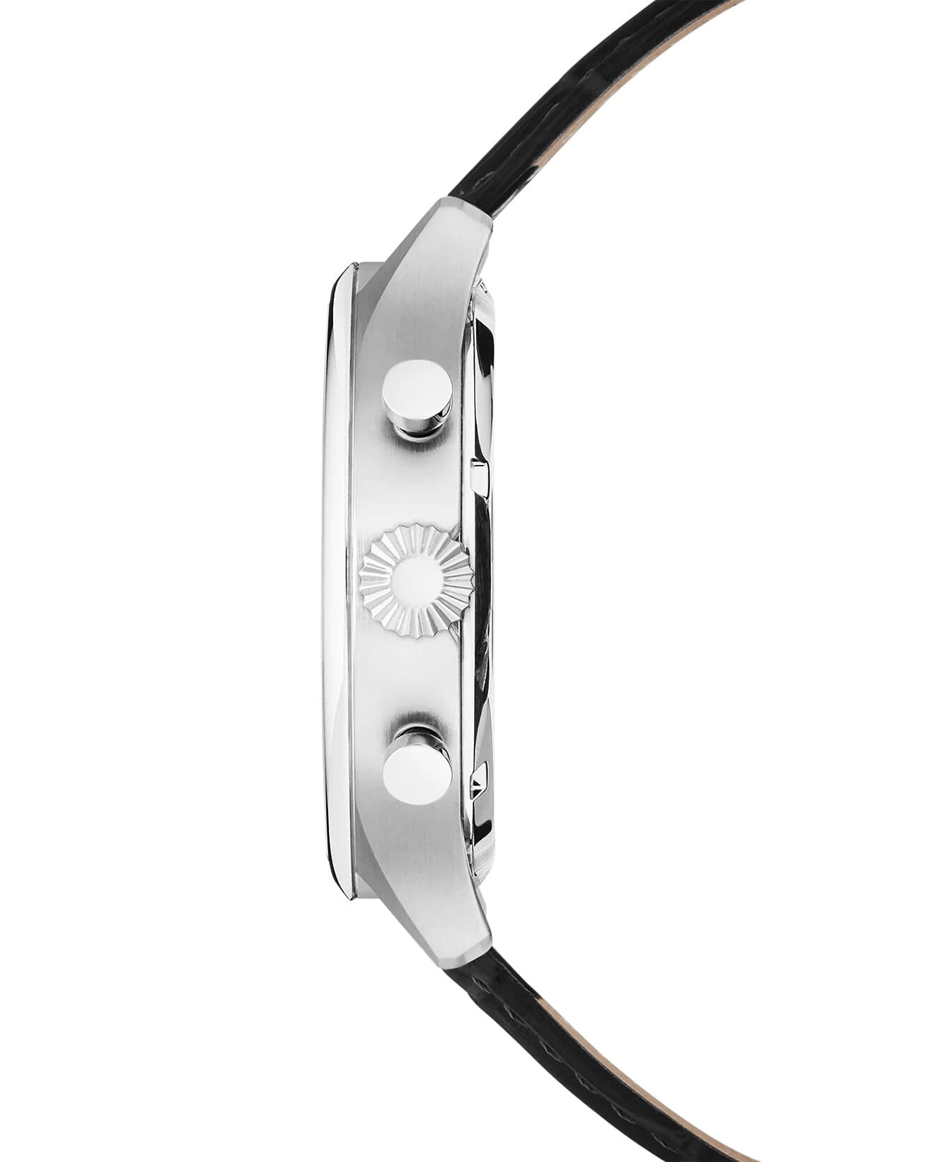 Мужские наручные часы-хронографХронографФункция позволяет измерять отрезки времени с особой точностью: часы, минуты, секунды. Верным признаком хронографа является наличие на циферблате 3 дополнительных окошек-счётчиков. Cover CO192.04 из коллекции Chapman Chronograph сочетают в себе классический дизайн и надежность современных технологий. Модель обладает круглым корпусом диаметром 42,5 мм, изготовленным из нержавеющей стали, что обеспечивает высокую устойчивость к внешним воздействиям. Браслет выполнен из натуральной кожи с классической застежкой, гарантирующей комфортное ношение. Серебристый циферблат оснащен окном даты на «6 часах» и функцией секундомераСекундомерСекундоме́р — прибор, способный измерять интервалы времени с точностью до долей секунды., делая модель практичной для повседневного использования. Для защиты используется минеральное стеклоМинеральное стеклоМинеральное стекло представляет собой искусственно выращенный минерал кварца. Такое стекло отличается особой устойчивостью к повреждениям и царапинам. Уступает по некоторым качествам сапфировому стеклу., обеспечивающее прочную защиту от царапин. Часы работают на кварцевом механизме Ronda 5021.D с 10 драгоценными камнями, что гарантирует точное время без необходимости подзаводки. Водонепроницаемость часов достигает 10 атмосфер (100 метров), что позволяет использовать их во время плавания и других водных видов спорта, однако не рекомендуется для глубоководного дайвинга.