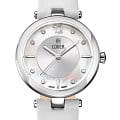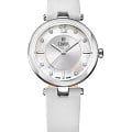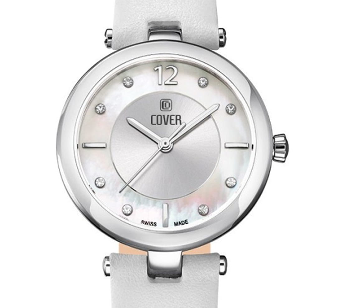 Женственные коктейльные часы COVER CO193.07 из коллекции Amelia работают на кварцевом калибре ETA. Циферблат имеет центральную область серебристого цвета с узором Sunray и белую перламутровую периферийную часть, которые защищены минеральным стекломМинеральное стеклоМинеральное стекло представляет собой искусственно выращенный минерал кварца. Такое стекло отличается особой устойчивостью к повреждениям и царапинам. Уступает по некоторым качествам сапфировому стеклу. с сапфировым напылением. В качестве часовых меток используются 8 кристаллов Swarovski, а также 3 накладных индекса и арабская цифра «12». Корпус из нержавеющей стали диаметром 32 мм с широким полированным безелемБезельВнешний ободок, закрепляющий стекло. В спортивных часах так называется поворотное кольцо с делениями на циферблате, выполняет роль таймера – замеряет отрезки времени на шкале. Неподвижный безель – элемент декора. Однонаправленно вращающийся безель на дайверских часах позволяет фиксировать моменты погружения и выныривания на поверхность.. Часы комплектуются белым кожаным ремешком на стандартной застёжке и имеют маркировку «Swiss Made».