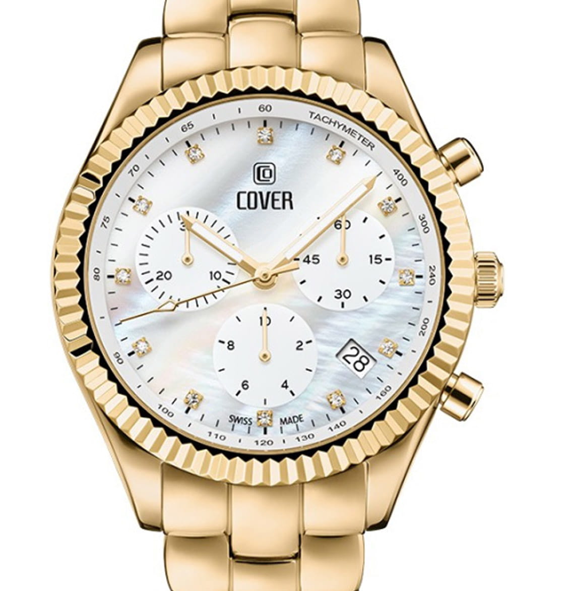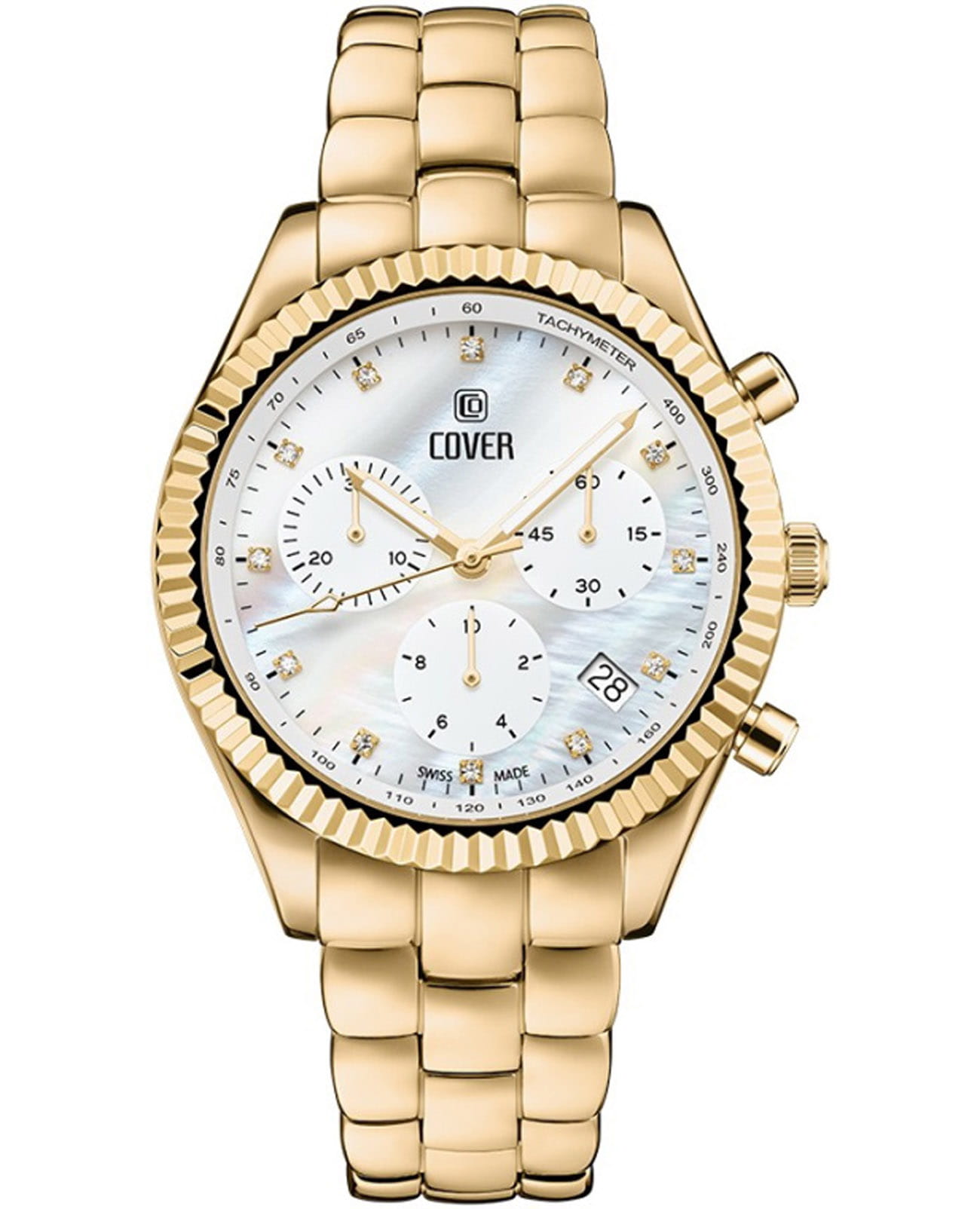 Элегантные женские часы Cover CO207.03 в спортивном стиле из коллекции Valentina Chronograph — это идеальное сочетание утонченности и функциональности. Оснащенные кварцевым механизмом с модулем хронографа Ronda 5040.D, они обеспечивают точность и надежность в каждом моменте. Молочно-белый перламутровый циферблат с 12 кристаллами Swarovski в роли часовых индексов придает часам изысканный вид, а три накопителя на «3», «6» и «9 часах» вместе с апертурой даты между «4» и «5 часами» добавляют функциональности. ТахиметрТахиметрРазмеченная шкала, располагается на ободке или безеле часов. Тахиметр позволяет рассчитать скорость на определённом участке пути, расстояние измеряется в километрах или милях.ическая шкала на внутреннем фланце позволяет легко отслеживать скорость, что делает эти часы не только стильными, но и практичными. Корпус диаметром 38 мм с рифленым ,безелемБезельВнешний ободок, закрепляющий стекло. В спортивных часах так называется поворотное кольцо с делениями на циферблате, выполняет роль таймера – замеряет отрезки времени на шкале. Неподвижный безель – элемент декора. Однонаправленно вращающийся безель на дайверских часах позволяет фиксировать моменты погружения и выныривания на поверхность. и интегрированный браслет из нержавеющей стали с PVD-покрытиемPVDУльтратонкое покрытие наносится в технике вакуумного напыления, сочетает в себе нитрид титана особой прочности со слоем золота или оксида хрома. Несёт в себе декоративную или защитную функцию. подчеркивают современный дизайн и комфорт при ношении. С водонепроницаемостью до 50 м и сапфировым стекломСапфировое стеклоПрочный и надёжный материал из кристалла сапфира синтетического происхождения, характеризующийся особой твёрдостью и устойчивостью к царапинам и повреждениям., эти часы идеально подходят для активных женщин. Маркировка «Swiss Made» гарантирует высокое качество и долговечность. Гарантия на изделие составляет 2 года, что подтверждает надежность и уверенность в вашем выборе. Эти часы станут не только прекрасным дополнением к вашему образу, но и верным спутником в повседневной жизни.