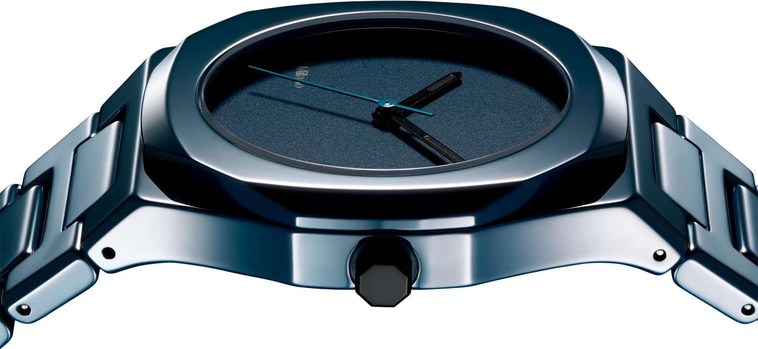 Часы D1 Milano Ceramic CEBU03 Pure Blue – роскошный аксессуар для современных женщин и мужчин. Кварцевые часы с корпусом из синей керамики. Циферблат лаконичный, без индексов, с надписью бренда. Стрелки из латуни с люминесцентным покрытиемЛюминесцентное покрытиеПозволяет считывать показания времени в темноте. Производители наносят на стрелки, часовые индексы, безель или поверхность циферблата светонакопительный состав, дающий холодное свечение.. Стальная задняя крышка с PVD-покрытиемPVDУльтратонкое покрытие наносится в технике вакуумного напыления, сочетает в себе нитрид титана особой прочности со слоем золота или оксида хрома. Несёт в себе декоративную или защитную функцию. закреплена на 4 винтах, что обеспечивает надежность конструкции. Керамический браслет с застёжкой «бабочка» с кнопкамиЗастёжка "бабочка"Такой вид застёжки дополняется предохранителями, помогающими избежать случайного раскрытия браслета. Обладают изящным исполнением. . Часы сочетают в себе классический дизайн и современные технологии производства.