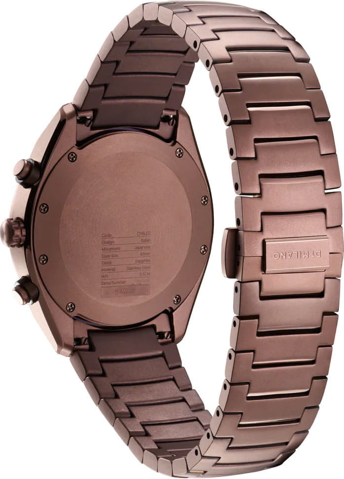 Элегантный хронограф D1 Milano Cronografo Essential Brown CHBJ22 - идеальное воплощение мужественности и стиля. Этот многофункциональный аксессуар оснащен секундомером, тахиметромТахиметрРазмеченная шкала, располагается на ободке или безеле часов. Тахиметр позволяет рассчитать скорость на определённом участке пути, расстояние измеряется в километрах или милях.. что делает его незаменимым компаньоном в повседневной жизни. Изысканный корпус и браслет выполнены из стали с PVD-покрытиемPVDУльтратонкое покрытие наносится в технике вакуумного напыления, сочетает в себе нитрид титана особой прочности со слоем золота или оксида хрома. Несёт в себе декоративную или защитную функцию.. Минималистичный дизайн циферблата, защищенный прочным сапфировым стекломСапфировое стеклоПрочный и надёжный материал из кристалла сапфира синтетического происхождения, характеризующийся особой твёрдостью и устойчивостью к царапинам и повреждениям. с антибликовым покрытиемАнтибликовое покрытиеСлой оксида металла в 0,13-0,3 микрон, благодаря которому стекло часов не бликует и не отражает свет. Антибликовое покрытие уменьшает отражение света в 10 раз, обеспечивая отличную читаемость показателей циферблата., привлекает внимание своей сдержанной красотой. Стрелки с люминесцентным покрытиемЛюминесцентное покрытиеПозволяет считывать показания времени в темноте. Производители наносят на стрелки, часовые индексы, безель или поверхность циферблата светонакопительный состав, дающий холодное свечение., обеспечивающим хорошую читаемость в темноте. Надежная конструкция с задней крышкой на 8 винтах и стильный браслет с удобной застёжкой «бабочка» с кнопкамиЗастёжка "бабочка"Такой вид застёжки дополняется предохранителями, помогающими избежать случайного раскрытия браслета. Обладают изящным исполнением. обеспечивают комфорт при ношении. Водозащита 50 метров защищает часы от брызг и дождя, делая их подходящими для повседневного использования. Это не просто часы, а статусный аксессуар, подчеркивающий безупречный вкус и внимание к деталям своего владельца.