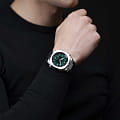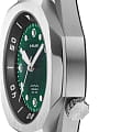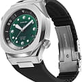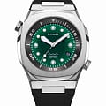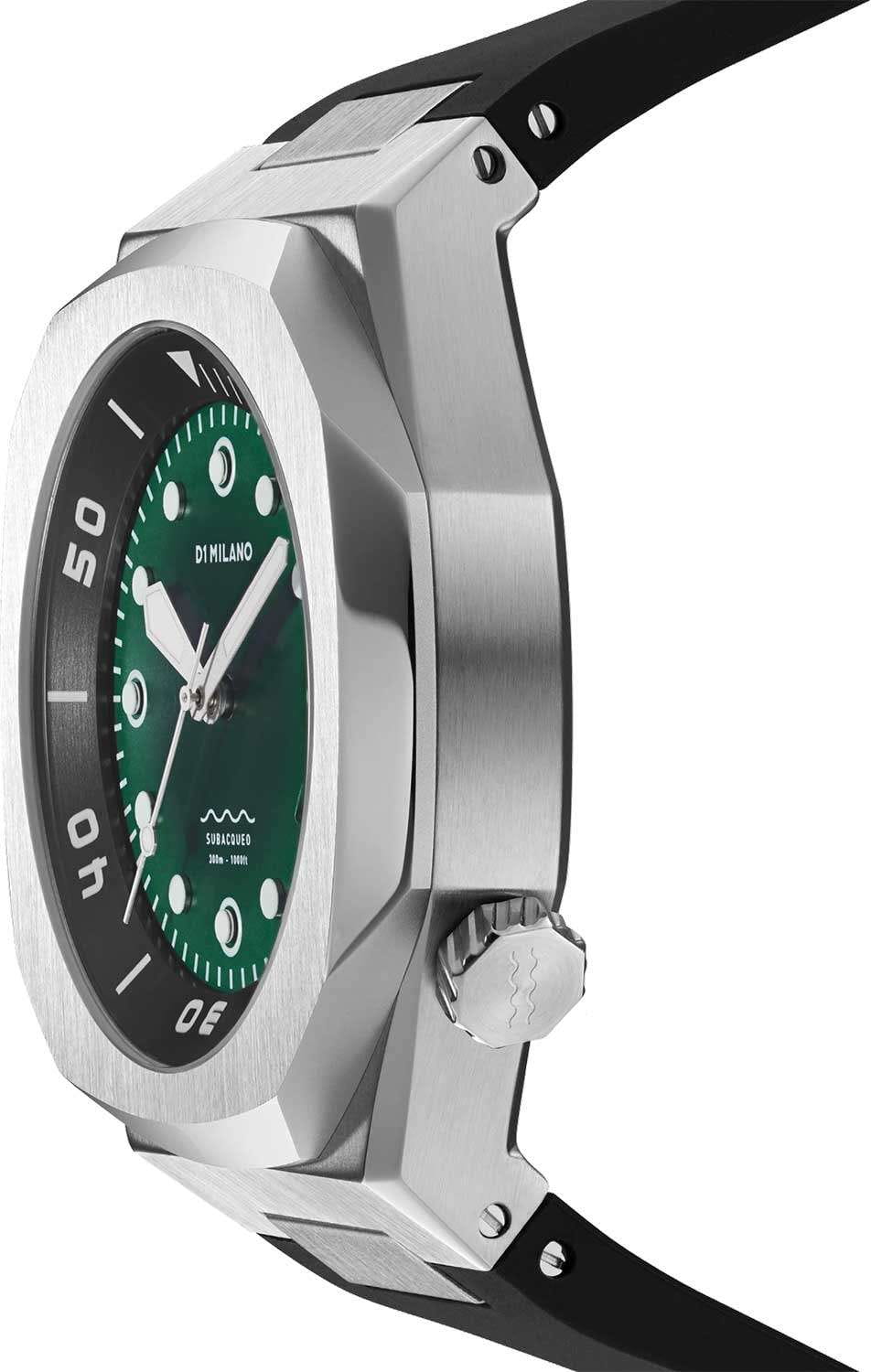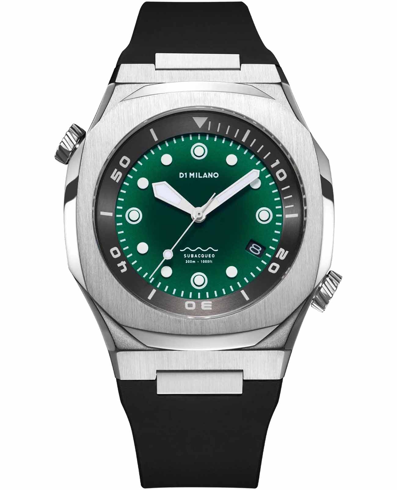 Часы D1 Milano DVRJ03 — это механические мужские часы с автоподзаводом, которые поражают своим спортивным стилем и точностью исполнения. С этими удобными часами покорение морских глубин выйдет на новый уровень. Корпус из нержавеющей стали серебристого цвета гармонично сочетается с зеленым циферблатом. Запас хода 41 час. Циферблат защищен сапфировым стекломСапфировое стеклоПрочный и надёжный материал из кристалла сапфира синтетического происхождения, характеризующийся особой твёрдостью и устойчивостью к царапинам и повреждениям., а черный силиконовый ремешок придает ему элегантный вид. На циферблате часов есть окошко даты в положении 4 часа. На часовую, минутную стрелки нанесено люминесцентное покрытиеЛюминесцентное покрытиеПозволяет считывать показания времени в темноте. Производители наносят на стрелки, часовые индексы, безель или поверхность циферблата светонакопительный состав, дающий холодное свечение., которое светится в темноте, создавая необычное изображение. Водонепроницаемость часов достигает 300 метров, что делает их подходящими для для дайвинга.