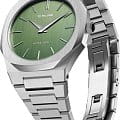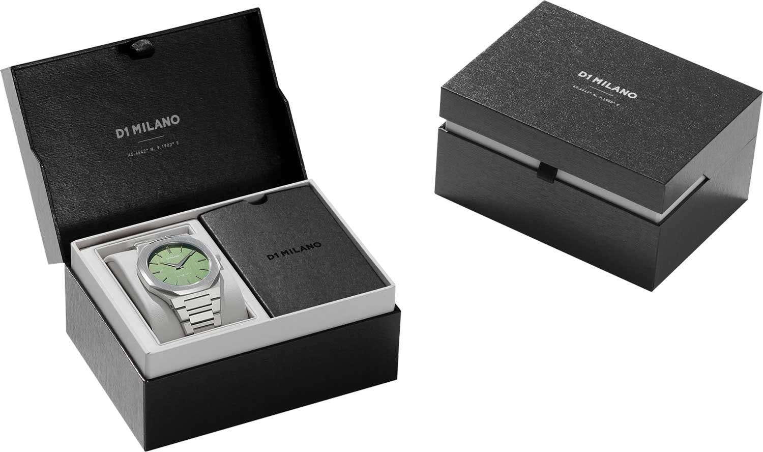Часы D1 Milano UTBJ06 — это уникальные кварцевые часы, которые подчеркнут ваш изысканный стиль. Эти наручные часы из коллекции Ultra Thin с эффектным монохромным дизайном станут выразительным акцентом вашего образа. Корпус диаметром 40 мм из нержавеющей стали придает часам современный и утонченный вид. Зеленый циферблат метками в виде штрихов, а серебристые хроматические стрелки и индексы создают стильный контраст, подчёркивая элегантность модели. Задняя крышка из нержавеющей стали закреплена на 8-х винтах и дополнена индивидуальным серийным номером, что подчеркивает уникальность каждого экземпляра. Стальной браслет с раскладной застёжкойРаскладная застёжкаТакой тип застёжки используется только на браслетах из металла. Она никогда не раскрывается полностью, происходит разделение на 2 и более частей. Раскладывающая застёжка снизит вероятность потери часов к минимуму. обеспечивает надежность и комфорт в повседневном использовании. Сапфировое стеклоСапфировое стеклоПрочный и надёжный материал из кристалла сапфира синтетического происхождения, характеризующийся особой твёрдостью и устойчивостью к царапинам и повреждениям. с антибликовым покрытием защищает циферблат, а водозащита до 50WR делает эти часы практичным выбором для любых условий. Благодаря калибру Miyota 1L22, они отличаются точностью и надежностью. Эти итальянские часы представляют собой идеальное сочетание традиционного мастерства и инновационного подхода, воплощая в себе новый взгляд на классическую элегантность.
