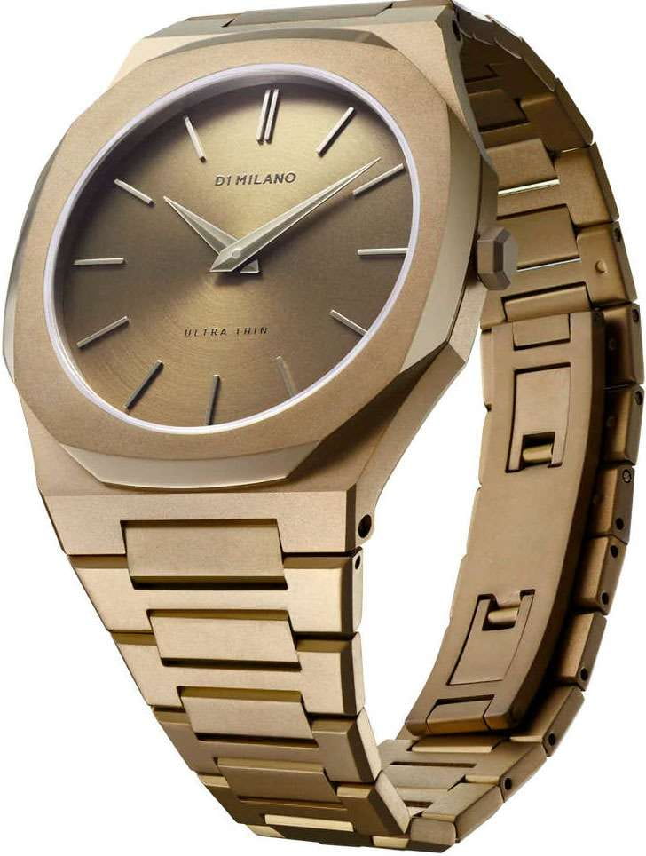Часы D1 Milano UTBJ36 — это уникальные кварцевые часы, которые подчеркнут ваш изысканный стиль. Эти наручные часы из коллекции Ultra Thin с эффектным монохромным дизайном станут выразительным акцентом вашего образа. Корпус диаметром 40 мм из нержавеющей стали с PVDPVDУльтратонкое покрытие наносится в технике вакуумного напыления, сочетает в себе нитрид титана особой прочности со слоем золота или оксида хрома. Несёт в себе декоративную или защитную функцию. покрытием придает часам современный и утонченный вид. Золотистый циферблат с метками в виде штрихов и такие же золотистые хроматические стрелки и индексы подчеркивают элегантность модели. Задняя крышка из нержавеющей стали закреплена на 8-х винтах и дополнена индивидуальным серийным номером, что подчеркивает уникальность каждого экземпляра. Стальной браслет с PVDPVDУльтратонкое покрытие наносится в технике вакуумного напыления, сочетает в себе нитрид титана особой прочности со слоем золота или оксида хрома. Несёт в себе декоративную или защитную функцию. покрытием и с раскладной застёжкойРаскладная застёжкаТакой тип застёжки используется только на браслетах из металла. Она никогда не раскрывается полностью, происходит разделение на 2 и более частей. Раскладывающая застёжка снизит вероятность потери часов к минимуму. обеспечивает надежность и комфорт в повседневном использовании. Сапфировое стеклоСапфировое стеклоПрочный и надёжный материал из кристалла сапфира синтетического происхождения, характеризующийся особой твёрдостью и устойчивостью к царапинам и повреждениям. с антибликовым покрытием защищает циферблат, а водозащита до 50WR делает эти часы практичным выбором для любых условий. Благодаря калибру Miyota 1L22, они отличаются точностью и надежностью. Эти итальянские часы представляют собой идеальное сочетание традиционного мастерства и инновационного подхода, воплощая в себе новый взгляд на классическую элегантность.