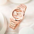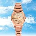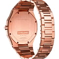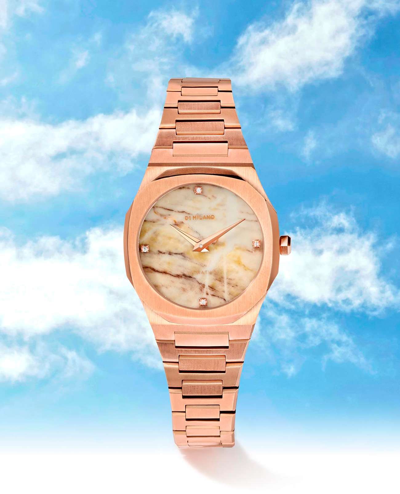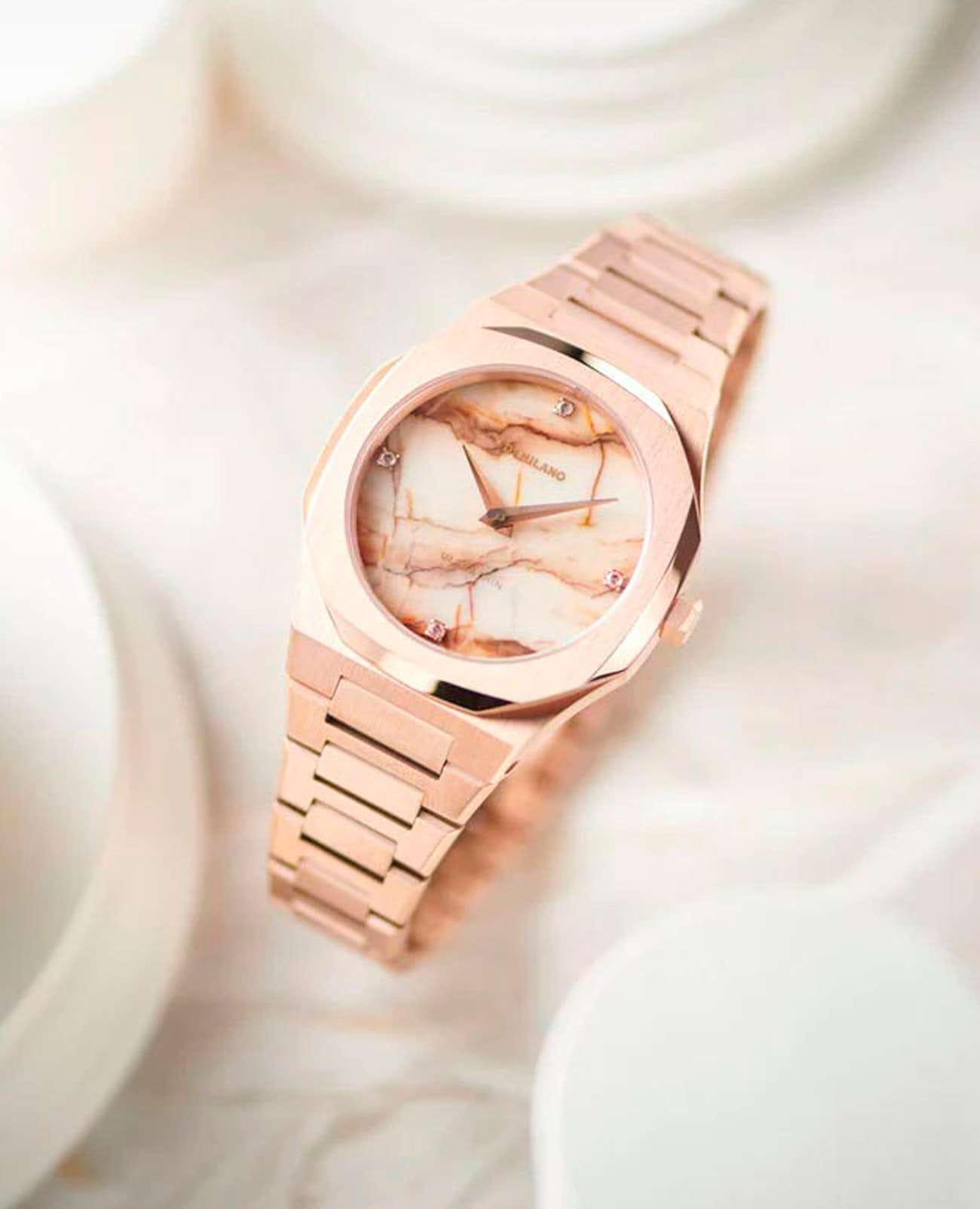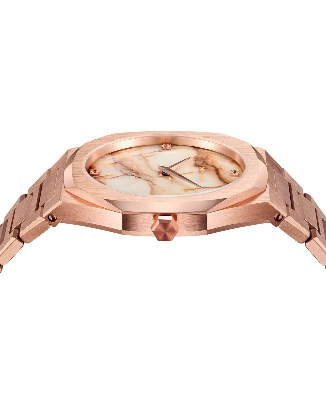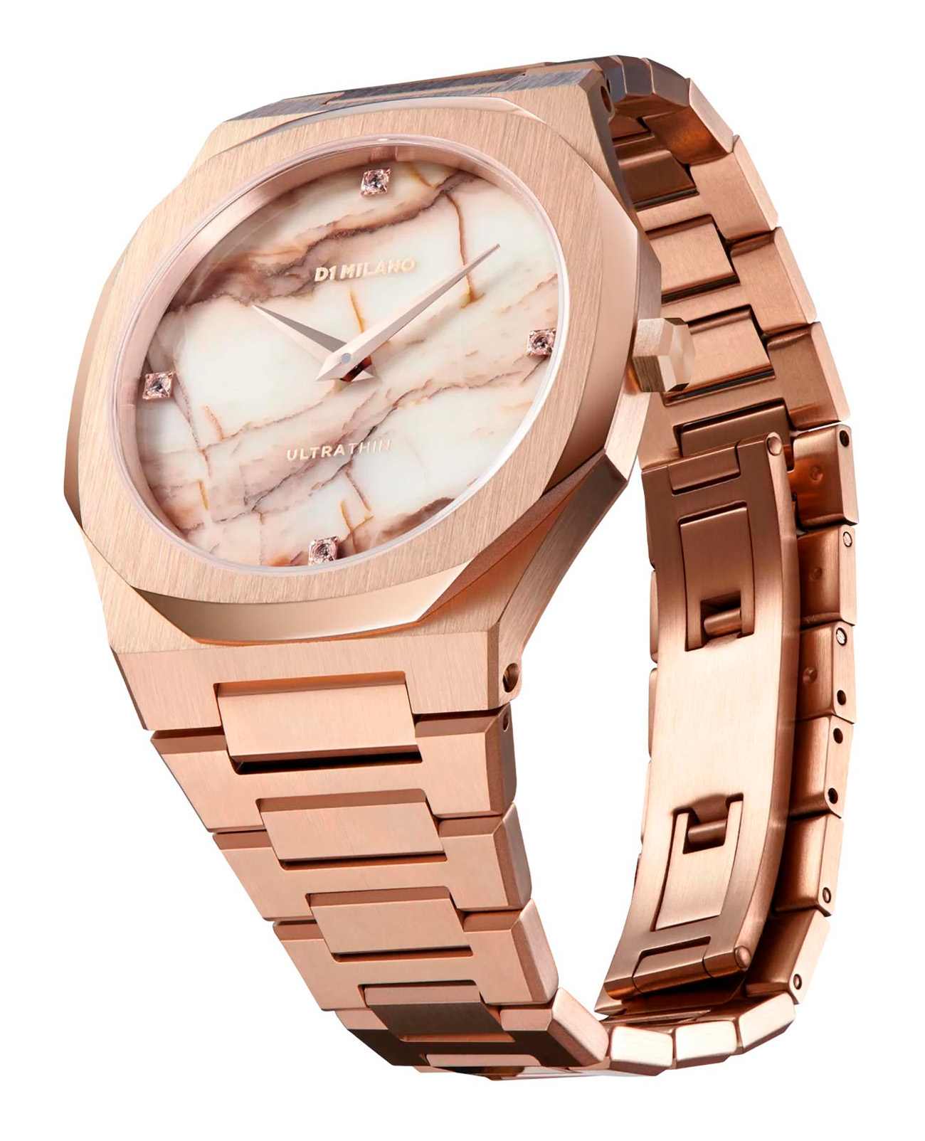 Женские наручные часы D1 Milano UTBL14 из коллекции Ultra Thin сочетают в себе элегантный дизайн и современные технологии. Модель обладает круглым корпусом диаметром 34 мм, изготовленным из высококачественной нержавеющей стали с PVD-покрытиемPVDУльтратонкое покрытие наносится в технике вакуумного напыления, сочетает в себе нитрид титана особой прочности со слоем золота или оксида хрома. Несёт в себе декоративную или защитную функцию. в розовое золото, что обеспечивает устойчивость к внешним воздействиям. Толщина ультратонкого корпуса составляет всего 6 мм, делая аксессуар легким и удобным для повседневного использования. Браслет также выполнен из нержавеющей стали с раскладной застежкойРаскладной замокДанный вариант застежки используется только на часах с металлическим браслетом. Отличительная особенность такого крепления в том, что длина браслета становится универсальной и вы можете самостоятельно отрегулировать нужный вам размер – застежка просто двигается по браслету часов., гарантирующей комфортное ношение и безопасность. Циферблат бело-розового мраморного цвета украшен метками в виде кристаллов и оснащен стрелочным механизмом в тон корпуса, который подчеркивает элегантность модели. Для защиты используется сапфировое стеклоСапфировое стеклоПрочный и надёжный материал из кристалла сапфира синтетического происхождения, характеризующийся особой твёрдостью и устойчивостью к царапинам и повреждениям., обеспечивающее прочную защиту от царапин и бликов. Часы работают на кварцевом механизме, гарантирующем точность хода без необходимости регулярного подзавода. Водонепроницаемость часов достигает 5 атмосфер (50 метров), что позволяет использовать их во время мытья рук или плавания, однако не рекомендуется для глубоководного дайвинга.