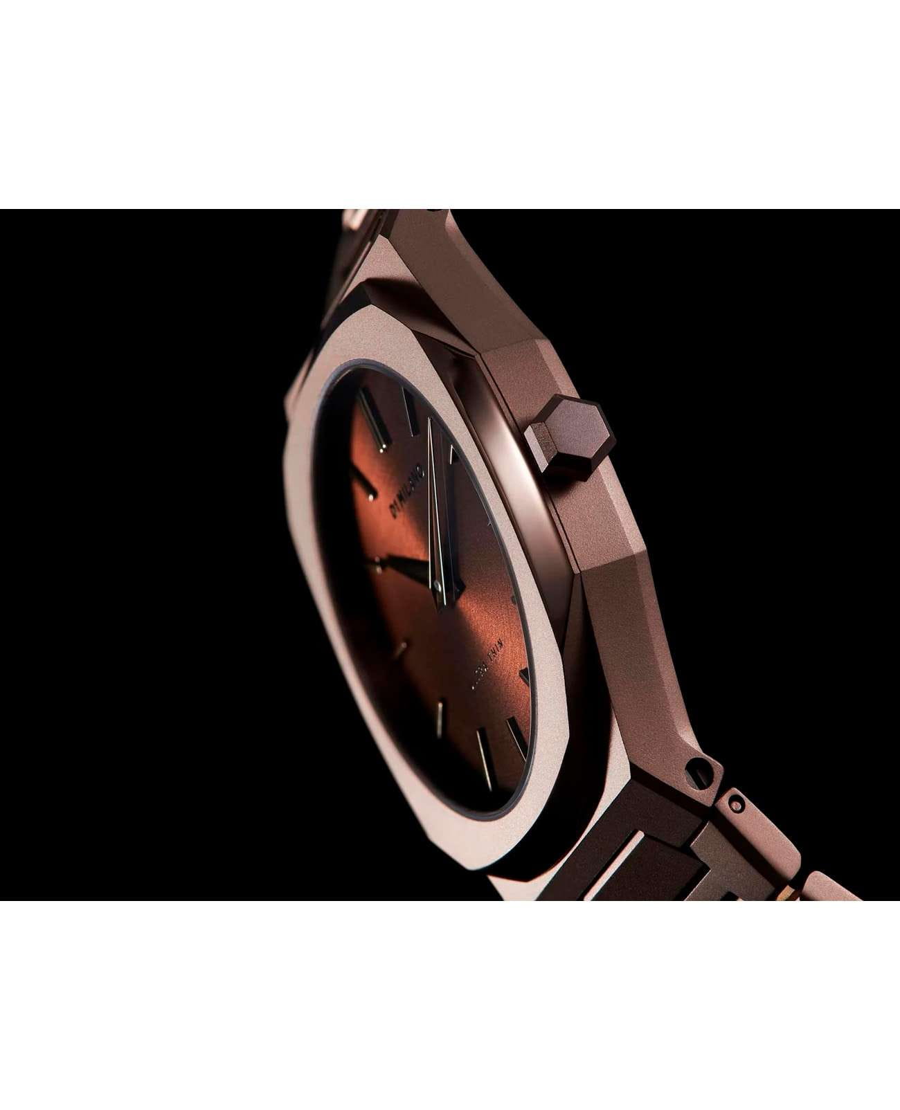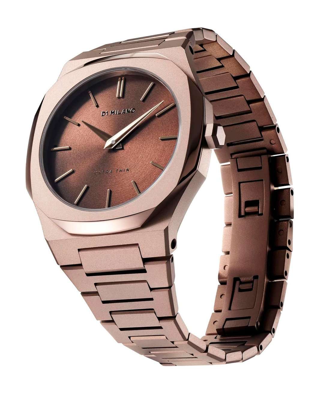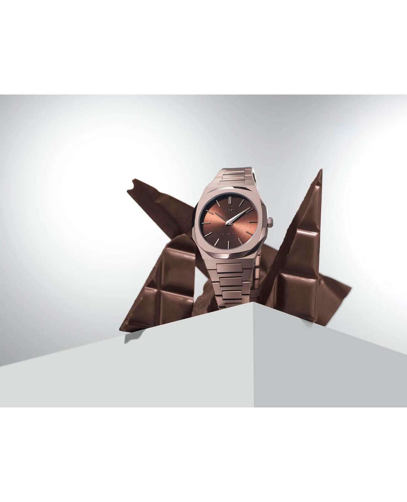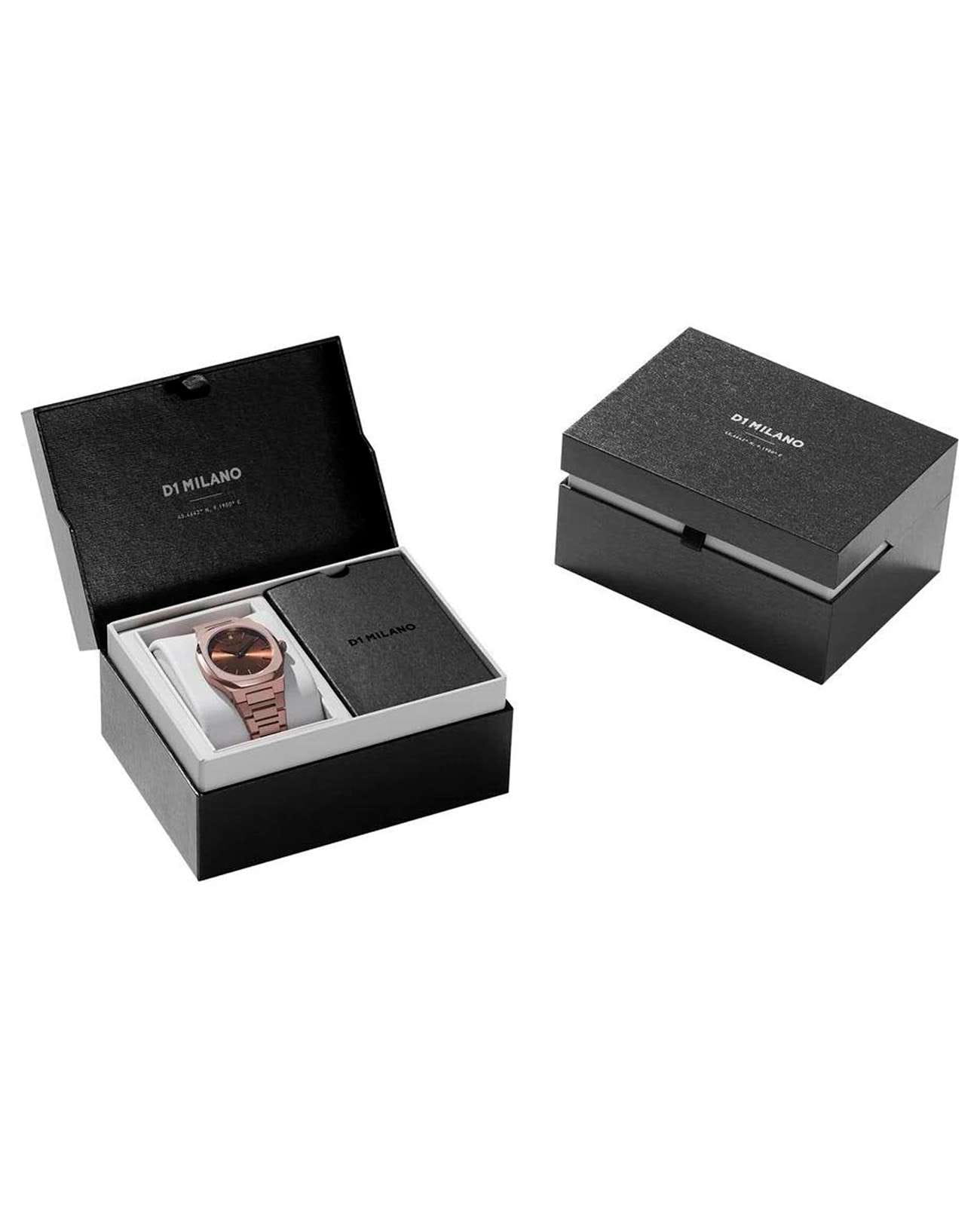 Женские наручные часы D1 Milano UTBL15 из коллекции Ultra Thin Chocolatino сочетают в себе элегантный дизайн и современные технологии. Модель обладает круглым корпусом диаметром 34 мм, изготовленным из высококачественной нержавеющей стали с PVD-покрытиемPVDУльтратонкое покрытие наносится в технике вакуумного напыления, сочетает в себе нитрид титана особой прочности со слоем золота или оксида хрома. Несёт в себе декоративную или защитную функцию., что обеспечивает устойчивость к внешним воздействиям. Толщина ультратонкого корпуса составляет всего 6 мм, делая аксессуар легким и удобным для повседневного использования. Браслет также выполнен из нержавеющей стали с PVD-покрытиемPVDУльтратонкое покрытие наносится в технике вакуумного напыления, сочетает в себе нитрид титана особой прочности со слоем золота или оксида хрома. Несёт в себе декоративную или защитную функцию. и с раскладной застежкойРаскладной замокДанный вариант застежки используется только на часах с металлическим браслетом. Отличительная особенность такого крепления в том, что длина браслета становится универсальной и вы можете самостоятельно отрегулировать нужный вам размер – застежка просто двигается по браслету часов., гарантирующей комфортное ношение и безопасность. Коричневый циферблат с теплыми оттенками шоколада украшен метками в виде штрихов и оснащен стрелочным механизмом в тон корпуса, который подчеркивает элегантность модели. Для защиты используется сапфировое стеклоСапфировое стеклоПрочный и надёжный материал из кристалла сапфира синтетического происхождения, характеризующийся особой твёрдостью и устойчивостью к царапинам и повреждениям., обеспечивающее прочную защиту от царапин и бликов. Часы работают на кварцевом механизме, гарантирующем точность хода без необходимости регулярного подзавода. Водонепроницаемость часов достигает 5 атмосфер (50 метров), что позволяет использовать их во время мытья рук или плавания, однако не рекомендуется для глубоководного дайвинга.