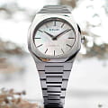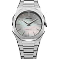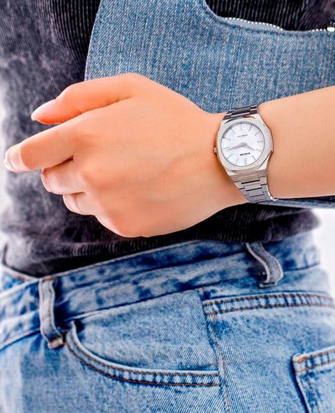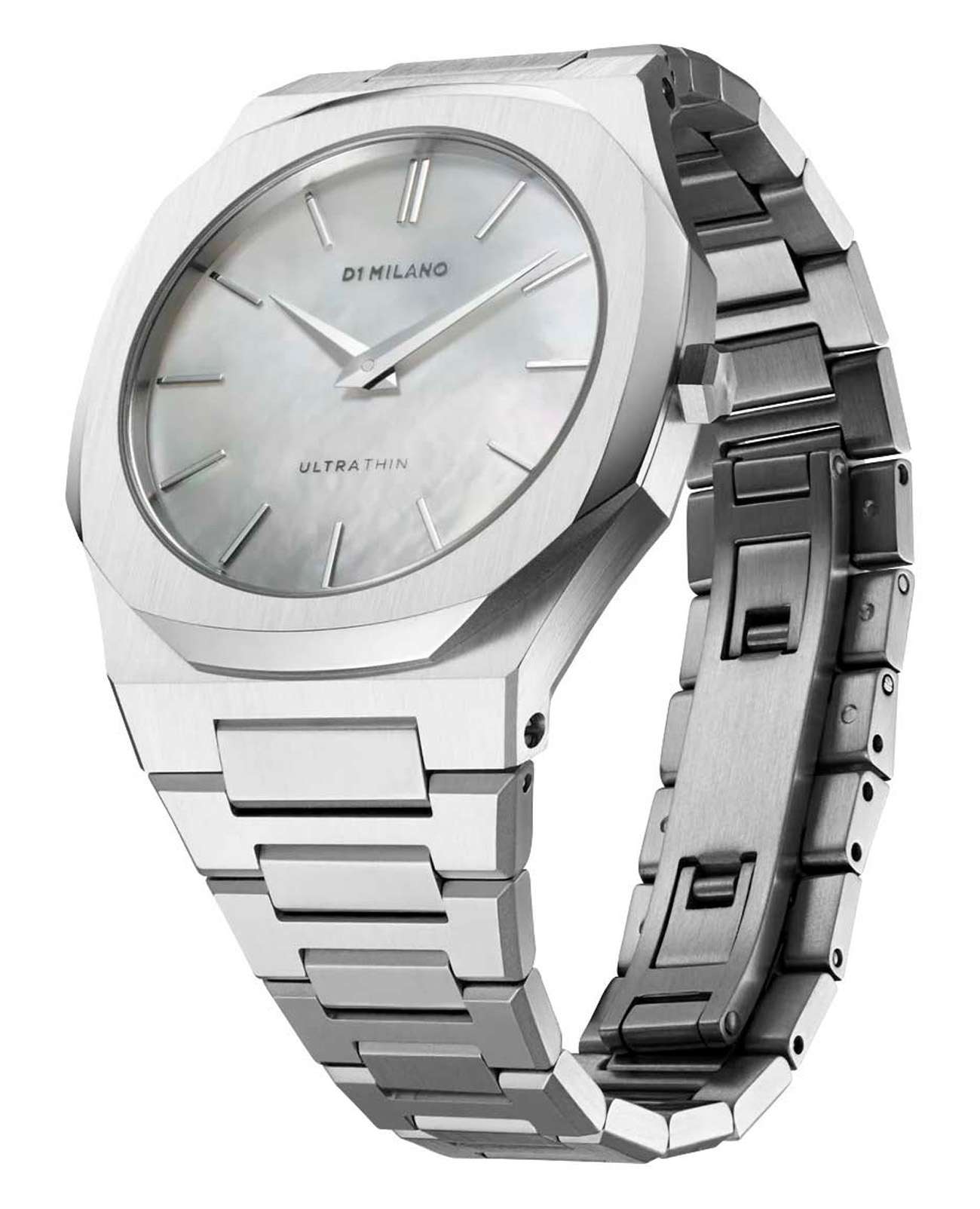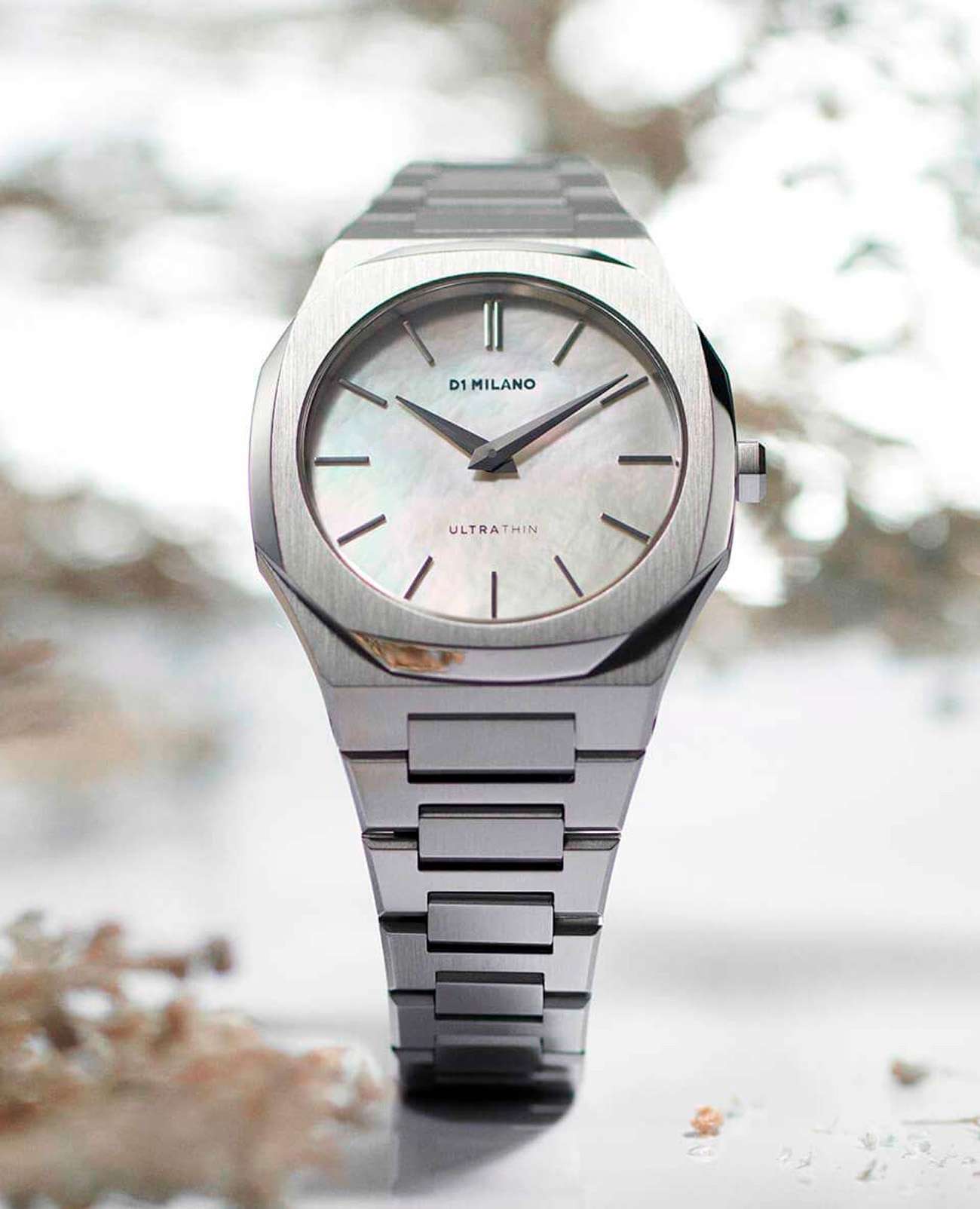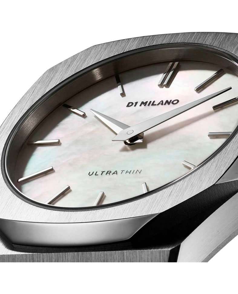 Женские наручные часы D1 Milano UTBL19 из коллекции Ultra Thin сочетают в себе элегантный дизайн и современные технологии. Модель обладает круглым корпусом диаметром 34 мм, изготовленным из высококачественной нержавеющей стали. Толщина ультратонкого корпуса составляет всего 6,45 мм, что делает аксессуар легким и удобным для повседневного использования. Браслет также выполнен из нержавеющей стали с раскладной застежкойРаскладной замокДанный вариант застежки используется только на часах с металлическим браслетом. Отличительная особенность такого крепления в том, что длина браслета становится универсальной и вы можете самостоятельно отрегулировать нужный вам размер – застежка просто двигается по браслету часов., гарантирующей комфортное ношение и безопасность. Циферблат выполнен из перламутра серебристого цвета, украшен метками в виде штрихов и оснащен стрелочным механизмом, который подчеркивает элегантность модели. Для защиты используется сапфировое стеклоСапфировое стеклоПрочный и надёжный материал из кристалла сапфира синтетического происхождения, характеризующийся особой твёрдостью и устойчивостью к царапинам и повреждениям. с антибликовым покрытиемАнтибликовое покрытиеСлой оксида металла в 0,13-0,3 микрон, благодаря которому стекло часов не бликует и не отражает свет. Антибликовое покрытие уменьшает отражение света в 10 раз, обеспечивая отличную читаемость показателей циферблата., обеспечивающее прочную защиту от царапин и бликов. Часы работают на кварцевом механизме Miyota 1L22, гарантирующем точность хода без необходимости регулярного подзавода. Водонепроницаемость часов достигает 5 атмосфер (50 метров), что позволяет использовать их во время мытья рук или плавания, однако не рекомендуется для глубоководного дайвинга.