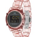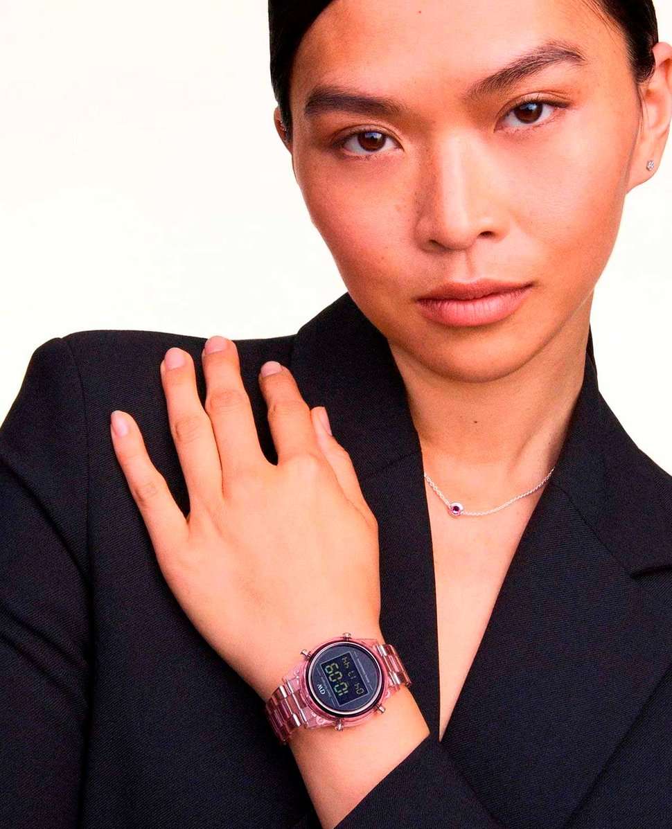 Универсальные наручные часы Daniel Wellington DW00100764 из коллекции Retro Digital сочетают в себе современный дизайн и экологичность. Модель обладает круглым корпусом диаметром 36 мм, выполненным из прозрачного биопластика и нержавеющей стали (316L), что делает их легкими и устойчивыми к внешним воздействиям. Циферблат защищен прочным органическим стеклом, устойчивым к царапинам и механическим повреждениям. Часы оснащены цифровым механизмом, поддерживающим функцию автоматического календаря с датой. Дополнительно встроены функции будильникаБудильникБуди́льник — часы, в заданный момент времени подающие звуковой, световой и/или в редких случаях другой сигнал. и секундомераСекундомерСекундоме́р — прибор, способный измерять интервалы времени с точностью до долей секунды., что делает модель практичной для активного образа жизни. Для удобства считывания информации в темное время суток циферблат оснащен светодиодной подсветкойСветодиодная подсветкаСветодиодная или LED-подсветка обеспечивает появление яркого холодного свечения за счёт LED-элементов - маленьких лампочек. Они потребляют минимальное количество энергии, чаще всего можно встретить 1 светодиод, в нижней части циферблата.. Ремешок выполнен из прозрачного биопластика розового цвета на застёжке «бабочка» с кнопкамиЗастёжка "бабочка"Такой вид застёжки дополняется предохранителями, помогающими избежать случайного раскрытия браслета. Обладают изящным исполнением. , гарантирующий комфортное ношение и безопасность. Корпус часов водонепроницаем до 30 метров, что позволяет использовать их в условиях ограниченного контакта с водой, например, при мытье рук или попадании брызг.