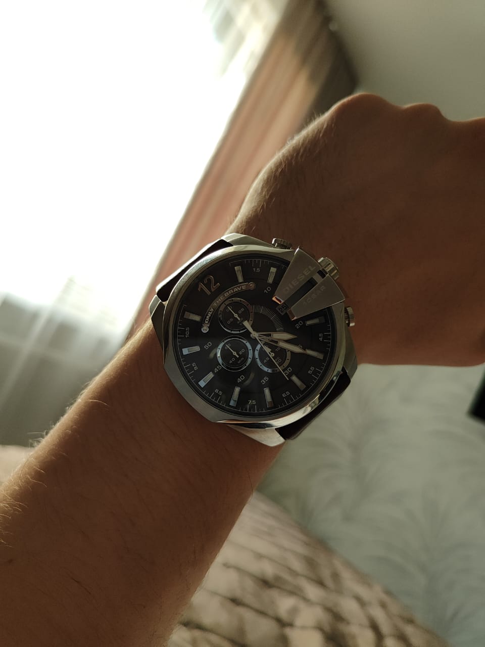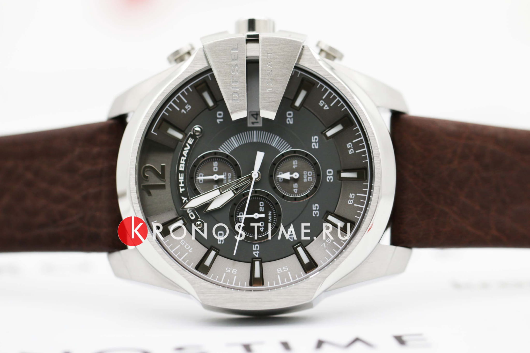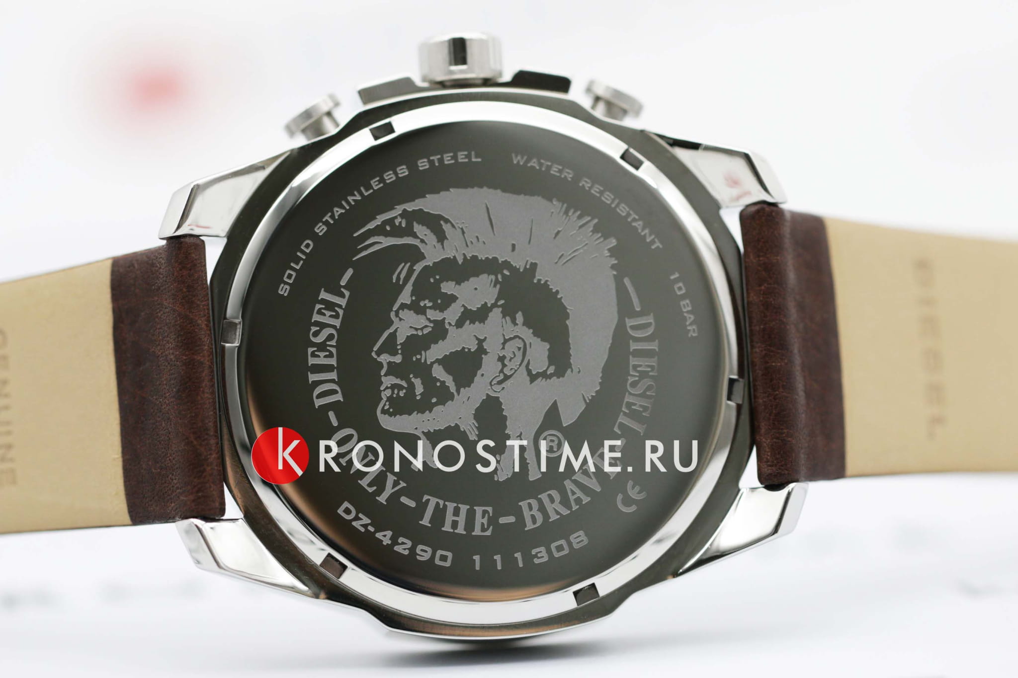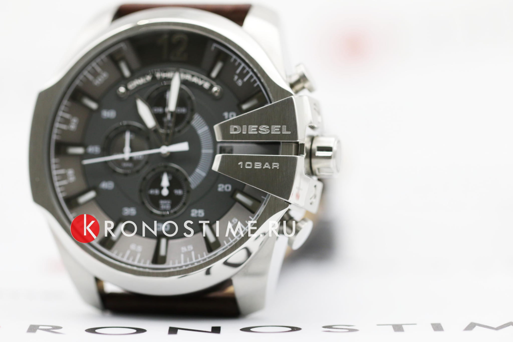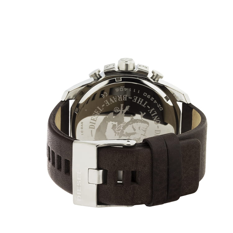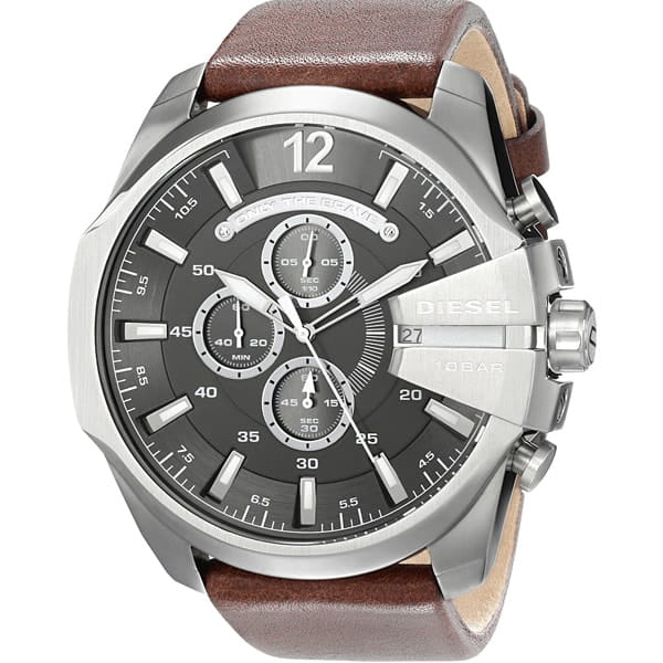 Мужские часы-хронографХронографФункция позволяет измерять отрезки времени с особой точностью: часы, минуты, секунды. Верным признаком хронографа является наличие на циферблате 3 дополнительных окошек-счётчиков.. Diesel MS9 Chrono DZ4290, кварцевый механизм с высокой точностью. Кварцевый хронографХронографФункция позволяет измерять отрезки времени с особой точностью: часы, минуты, секунды. Верным признаком хронографа является наличие на циферблате 3 дополнительных окошек-счётчиков.. Класс водозащиты: 100 метров, позволит плавать, нырять и заниматься другими водными видами спорта. Корпус часов изготовлен из стали. Индикация даты на позиции трех часов. Устойчивое к мелким механическим повреждениям минеральное стеклоМинеральное стеклоМинеральное стекло представляет собой искусственно выращенный минерал кварца. Такое стекло отличается особой устойчивостью к повреждениям и царапинам. Уступает по некоторым качествам сапфировому стеклу.. Завинчивающаяся задняя крышка. Серый циферблат с часовыми индексами в форме штрихов и арабских цифр. Заводная головка с защитой. Кожаный ремешок коричневого цвета. Классическая застежка выполнена из полированной нержавеющей стали.