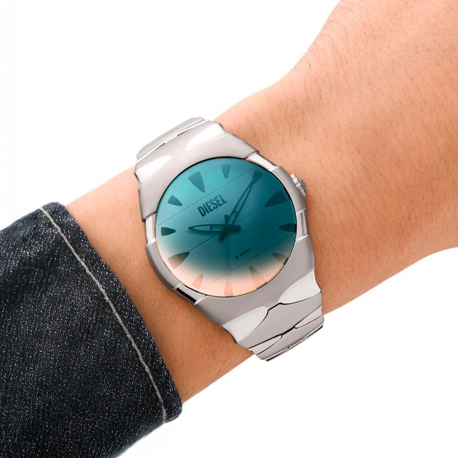 Мужские кварцевые часы Diesel DZ2212 — это стильный аксессуар, который подчеркнёт индивидуальность и безупречный вкус своего владельца. Модель выполнена в круглой форме из нержавеющей стали с сочетанием матовых и полированных деталей, что придаёт ей элегантный внешний вид и устойчивость к царапинам. Циферблат белого цвета оформлен по технологии Sunray, создающей эффект солнечных лучей, а дополнен штриховыми метками для удобства считывания времени. Защиту циферблата обеспечивает минеральное стеклоМинеральное стеклоМинеральное стекло представляет собой искусственно выращенный минерал кварца. Такое стекло отличается особой устойчивостью к повреждениям и царапинам. Уступает по некоторым качествам сапфировому стеклу., устойчивое к повседневным нагрузкам. Заводная головка имеет рифлёную форму, что делает её удобной в использовании и добавляет модели спортивного акцента. Браслет из стали оснащён раскладной застёжкойРаскладная застёжкаТакой тип застёжки используется только на браслетах из металла. Она никогда не раскрывается полностью, происходит разделение на 2 и более частей. Раскладывающая застёжка снизит вероятность потери часов к минимуму. с двумя кнопками, обеспечивающей комфорт и надёжную фиксацию на запястье. Часы водонепроницаемы до 50 метров (, что позволяет использовать их в повседневных условиях — при мытье рук или под лёгким дождём. Эти часы станут универсальным аксессуаром для тех, кто ценит сочетание стиля, качества и функциональности — идеальный выбор для уверенных в себе мужчин, следящих за своим имиджем и предпочитающих выделяться.