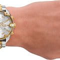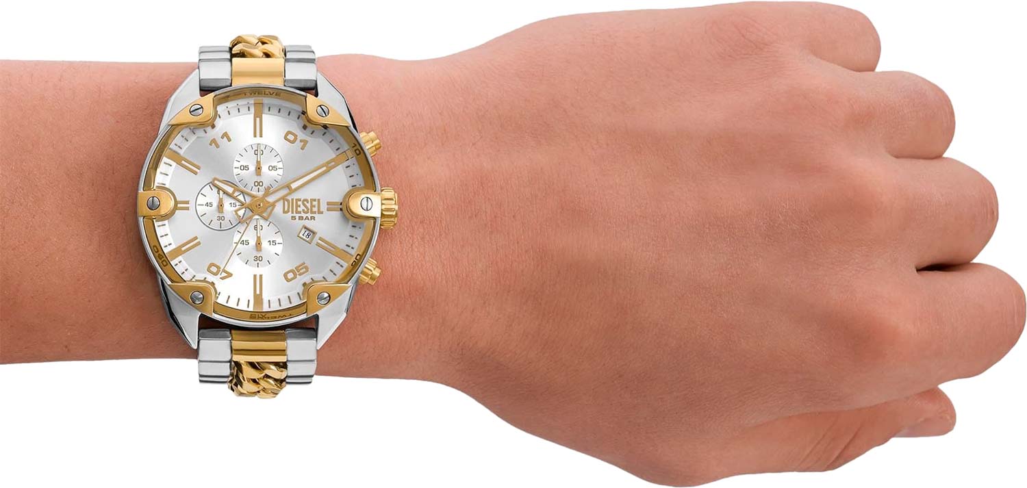 Мужские наручные часы-хронографХронографФункция позволяет измерять отрезки времени с особой точностью: часы, минуты, секунды. Верным признаком хронографа является наличие на циферблате 3 дополнительных окошек-счётчиков. с секундомеромСекундомерСекундоме́р — прибор, способный измерять интервалы времени с точностью до долей секунды. Diesel Spiked DZ4629, кварцевый механизм с высокой точностью. Минеральное стеклоМинеральное стеклоМинеральное стекло представляет собой искусственно выращенный минерал кварца. Такое стекло отличается особой устойчивостью к повреждениям и царапинам. Уступает по некоторым качествам сапфировому стеклу. устойчивое к мелким механическим повреждениям. Класс водозащиты: 50 метров, позволит защитить корпус от случайных брызг или капель дождя. Корпус часов изготовлен из стали с IP-покрытиемIP-покрытиеМетод ионного напыления. Демонстрирует повышенную устойчивость к истиранию, окислению и химическим веществам. Под воздействием высокого давления и температуры около 1500°C молекулы металла надёжно соединяются с частицами корпуса часов.. Циферблат выполнен по технологии Sunray (солнечные лучи). Метки в виде штрихов и арабских цифр. Окошко даты находится в положении 4 часа. Стрелки и метки с люминесцентным покрытиемЛюминесцентное покрытиеПозволяет считывать показания времени в темноте. Производители наносят на стрелки, часовые индексы, безель или поверхность циферблата светонакопительный состав, дающий холодное свечение.. Надежный стальной браслет с декоративными вставками в виде звеньев цепи с IP-покрытиемIP-покрытиеМетод ионного напыления. Демонстрирует повышенную устойчивость к истиранию, окислению и химическим веществам. Под воздействием высокого давления и температуры около 1500°C молекулы металла надёжно соединяются с частицами корпуса часов. на раскладной застёжкеРаскладная застёжкаТакой тип застёжки используется только на браслетах из металла. Она никогда не раскрывается полностью, происходит разделение на 2 и более частей. Раскладывающая застёжка снизит вероятность потери часов к минимуму..