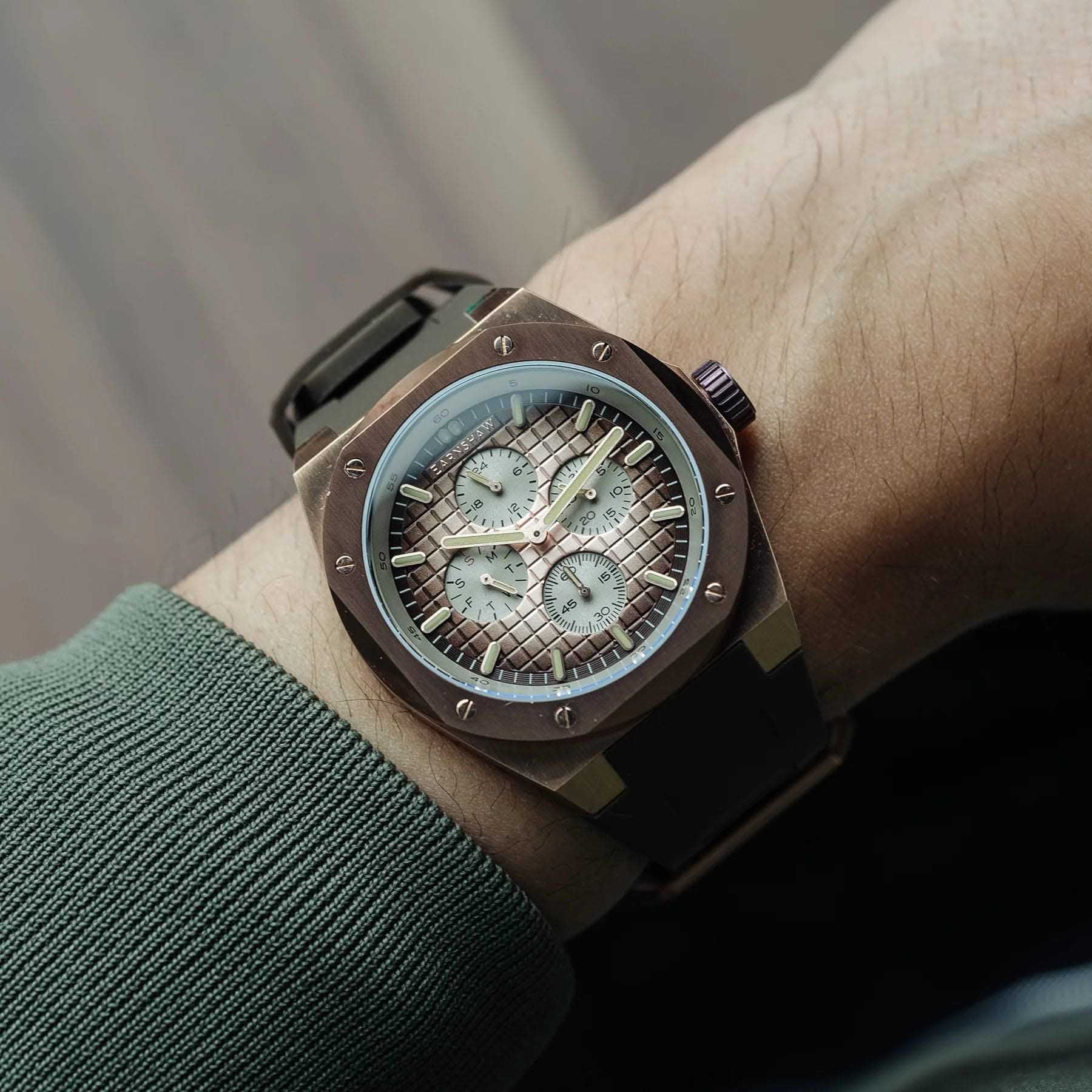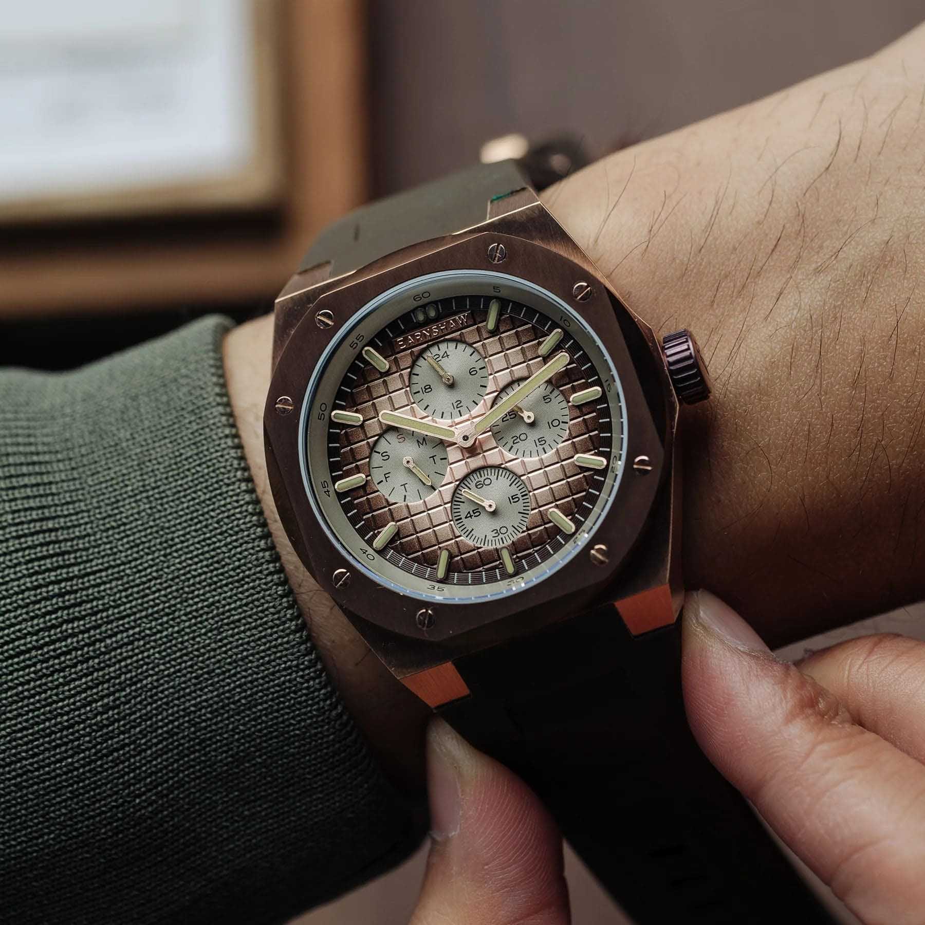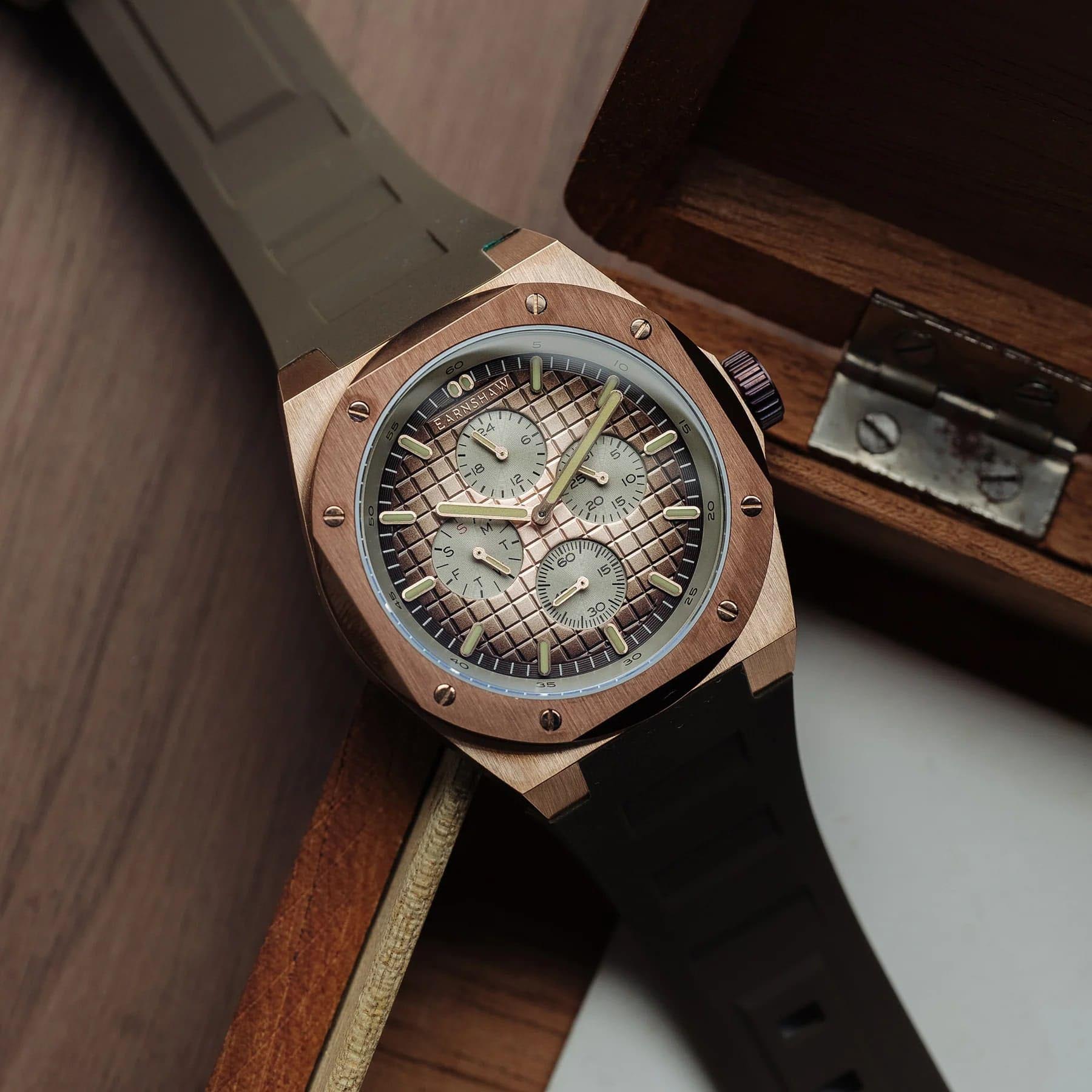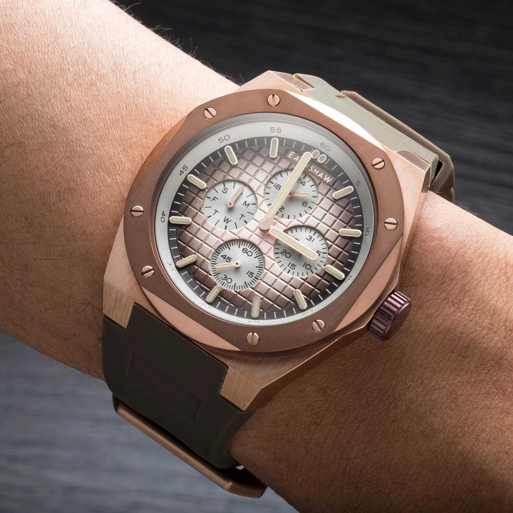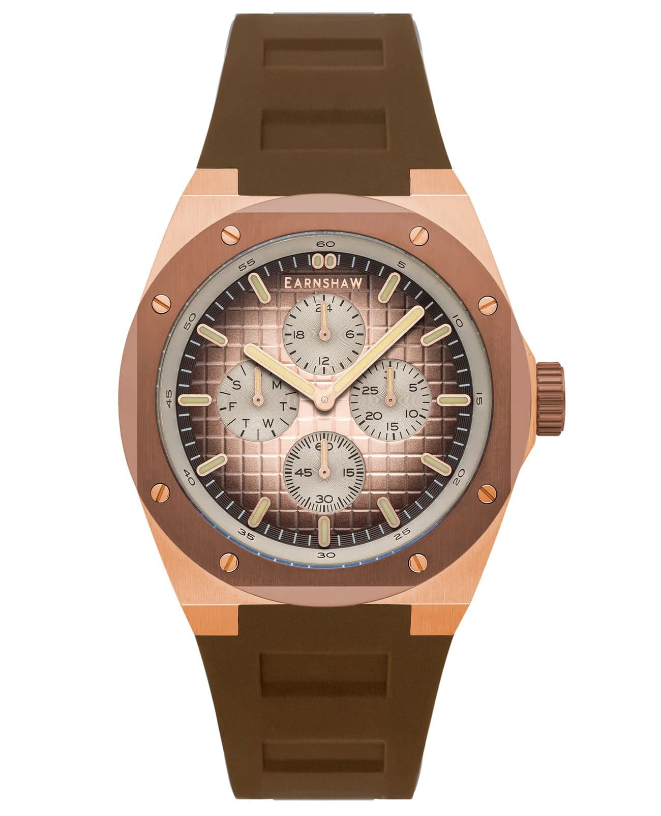 Мужские наручные часы с минеральным стекломМинеральное стеклоМинеральное стекло представляет собой искусственно выращенный минерал кварца. Такое стекло отличается особой устойчивостью к повреждениям и царапинам. Уступает по некоторым качествам сапфировому стеклу. Earnshaw Bessemer ES-8253-03, кварцевый механизм. Класс водозащиты: 100 метров, позволит защитить корпус от воды. Корпус часов изготовлен из стали с IP-покрытиемIP-покрытиеМетод ионного напыления. Демонстрирует повышенную устойчивость к истиранию, окислению и химическим веществам. Под воздействием высокого давления и температуры около 1500°C молекулы металла надёжно соединяются с частицами корпуса часов.. Центральные часовая и минутная стрелки, секундная стрелка вынесена на малый циферблат. Отображение даты и дня недели в малых циферблатах. 12/24х часовой формат времени. Коричневый циферблат. Корпус выполнен из нержавеющей стали с IP покрытием цвета розового золота. Диаметр корпуса составляет 44 мм, толщина 14 мм. Коричневый силиконовый ремешок, стандартная застежка. Раскладная застёжкаРаскладная застёжкаТакой тип застёжки используется только на браслетах из металла. Она никогда не раскрывается полностью, происходит разделение на 2 и более частей. Раскладывающая застёжка снизит вероятность потери часов к минимуму.