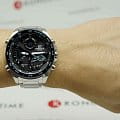 Достаточно внушительный чёрный циферблат имеет синие акценты, оригинально смотрится необычное расположение счётчиков. Многофункциональная модель пригодится на любой случай жизни, ведь она оснащена Bluetooth 4.0BluetoothСовременная технология, позволяющая синхронизировать часы с телефоном и переносить данные. Часы с Bluetooth расширяют возможности вашего смартфона и делают его использование ещё более удобным., хронографомХронографФункция позволяет измерять отрезки времени с особой точностью: часы, минуты, секунды. Верным признаком хронографа является наличие на циферблате 3 дополнительных окошек-счётчиков., секундомером, тахиметромТахиметрРазмеченная шкала, располагается на ободке или безеле часов. Тахиметр позволяет рассчитать скорость на определённом участке пути, расстояние измеряется в километрах или милях., таймером, будильником, календарём, есть мировое времяМировое время Полезное часовое усложнение, отображающее время в основных городах и известных областях по всему миру, оно связано с часовыми поясами, удобно для путешественников и бизнесменов. и функция поиска телефона. Питание поступает от солнечной энергии - . Водонепроницаемость до 10 бар. Корпус, браслет, безельБезельВнешний ободок, закрепляющий стекло. В спортивных часах так называется поворотное кольцо с делениями на циферблате, выполняет роль таймера – замеряет отрезки времени на шкале. Неподвижный безель – элемент декора. Однонаправленно вращающийся безель на дайверских часах позволяет фиксировать моменты погружения и выныривания на поверхность. из хирургической стали 316L. Минеральное стекло. Двойная светодиодная подсветкаСветодиодная подсветкаСветодиодная или LED-подсветка обеспечивает появление яркого холодного свечения за счёт LED-элементов - маленьких лампочек. Они потребляют минимальное количество энергии, чаще всего можно встретить 1 светодиод, в нижней части циферблата.. Габариты: 51,5 x 48 x 13,9 мм.