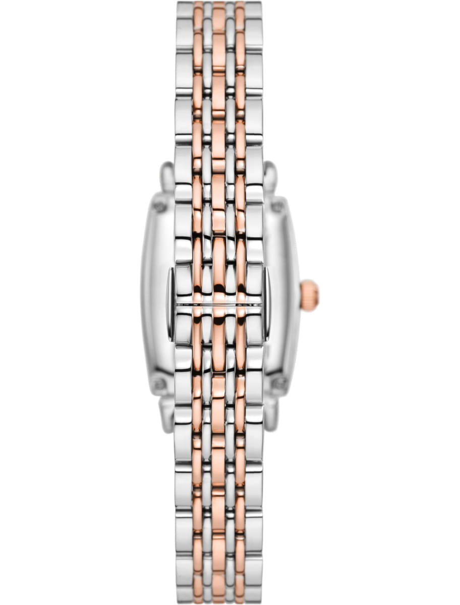 Женские кварцевые часы Emporio Armani из серии Gianni T-Bar — это элегантная новинка, сочетающая итальянский дизайн и японскую точность. Корпус выполнен из нержавеющей стали серебристого цвета и защищён минеральным стекломМинеральное стеклоМинеральное стекло представляет собой искусственно выращенный минерал кварца. Такое стекло отличается особой устойчивостью к повреждениям и царапинам. Уступает по некоторым качествам сапфировому стеклу.. Циферблат прямоугольной формы в перламутровом цвете оформлен римскими цифрами, придающими модели классический и изысканный вид. Браслет из нержавеющей с элементами PVD-покрытияPVDУльтратонкое покрытие наносится в технике вакуумного напыления, сочетает в себе нитрид титана особой прочности со слоем золота или оксида хрома. Несёт в себе декоративную или защитную функцию. стали фиксируется на застёжке «бабочка» с кнопкамиЗастёжка "бабочка"Такой вид застёжки дополняется предохранителями, помогающими избежать случайного раскрытия браслета. Обладают изящным исполнением. , обеспечивая удобство и надёжность ношения. Часы оснащены японским кварцевым механизмом, гарантирующим стабильную и точную работу. Водонепроницаемость составляет 30 WR, что позволяет использовать их в повседневных условиях, защищая от случайных брызг и капель дождя. Модель подчёркивает женственность и утончённый стиль, идеально дополняя любой образ.
