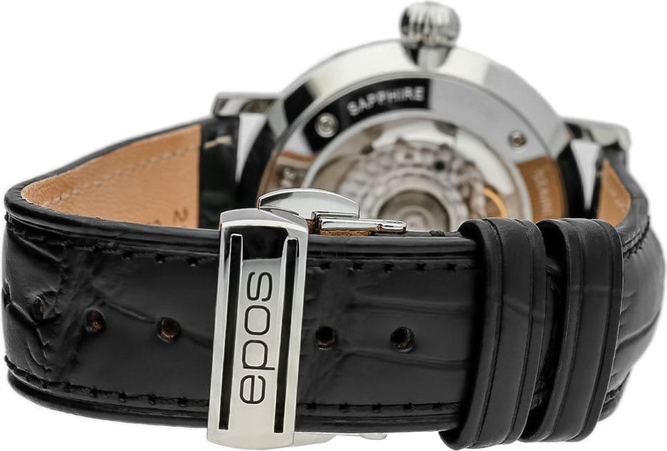 Мужские швейцарские механические часы с автоподзаводом Epos Big Moon 3440.322.20.16.25. Сапфировое стеклоСапфировое стеклоПрочный и надёжный материал из кристалла сапфира синтетического происхождения, характеризующийся особой твёрдостью и устойчивостью к царапинам и повреждениям. устойчивое к появлению царапин, обладающее высокой прозрачностью. Корпус часов изготовлен из нержавеющей стали. Стрелки и метки с люминесцентной подсветкойЛюминесцентное покрытиеПозволяет считывать показания времени в темноте. Производители наносят на стрелки, часовые индексы, безель или поверхность циферблата светонакопительный состав, дающий холодное свечение.. Циферблат с метками в виде точек. Дата отображается центральной стрелкой. Окошки для дня недели и месяца, индикатор фазы Луны. Часовой механизм декорирован жемчужной фактурной шлифовкой (Le Perlage). Прозрачная задняя крышка. Класс водозащиты: 50 метров, позволит защитить корпус от случайных брызг или капель дождя. Кожаный ремешок на стандартной застёжке.