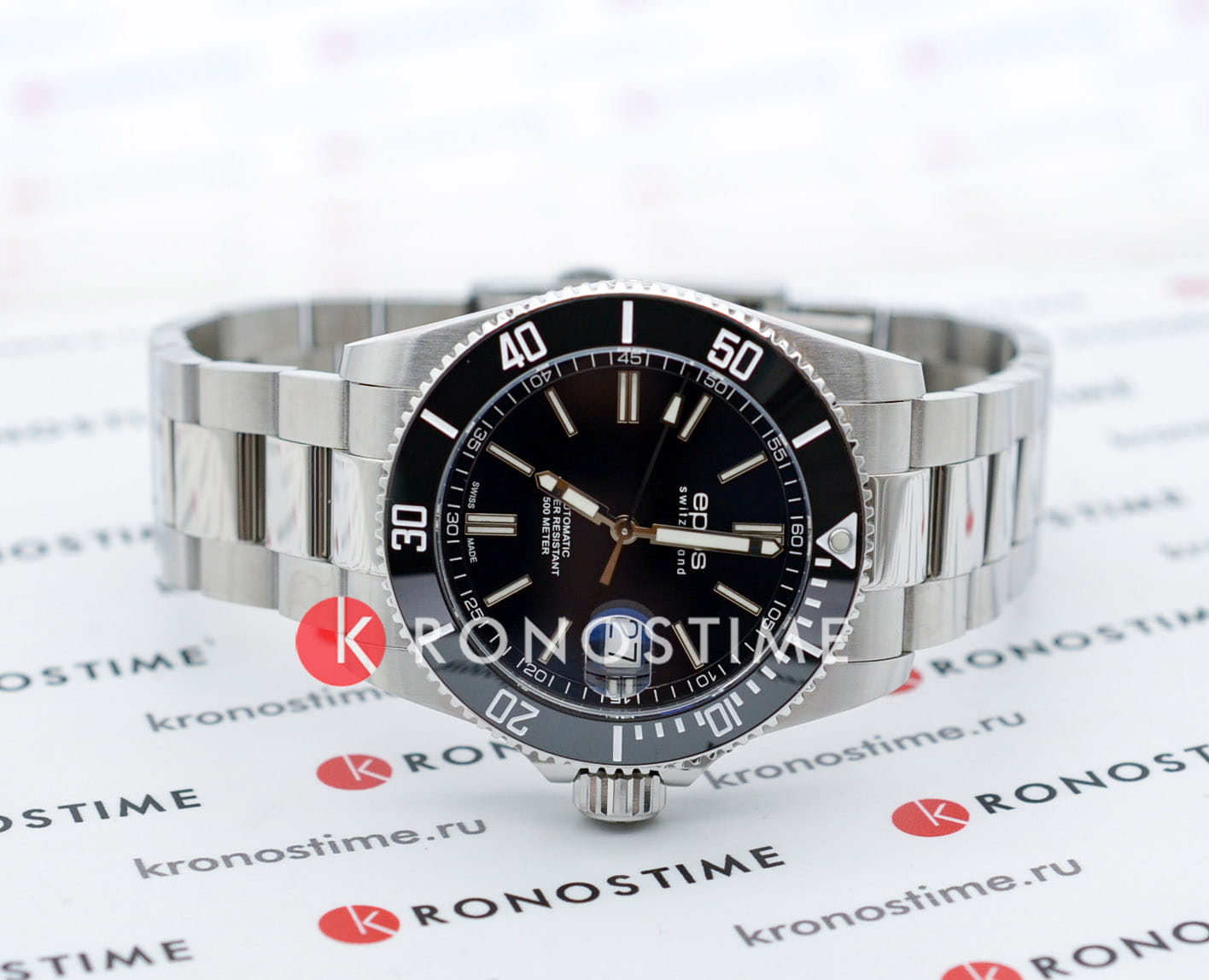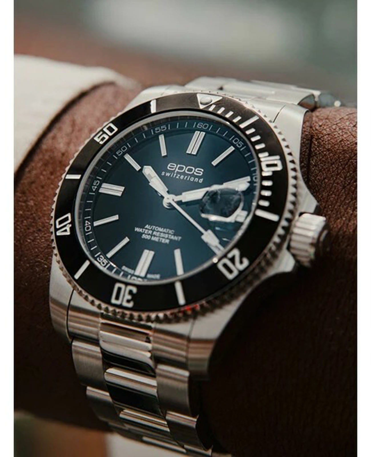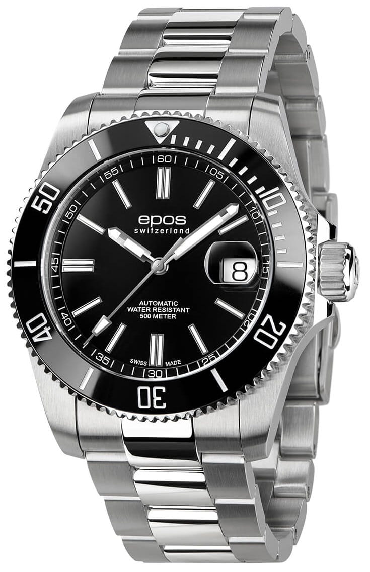 Мужские швейцарские механические часы с автоподзаводом Epos  Diver 3504.131.20.15.30. Сапфировое стеклоСапфировое стеклоПрочный и надёжный материал из кристалла сапфира синтетического происхождения, характеризующийся особой твёрдостью и устойчивостью к царапинам и повреждениям. устойчивое к появлению царапин, обладающее высокой прозрачностью. Корпус и браслет часов изготовлен из нержавеющей стали. Врачающийся в одном направлении безельБезельВнешний ободок, закрепляющий стекло. В спортивных часах так называется поворотное кольцо с делениями на циферблате, выполняет роль таймера – замеряет отрезки времени на шкале. Неподвижный безель – элемент декора. Однонаправленно вращающийся безель на дайверских часах позволяет фиксировать моменты погружения и выныривания на поверхность. из нержавеющей стали с PVDPVDУльтратонкое покрытие наносится в технике вакуумного напыления, сочетает в себе нитрид титана особой прочности со слоем золота или оксида хрома. Несёт в себе декоративную или защитную функцию. покрытием. Лупа над окошком даты. Прозрачная задняя крышка. Завинчивающаяся заводная головка. Класс водозащиты: 500 метров, позволит плавать, нырять и заниматься другими водными видами спорта. Стальной браслет на раскладной застёжкеРаскладная застёжкаТакой тип застёжки используется только на браслетах из металла. Она никогда не раскрывается полностью, происходит разделение на 2 и более частей. Раскладывающая застёжка снизит вероятность потери часов к минимуму..