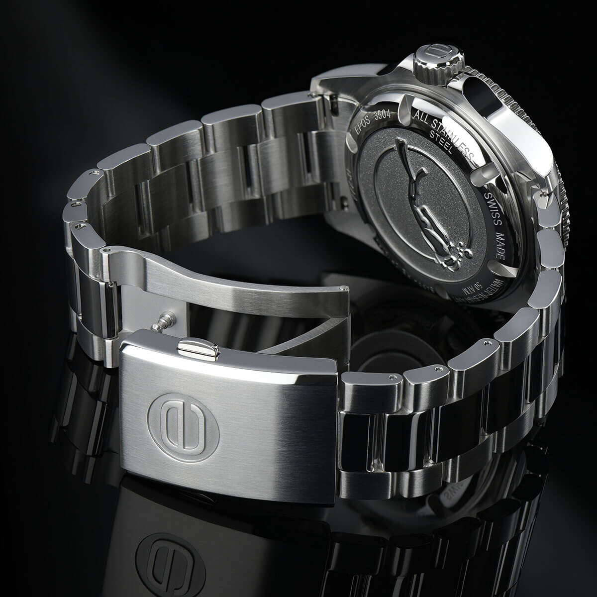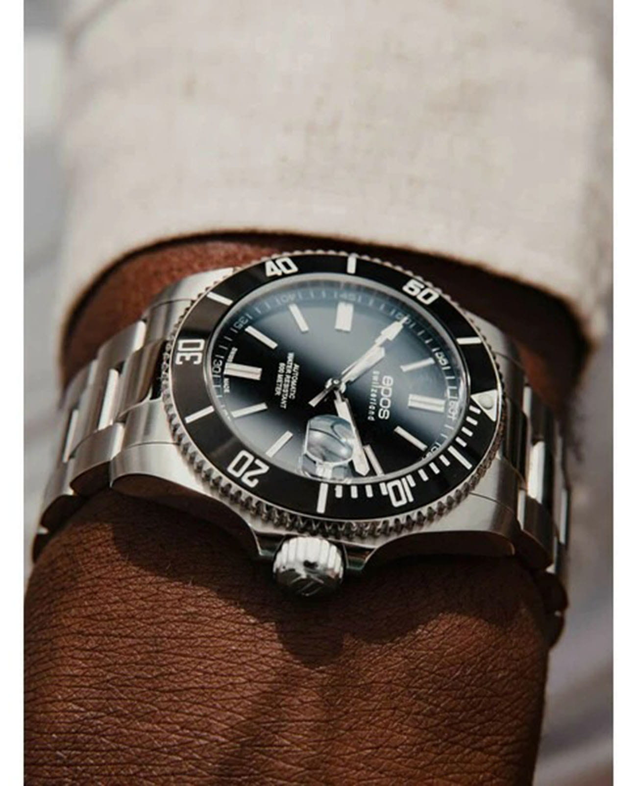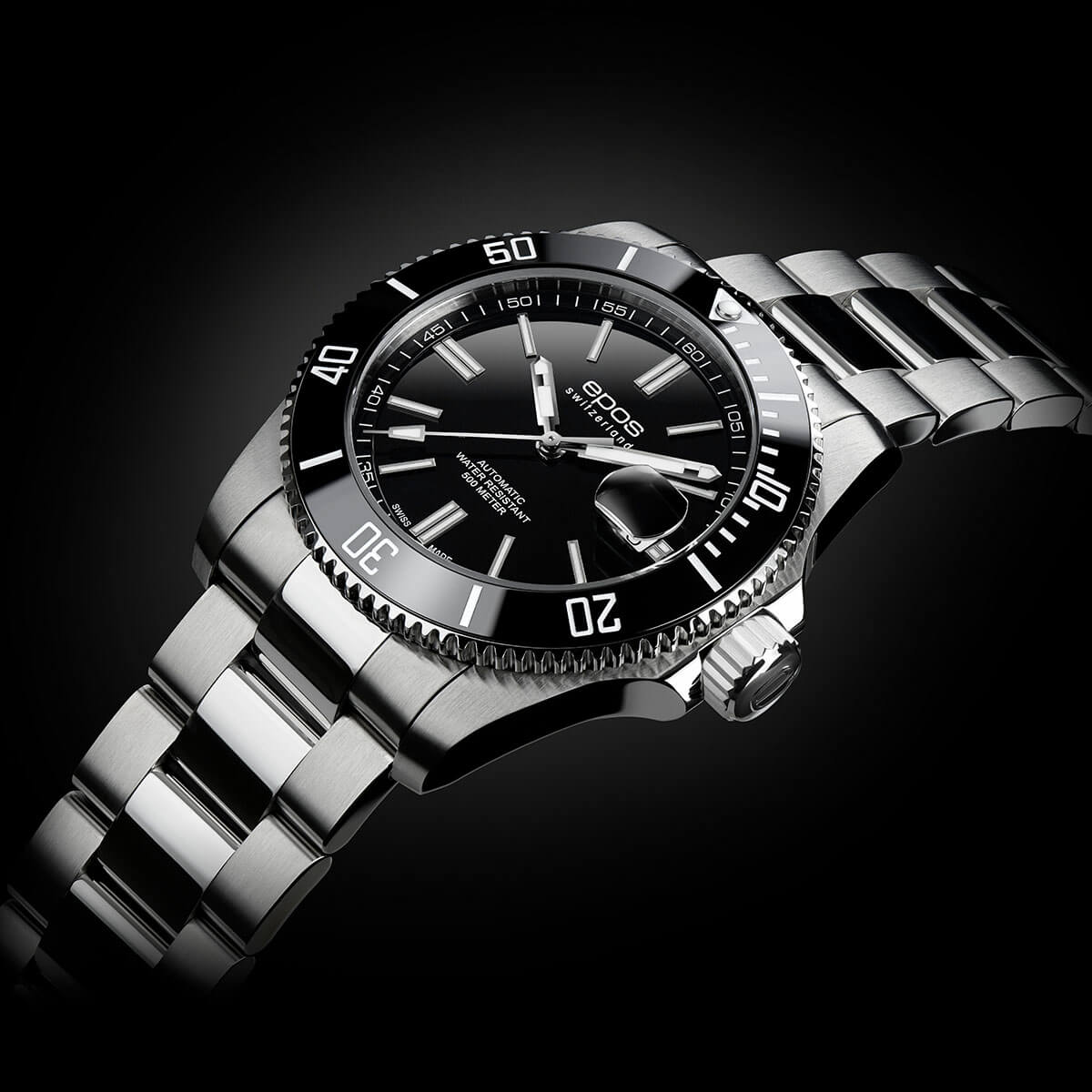 Мужские швейцарские механические часы с автоподзаводом Epos  Diver 3504.131.20.15.30. Сапфировое стеклоСапфировое стеклоПрочный и надёжный материал из кристалла сапфира синтетического происхождения, характеризующийся особой твёрдостью и устойчивостью к царапинам и повреждениям. устойчивое к появлению царапин, обладающее высокой прозрачностью. Корпус и браслет часов изготовлен из нержавеющей стали. Врачающийся в одном направлении безельБезельВнешний ободок, закрепляющий стекло. В спортивных часах так называется поворотное кольцо с делениями на циферблате, выполняет роль таймера – замеряет отрезки времени на шкале. Неподвижный безель – элемент декора. Однонаправленно вращающийся безель на дайверских часах позволяет фиксировать моменты погружения и выныривания на поверхность. из нержавеющей стали с PVDPVDУльтратонкое покрытие наносится в технике вакуумного напыления, сочетает в себе нитрид титана особой прочности со слоем золота или оксида хрома. Несёт в себе декоративную или защитную функцию. покрытием. Лупа над окошком даты. Прозрачная задняя крышка. Завинчивающаяся заводная головка. Класс водозащиты: 500 метров, позволит плавать, нырять и заниматься другими водными видами спорта. Стальной браслет на раскладной застёжкеРаскладная застёжкаТакой тип застёжки используется только на браслетах из металла. Она никогда не раскрывается полностью, происходит разделение на 2 и более частей. Раскладывающая застёжка снизит вероятность потери часов к минимуму..
