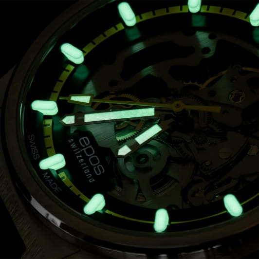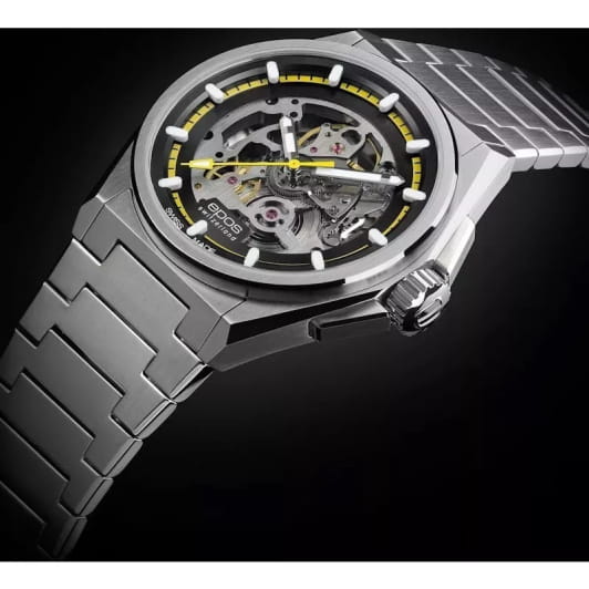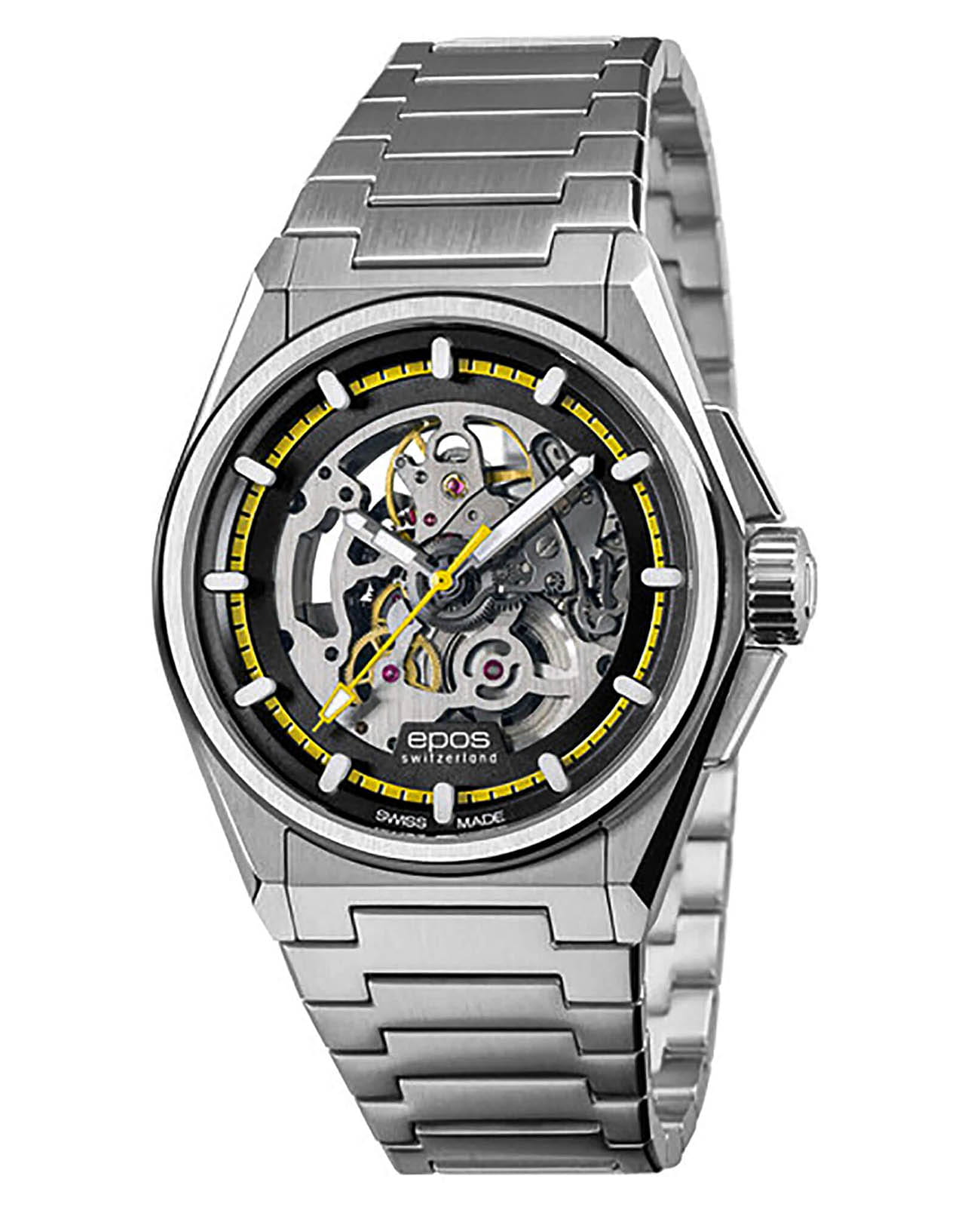 Мужские механические часы с автоподзаводом Epos из коллекции Sportive — это стильный и технологичный аксессуар с швейцарским качеством. Корпус диаметром 41 мм и толщиной 11 мм выполнен из нержавеющей стали 316L. Циферблат чёрного цвета с жёлтыми и серыми акцентами частично скелетонизирован, что позволяет наблюдать за работой механизма. Циферблат защищён сапфировым стекломСапфировое стеклоПрочный и надёжный материал из кристалла сапфира синтетического происхождения, характеризующийся особой твёрдостью и устойчивостью к царапинам и повреждениям.. Механизм — швейцарский калибр Sellita SW200 с запасом хода 38 часов. Завинчивающаяся коронка обеспечивает дополнительную защиту. Прозрачная задняя крышка открывает вид на декорированный механизм. Часы оснащены стальным браслетом на раскладной застёжкеРаскладная застёжкаТакой тип застёжки используется только на браслетах из металла. Она никогда не раскрывается полностью, происходит разделение на 2 и более частей. Раскладывающая застёжка снизит вероятность потери часов к минимуму.. Водонепроницаемость 100 м позволяет использовать часы для плавания и повседневного ношения. Гарантия — 24 месяца. Универсальный выбор для ценителя механики и современного дизайна.