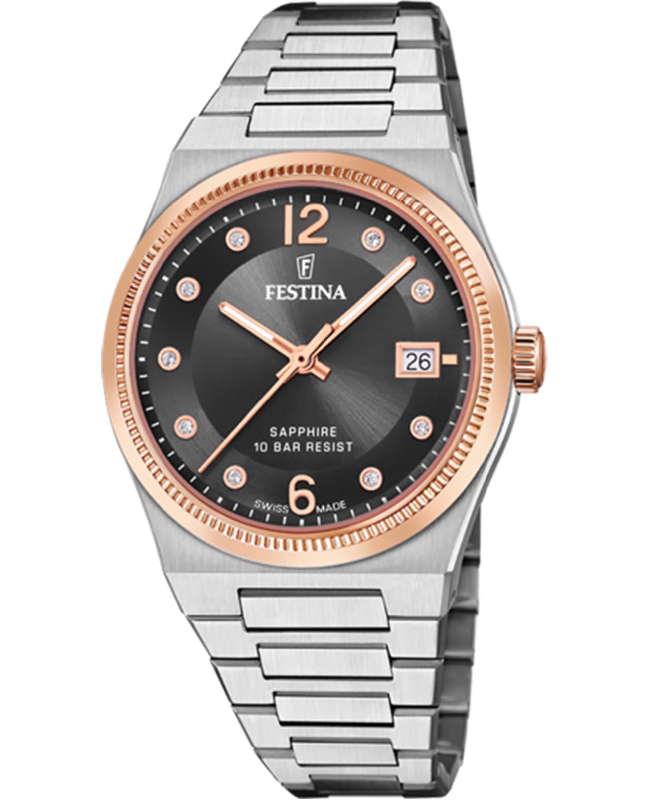 Женские наручные часы Festina F20037/3 с кварцевым механизмом высокой точности. Кварцевый механизм с высокой точностью. Сапфировое стеклоСапфировое стеклоПрочный и надёжный материал из кристалла сапфира синтетического происхождения, характеризующийся особой твёрдостью и устойчивостью к царапинам и повреждениям. устойчивое к появлению царапин, обладающее высокой прозрачностью. Класс водозащиты: 100 метров, позволит плавать, нырять и заниматься другими водными видами спорта. Корпус часов изготовлен из нержавеющей стали. Стальной браслет застёжке-бабочке. Стрелки с люминесцентным покрытиемЛюминесцентное покрытиеПозволяет считывать показания времени в темноте. Производители наносят на стрелки, часовые индексы, безель или поверхность циферблата светонакопительный состав, дающий холодное свечение.. Окошко даты находится в положении 3 часа. БезельБезельВнешний ободок, закрепляющий стекло. В спортивных часах так называется поворотное кольцо с делениями на циферблате, выполняет роль таймера – замеряет отрезки времени на шкале. Неподвижный безель – элемент декора. Однонаправленно вращающийся безель на дайверских часах позволяет фиксировать моменты погружения и выныривания на поверхность. с IP-покрытиемIP-покрытиеМетод ионного напыления. Демонстрирует повышенную устойчивость к истиранию, окислению и химическим веществам. Под воздействием высокого давления и температуры около 1500°C молекулы металла надёжно соединяются с частицами корпуса часов.. Циферблат инкрустирован кристаллами.
