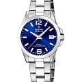 Женские кварцевые часы Festina F20049/5 из коллекции Swiss Made — это элегантный аксессуар, сочетающий швейцарское качество и классический стиль. Корпус диаметром 30 мм выполнен из нержавеющей стали серебряного цвета. Циферблат синего цвета дополнен окошком даты в положении 3 часов. Циферблат защищён сапфировым стекломСапфировое стеклоПрочный и надёжный материал из кристалла сапфира синтетического происхождения, характеризующийся особой твёрдостью и устойчивостью к царапинам и повреждениям.. Стрелки и метки с люминесцентным покрытиемЛюминесцентное покрытиеПозволяет считывать показания времени в темноте. Производители наносят на стрелки, часовые индексы, безель или поверхность циферблата светонакопительный состав, дающий холодное свечение., обеспечивающим хорошую читаемость в темноте. Заводная головка — вытягивающегося типа, задняя крышка — завинчивающаяся, что обеспечивает повышенную надёжность. Часы оснащены стальным браслетом на раскладной застёжкеРаскладная застёжкаТакой тип застёжки используется только на браслетах из металла. Она никогда не раскрывается полностью, происходит разделение на 2 и более частей. Раскладывающая застёжка снизит вероятность потери часов к минимуму. с кнопками. Механизм — швейцарский кварцевый калибр Ronda 785 с 42-месячным сроком службы батареи. Водонепроницаемость 100 м позволяет использовать часы для плавания. Идеальный выбор для тех, кто ценит точность, стиль и швейцарское мастерство.