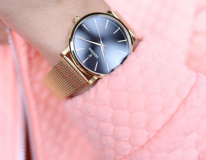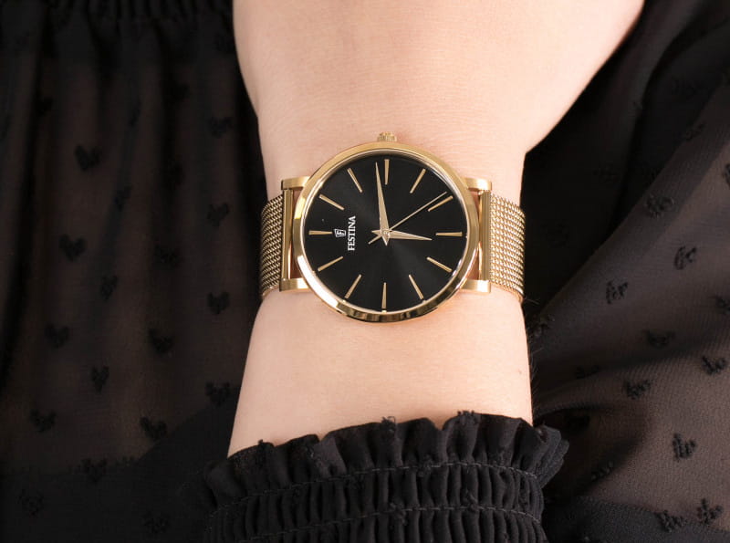 Женские кварцевые часы с минеральным стекломМинеральное стеклоМинеральное стекло представляет собой искусственно выращенный минерал кварца. Такое стекло отличается особой устойчивостью к повреждениям и царапинам. Уступает по некоторым качествам сапфировому стеклу. Festina Boyfriend F20476/2, кварцевый механизм с высокой точностью. Класс водозащиты: 30 метров, позволит защитить корпус от случайных брызг или капель дождя. Корпус часов изготовлен из стали с PVD-покрытиемPVDУльтратонкое покрытие наносится в технике вакуумного напыления, сочетает в себе нитрид титана особой прочности со слоем золота или оксида хрома. Несёт в себе декоративную или защитную функцию.. Стальной браслет миланского плетения на раскладной застёжкеРаскладная застёжкаТакой тип застёжки используется только на браслетах из металла. Она никогда не раскрывается полностью, происходит разделение на 2 и более частей. Раскладывающая застёжка снизит вероятность потери часов к минимуму. с PVD-покрытиемPVDУльтратонкое покрытие наносится в технике вакуумного напыления, сочетает в себе нитрид титана особой прочности со слоем золота или оксида хрома. Несёт в себе декоративную или защитную функцию..