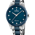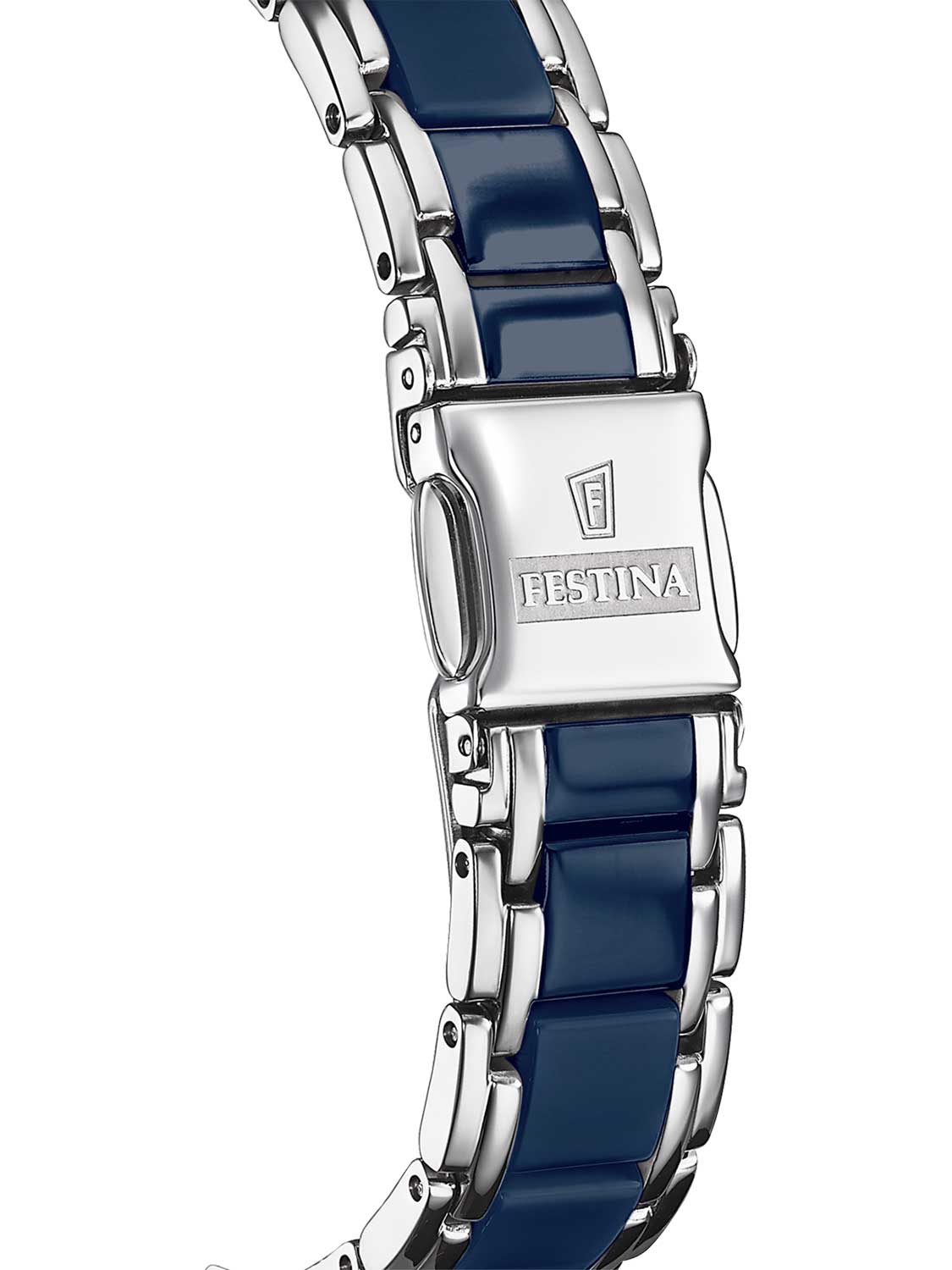 Яркий стиль и функциональность этих часов придутся по душе активной девушке. Кварцевый механизм с высокой точностью. Минеральное стеклоМинеральное стеклоМинеральное стекло представляет собой искусственно выращенный минерал кварца. Такое стекло отличается особой устойчивостью к повреждениям и царапинам. Уступает по некоторым качествам сапфировому стеклу. устойчивое к появлению царапин, обладающее высокой прозрачностью. Керамический неподвижный безельБезельВнешний ободок, закрепляющий стекло. В спортивных часах так называется поворотное кольцо с делениями на циферблате, выполняет роль таймера – замеряет отрезки времени на шкале. Неподвижный безель – элемент декора. Однонаправленно вращающийся безель на дайверских часах позволяет фиксировать моменты погружения и выныривания на поверхность.. Циферблат украшен кристаллами. Класс водозащиты: 50 метров, позволит защитить корпус от случайных брызг или капель дождя. Корпус часов изготовлен из нержавеющей стали. Браслет с керамическими вставками и с раскладной застёжкойРаскладная застёжкаТакой тип застёжки используется только на браслетах из металла. Она никогда не раскрывается полностью, происходит разделение на 2 и более частей. Раскладывающая застёжка снизит вероятность потери часов к минимуму..