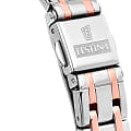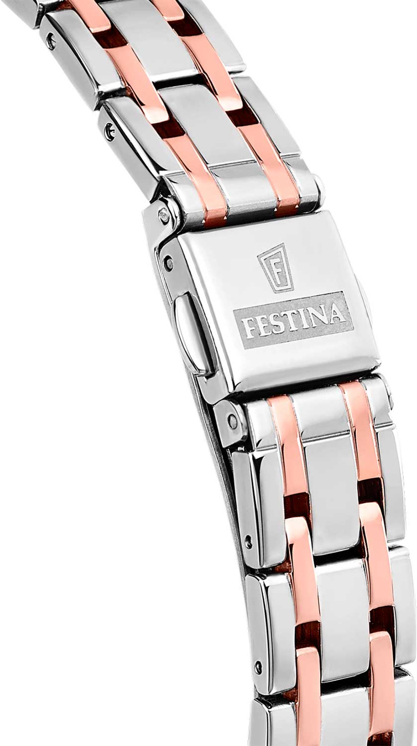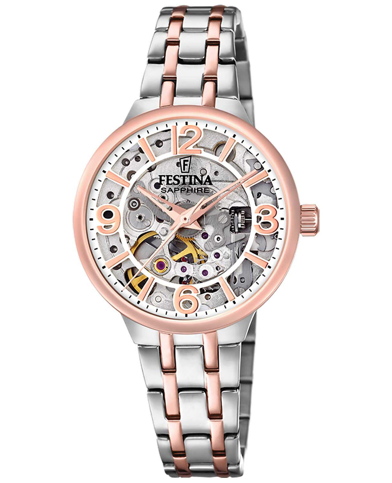 Женские механические часы-скелетоны Festina Automatic F20615/1, механический механизм (автоматический калибр) с высокой точностью. Сапфировое стеклоСапфировое стеклоПрочный и надёжный материал из кристалла сапфира синтетического происхождения, характеризующийся особой твёрдостью и устойчивостью к царапинам и повреждениям. устойчивое к появлению царапин, обладающее высокой прозрачностью. Класс водозащиты: 50 метров, позволит защитить корпус от случайных брызг или капель дождя. Корпус часов изготовлен из стали с PVD-покрытиемPVDУльтратонкое покрытие наносится в технике вакуумного напыления, сочетает в себе нитрид титана особой прочности со слоем золота или оксида хрома. Несёт в себе декоративную или защитную функцию.. Стальной браслет на раскладной застёжкеРаскладная застёжкаТакой тип застёжки используется только на браслетах из металла. Она никогда не раскрывается полностью, происходит разделение на 2 и более частей. Раскладывающая застёжка снизит вероятность потери часов к минимуму. с PVD-покрытиемPVDУльтратонкое покрытие наносится в технике вакуумного напыления, сочетает в себе нитрид титана особой прочности со слоем золота или оксида хрома. Несёт в себе декоративную или защитную функцию.. БезельБезельВнешний ободок, закрепляющий стекло. В спортивных часах так называется поворотное кольцо с делениями на циферблате, выполняет роль таймера – замеряет отрезки времени на шкале. Неподвижный безель – элемент декора. Однонаправленно вращающийся безель на дайверских часах позволяет фиксировать моменты погружения и выныривания на поверхность. с PVD-покрытиемPVDУльтратонкое покрытие наносится в технике вакуумного напыления, сочетает в себе нитрид титана особой прочности со слоем золота или оксида хрома. Несёт в себе декоративную или защитную функцию.. Циферблат с метками в виде штрихов и арабских цифр. Рифленая заводная головка.