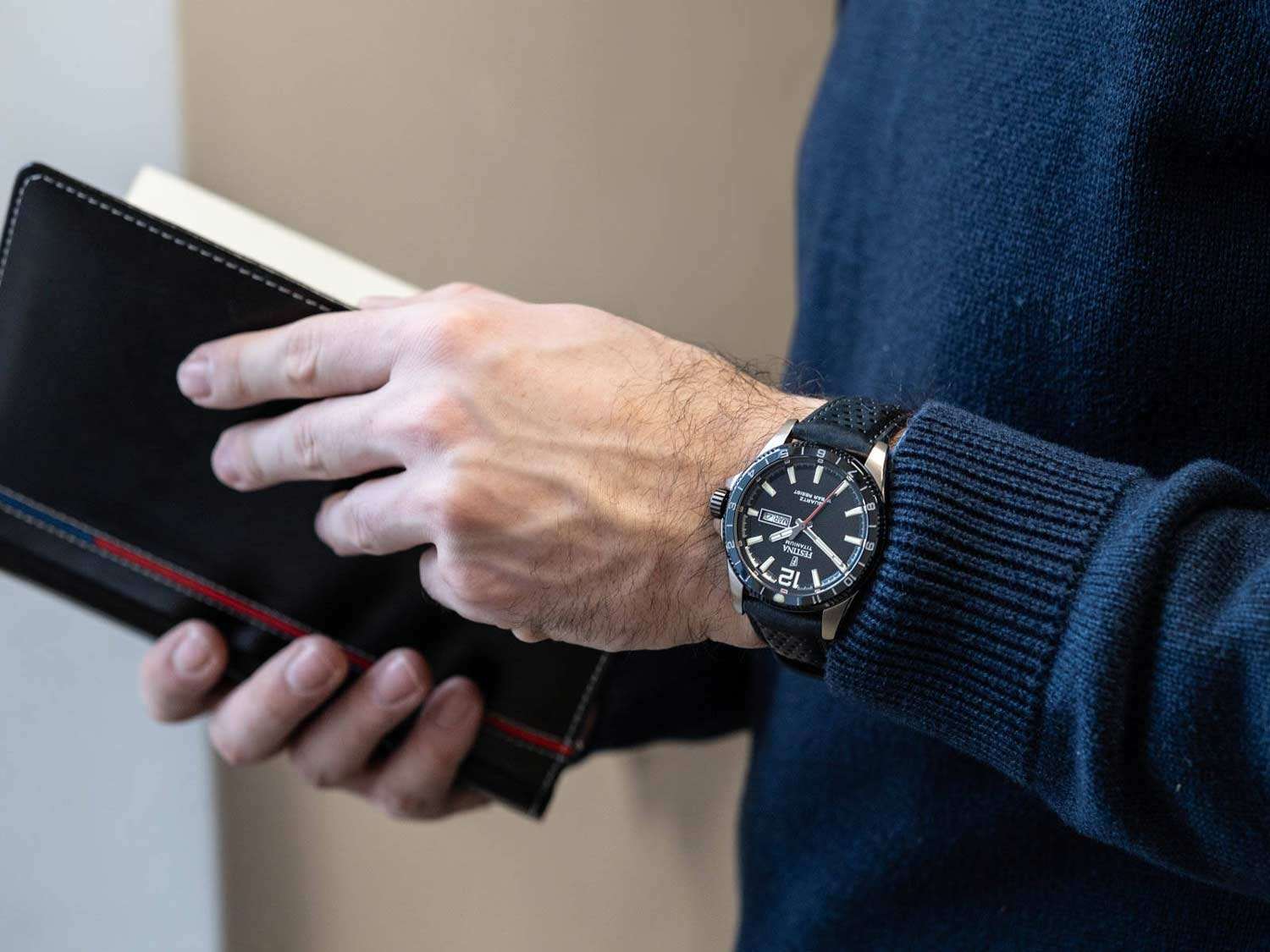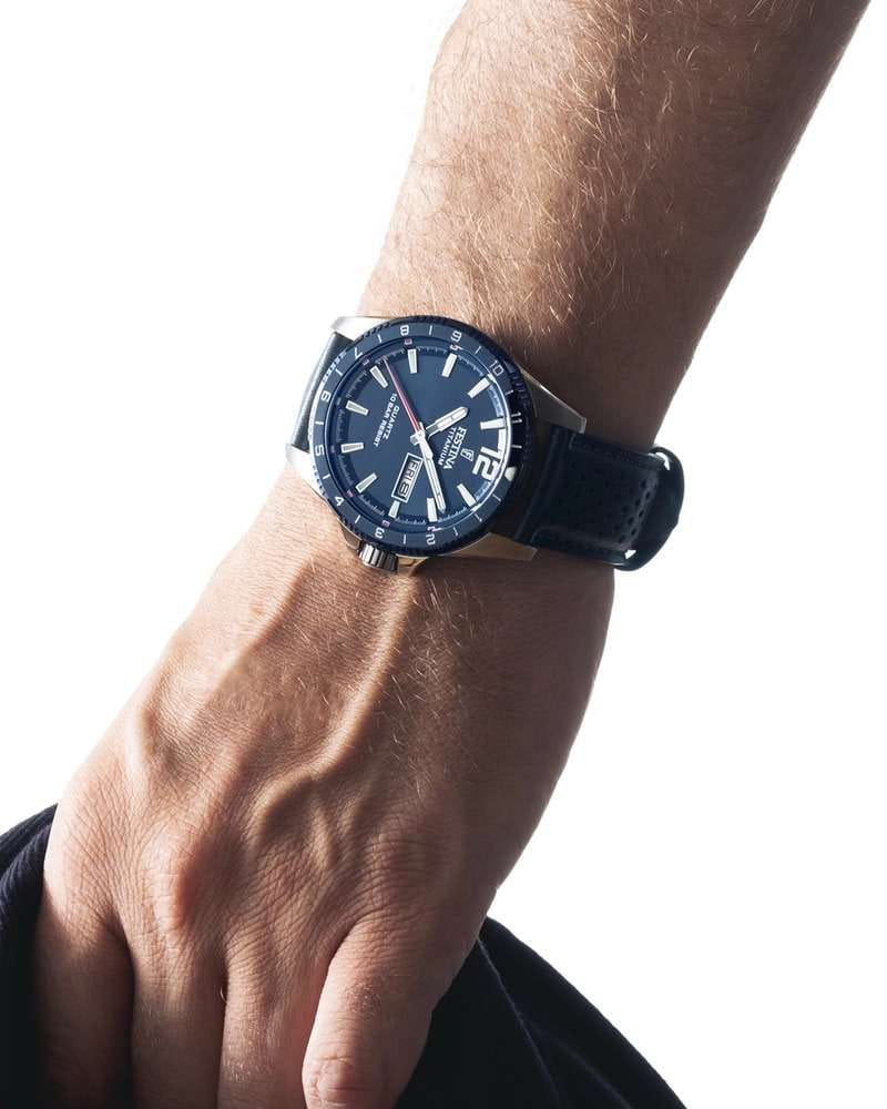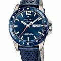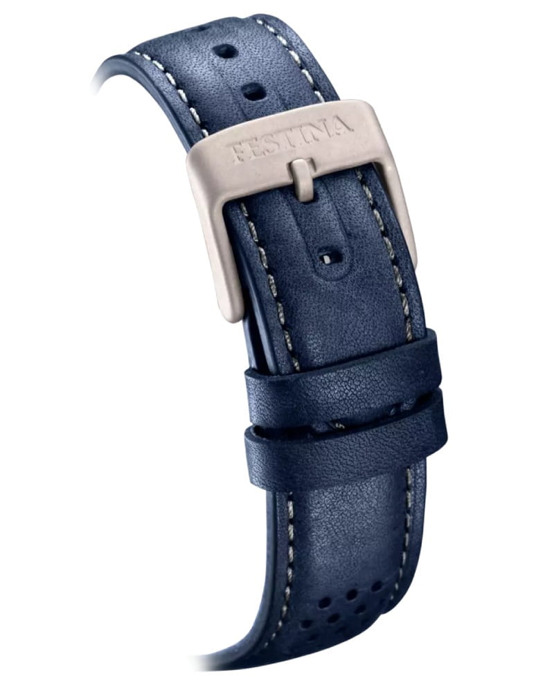 Титановые наручные часы Festina Titanium F20699/2 имеют кварцевый механизм с высокой точностью. Минеральное стеклоМинеральное стеклоМинеральное стекло представляет собой искусственно выращенный минерал кварца. Такое стекло отличается особой устойчивостью к повреждениям и царапинам. Уступает по некоторым качествам сапфировому стеклу. устойчивое к появлению царапин, обладающее высокой прозрачностью, защищает синий циферблат. БезельБезельВнешний ободок, закрепляющий стекло. В спортивных часах так называется поворотное кольцо с делениями на циферблате, выполняет роль таймера – замеряет отрезки времени на шкале. Неподвижный безель – элемент декора. Однонаправленно вращающийся безель на дайверских часах позволяет фиксировать моменты погружения и выныривания на поверхность. с часовыми метками выполнен из нержавеющей стали с синим PVDPVDУльтратонкое покрытие наносится в технике вакуумного напыления, сочетает в себе нитрид титана особой прочности со слоем золота или оксида хрома. Несёт в себе декоративную или защитную функцию. покрытием. Класс водозащиты: 100 метров, позволит плавать, нырять и заниматься другими водными видами спорта. Корпус часов изготовлен из титана, перфорированный ремешок синего цвета из натуральной кожи с классической застежкой. Люминесцентное покрытиеЛюминесцентное покрытиеПозволяет считывать показания времени в темноте. Производители наносят на стрелки, часовые индексы, безель или поверхность циферблата светонакопительный состав, дающий холодное свечение. на стрелках и метках обеспечивает отличную видимость в темноте, а окошко даты с днем недели, расположенное в позиции 3 часа, добавляет практичности.