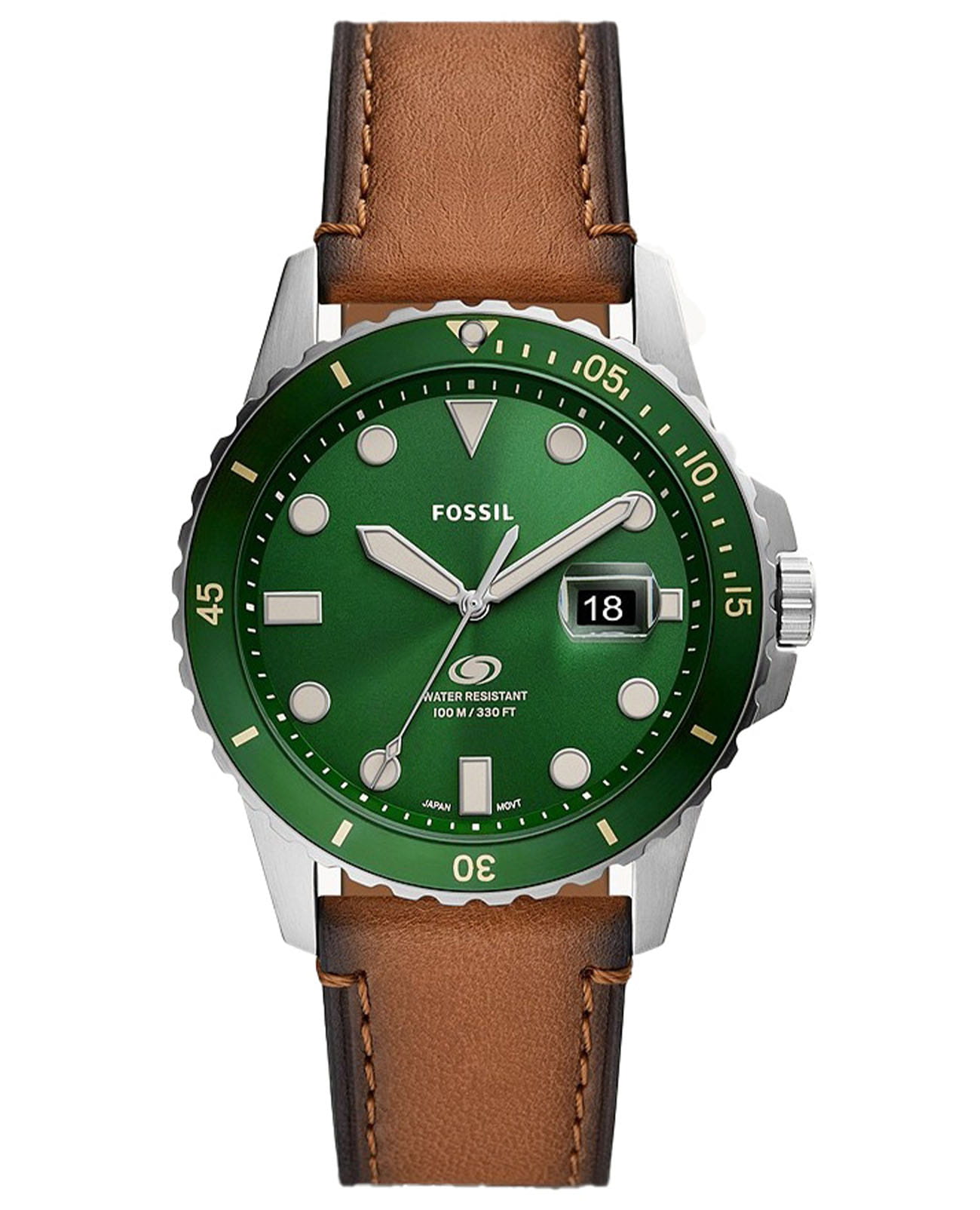 Мужские наручные часы Fossil Blue FS5946, кварцевый механизм с высокой точностью. Класс водозащиты: 100 метров, позволит плавать, нырять и заниматься другими водными видами спорта. Корпус часов изготовлен из стали с IP-покрытиемIP-покрытиеМетод ионного напыления. Демонстрирует повышенную устойчивость к истиранию, окислению и химическим веществам. Под воздействием высокого давления и температуры около 1500°C молекулы металла надёжно соединяются с частицами корпуса часов. зеленого цвета. Метки в виде точек на циферблате и окошко даты находится в положении 3 часа. Ремешок из экокожи коричневого цвета с классической застежкой.