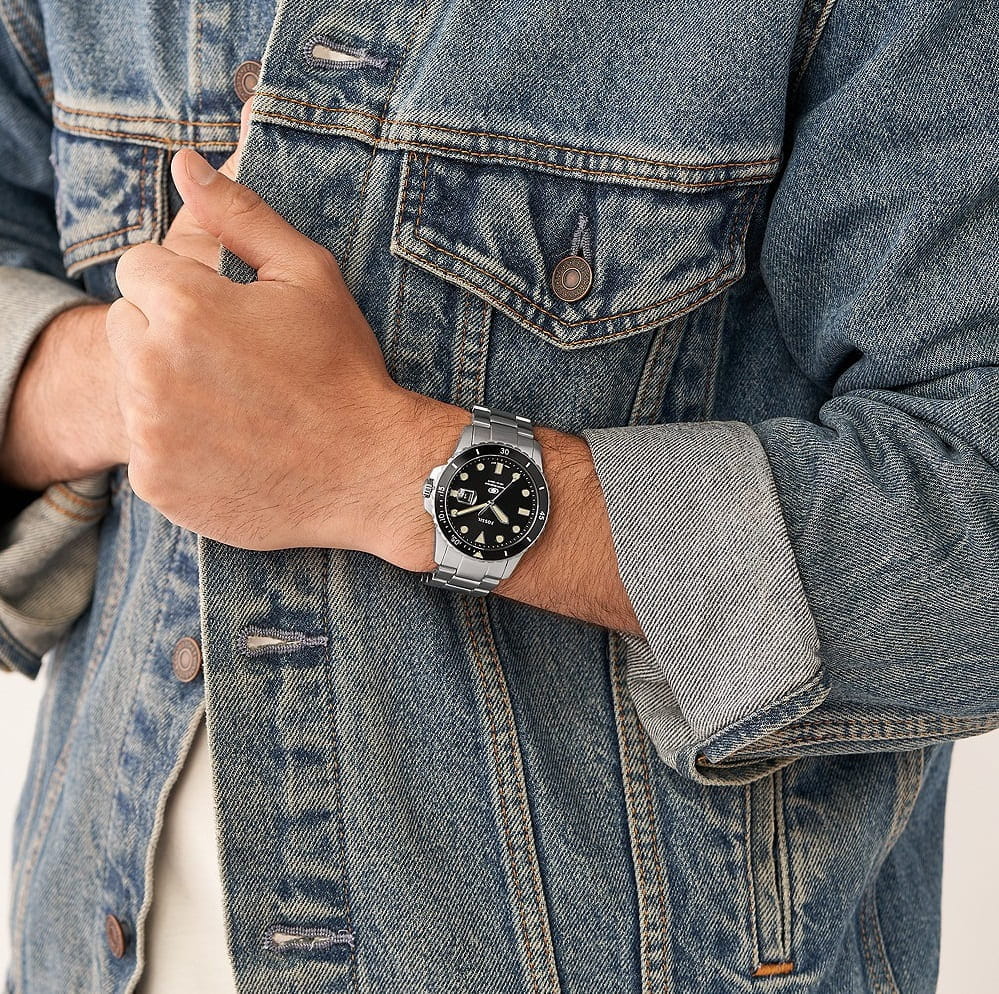 Мужские наручные часы на стальном браслете Fossil Blue FS5951, кварцевый механизм с высокой точностью. Класс водозащиты: 100 метров, позволит плавать, нырять и заниматься другими водными видами спорта. Корпус часов изготовлен из стали с IP-покрытиемIP-покрытиеМетод ионного напыления. Демонстрирует повышенную устойчивость к истиранию, окислению и химическим веществам. Под воздействием высокого давления и температуры около 1500°C молекулы металла надёжно соединяются с частицами корпуса часов. черного цвета. Метки в виде точек на циферблате и окошко даты находится в положении 3 часа. Ремешок из стали серебристого цвета на раскладывающейся застёжкеРаскладная застёжкаТакой тип застёжки используется только на браслетах из металла. Она никогда не раскрывается полностью, происходит разделение на 2 и более частей. Раскладывающая застёжка снизит вероятность потери часов к минимуму..