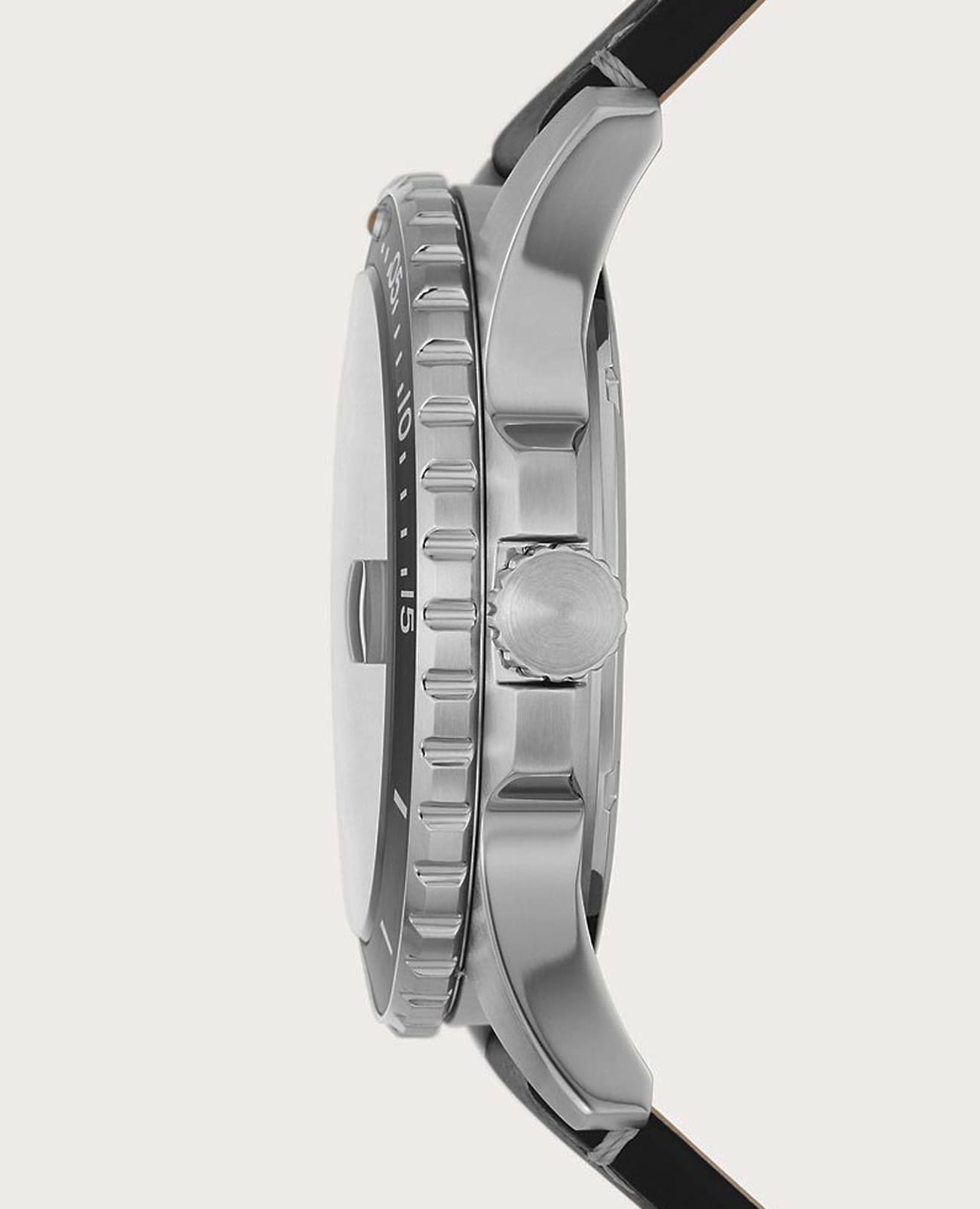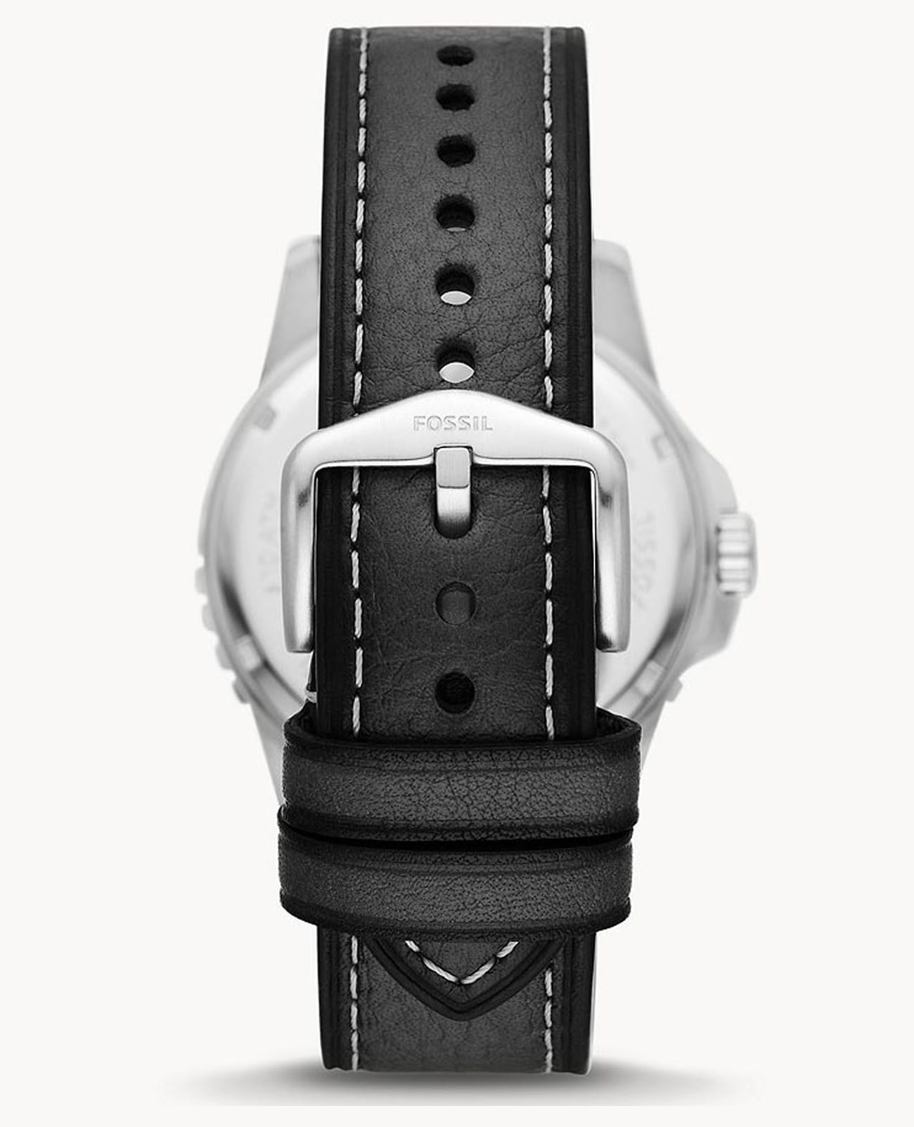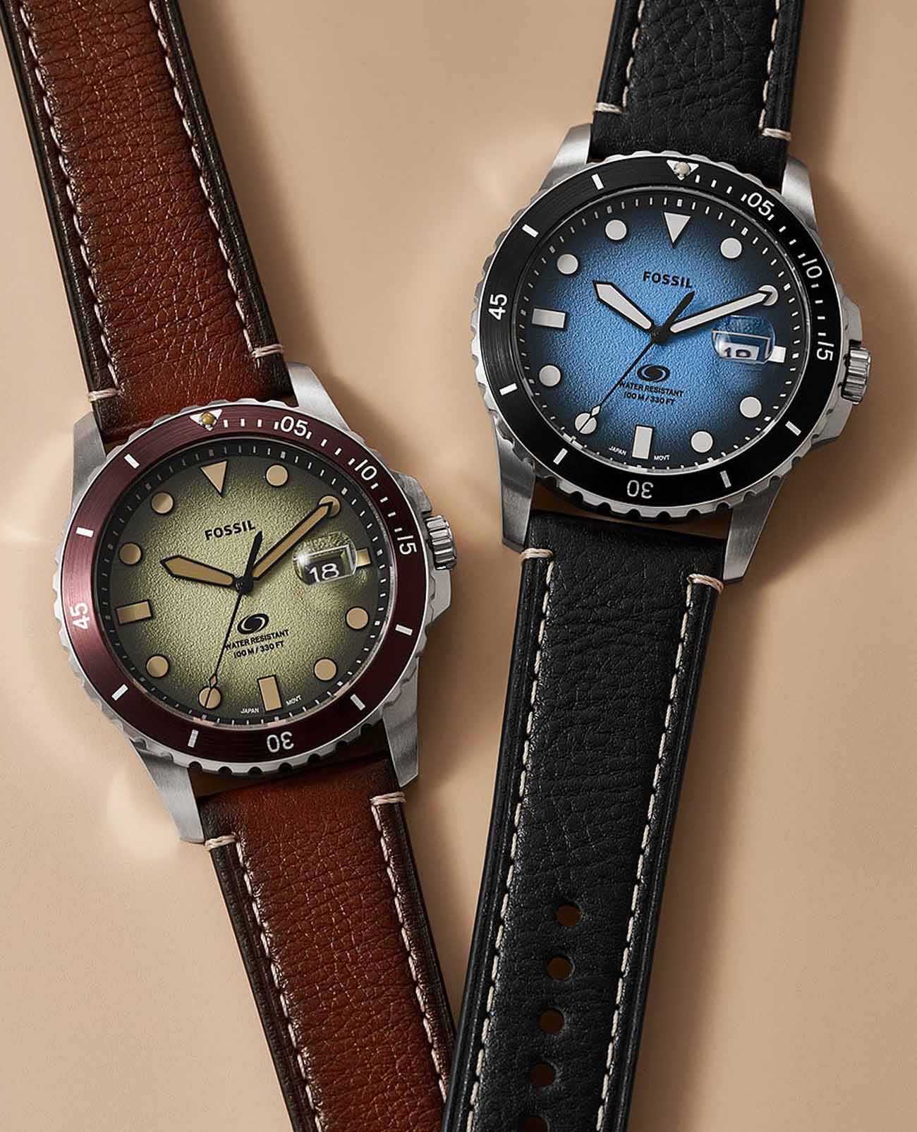Мужские наручные часы с минеральным стекломМинеральное стеклоМинеральное стекло представляет собой искусственно выращенный минерал кварца. Такое стекло отличается особой устойчивостью к повреждениям и царапинам. Уступает по некоторым качествам сапфировому стеклу. Fossil Blue FS5960, кварцевый механизм с высокой точностью. Мужские часы в дайверском стиле. Корпус часов изготовлен из стали. БезельБезельВнешний ободок, закрепляющий стекло. В спортивных часах так называется поворотное кольцо с делениями на циферблате, выполняет роль таймера – замеряет отрезки времени на шкале. Неподвижный безель – элемент декора. Однонаправленно вращающийся безель на дайверских часах позволяет фиксировать моменты погружения и выныривания на поверхность. с IP-покрытиемIP-покрытиеМетод ионного напыления. Демонстрирует повышенную устойчивость к истиранию, окислению и химическим веществам. Под воздействием высокого давления и температуры около 1500°C молекулы металла надёжно соединяются с частицами корпуса часов.. Рифленый безель с минутной шкалой. Градиентный циферблат. Мечевидные стрелки. Окошко даты с увеличительным стеклом находится в положении 3 часа. Класс водозащиты: 100 метров, позволит плавать, нырять и заниматься другими водными видами спорта. Ремешок из экокожи на стандартной застёжке.
