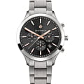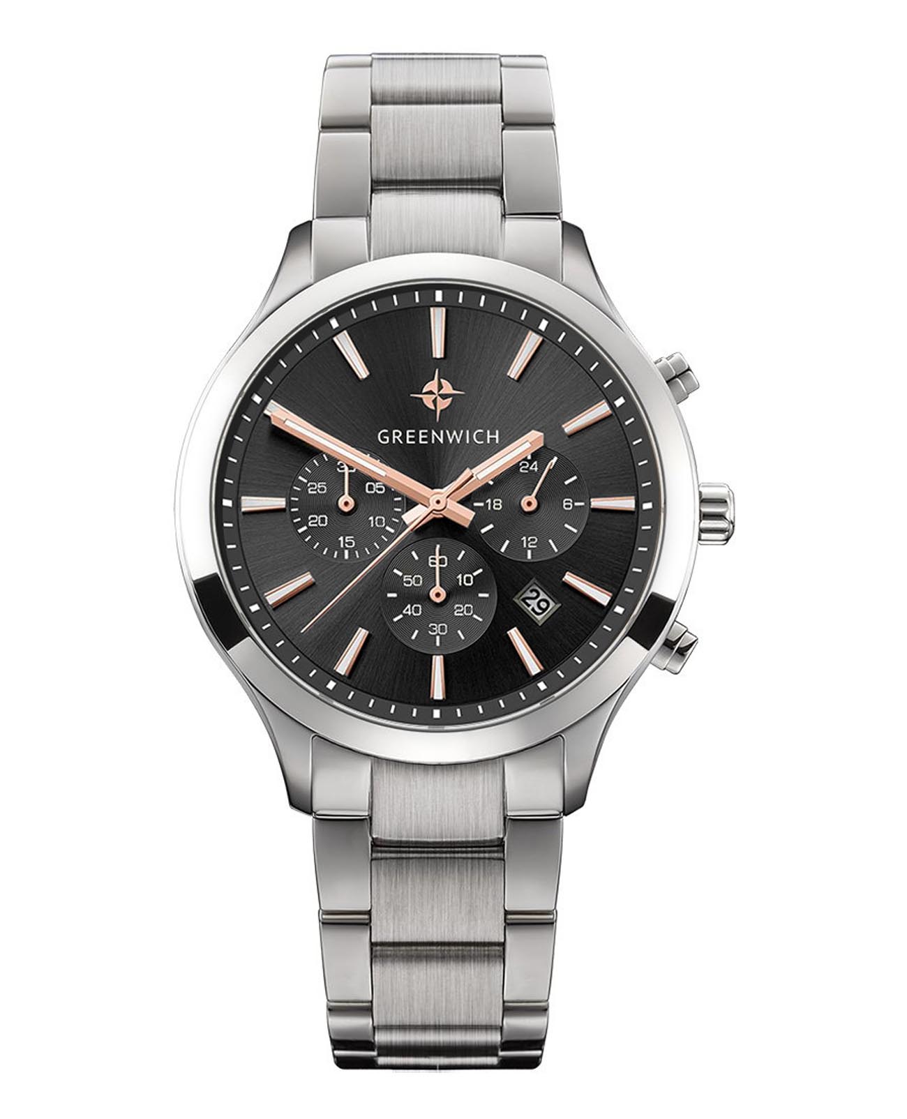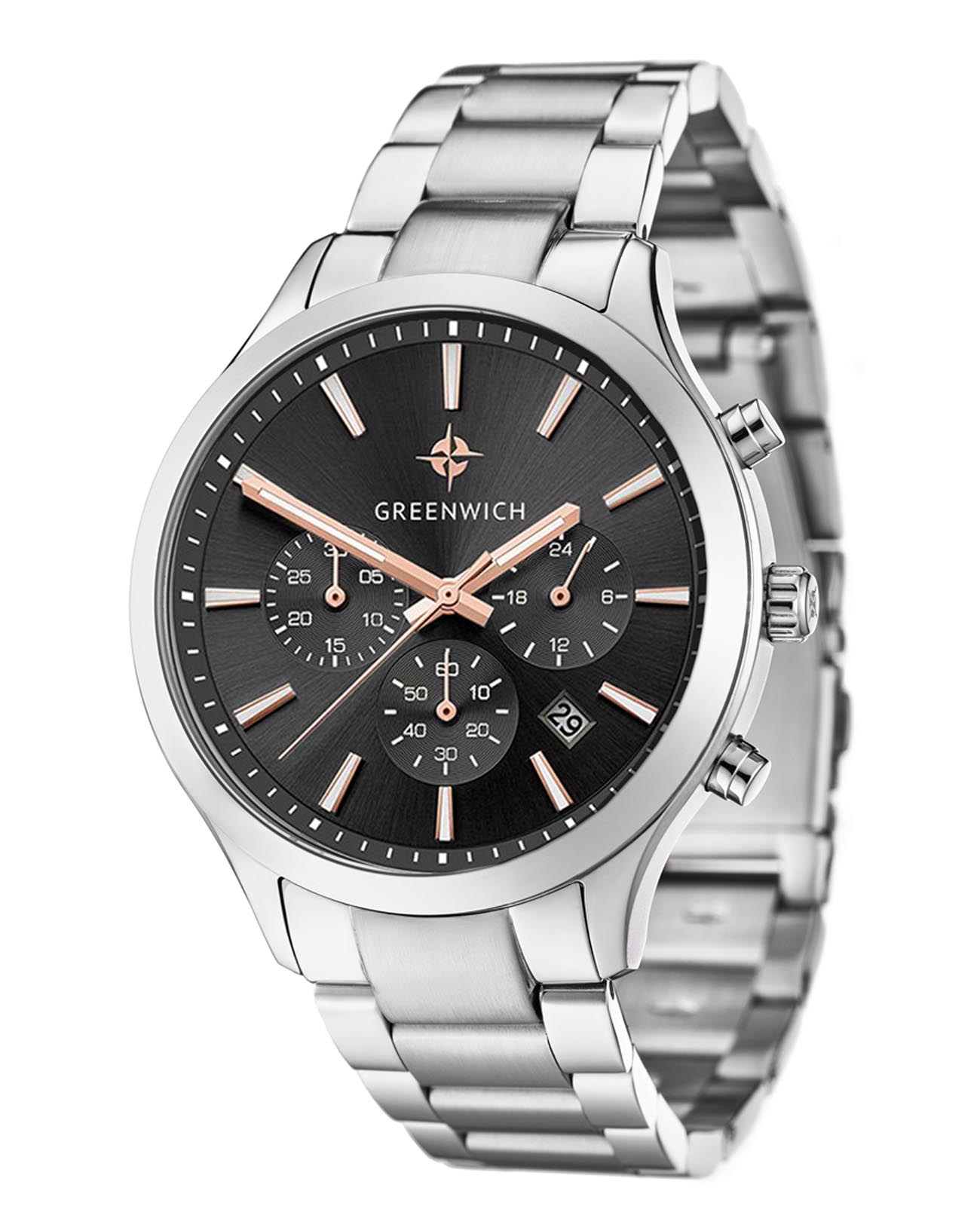Мужские часы-хронографХронографФункция позволяет измерять отрезки времени с особой точностью: часы, минуты, секунды. Верным признаком хронографа является наличие на циферблате 3 дополнительных окошек-счётчиков.Greenwich Skipper GW 043.10.35, кварцевый механизм с высокой точностью. Минеральное стеклоМинеральное стеклоМинеральное стекло представляет собой искусственно выращенный минерал кварца. Такое стекло отличается особой устойчивостью к повреждениям и царапинам. Уступает по некоторым качествам сапфировому стеклу. устойчивое к появлению царапин, обладающее высокой прозрачностью. Корпус изготовлен из нержавеющей стали. В часах установлен надежный японский механизм с функциями: часы, минуты, секунды, дата, 24-х часовой индикатор. Окошко даты находится в положении между 4 и 5 часами. Стрелки с люминесцентным покрытиемЛюминесцентное покрытиеПозволяет считывать показания времени в темноте. Производители наносят на стрелки, часовые индексы, безель или поверхность циферблата светонакопительный состав, дающий холодное свечение.. Класс водозащиты: 100 метров, позволит плавать, нырять и заниматься другими водными видами спорта. Стальной браслет на раскладной застёжкеРаскладная застёжкаТакой тип застёжки используется только на браслетах из металла. Она никогда не раскрывается полностью, происходит разделение на 2 и более частей. Раскладывающая застёжка снизит вероятность потери часов к минимуму..