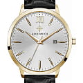 Мужские английские часы Greenwich GW 061.21.13 с минеральным стекломМинеральное стеклоМинеральное стекло представляет собой искусственно выращенный минерал кварца. Такое стекло отличается особой устойчивостью к повреждениям и царапинам. Уступает по некоторым качествам сапфировому стеклу.. Классические мужские часы серии Brig прекрасно подойдут как под костюм, так и под одежду направления casual. В часах установлен точный японский механизм Miyota. Корпус часов изготовлен из нержавеющей гипоаллергенной стали с PVDPVDУльтратонкое покрытие наносится в технике вакуумного напыления, сочетает в себе нитрид титана особой прочности со слоем золота или оксида хрома. Несёт в себе декоративную или защитную функцию. покрытием из желтого золота: он элегантно смотрится на руке и не создает неудобств при контакте с одеждой с длинным рукавом. Размер корпуса 41 мм. Полировка на циферблате черного цвета выполнена в виде солнечных лучей. Индексы часов изготовлены вручную и закреплены на двух штифтах. Выпуклая форма рисок создает эффект игры солнечных бликов. Объемные часовая и минутная стрелки имеют мечеобразную форму. В модели представлена дополнительная функция – дата. Ее окошко расположено на уровне трех часов. Циферблат надежно защищен минеральным стеклом. На часах установлен черный ремешок из натуральной кожи. Логотип марки – изображение «розы ветров», символа удачи и новых открытий – расположен на циферблате, заводной головке и внутренней части ремешка. Задняя крышка часов украшена изображениями логотипа и корабля, который является символом марки Greenwich.