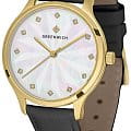Женские английские часы с минеральным стекломМинеральное стеклоМинеральное стекло представляет собой искусственно выращенный минерал кварца. Такое стекло отличается особой устойчивостью к повреждениям и царапинам. Уступает по некоторым качествам сапфировому стеклу. Greenwich Callisto GW 341.21.53, кварцевый механизм с высокой точностью. Класс водозащиты: 50 метров, позволит защитить корпус от случайных брызг или капель дождя. Корпус часов изготовлен из стали с PVD-покрытиемPVDУльтратонкое покрытие наносится в технике вакуумного напыления, сочетает в себе нитрид титана особой прочности со слоем золота или оксида хрома. Несёт в себе декоративную или защитную функцию.. Кожаный ремешок на стандартной застёжке. Циферблат выполнен из натурального перламутра черного цвета с эффектной гравировкой: она напоминает звезду, сияющую на ночном небе. Фианиты надежно закреплены в кастах. Кварцевый механизм Miyota отвечает за точный ход стрелок: часовой, минутной и секундной.
