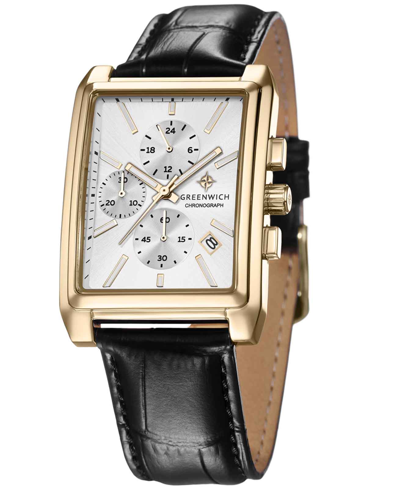 Мужские часы-хронографХронографФункция позволяет измерять отрезки времени с особой точностью: часы, минуты, секунды. Верным признаком хронографа является наличие на циферблате 3 дополнительных окошек-счётчиков. Greenwich Galeon Chrono GW 553.21.13, кварцевый механизм с минеральным стекломМинеральное стеклоМинеральное стекло представляет собой искусственно выращенный минерал кварца. Такое стекло отличается особой устойчивостью к повреждениям и царапинам. Уступает по некоторым качествам сапфировому стеклу.. Корпус из нержавеющей стали с PVD-покрытиемPVDУльтратонкое покрытие наносится в технике вакуумного напыления, сочетает в себе нитрид титана особой прочности со слоем золота или оксида хрома. Несёт в себе декоративную или защитную функцию.. Стрелки и метки с люминесцентным покрытиемЛюминесцентное покрытиеПозволяет считывать показания времени в темноте. Производители наносят на стрелки, часовые индексы, безель или поверхность циферблата светонакопительный состав, дающий холодное свечение.. Окошко даты находится в положении между 4 и 5 часами. Класс водозащиты: 50 метров, позволит защитить корпус от случайных брызг или капель дождя. Кожаный ремешок на стандартной застежке.